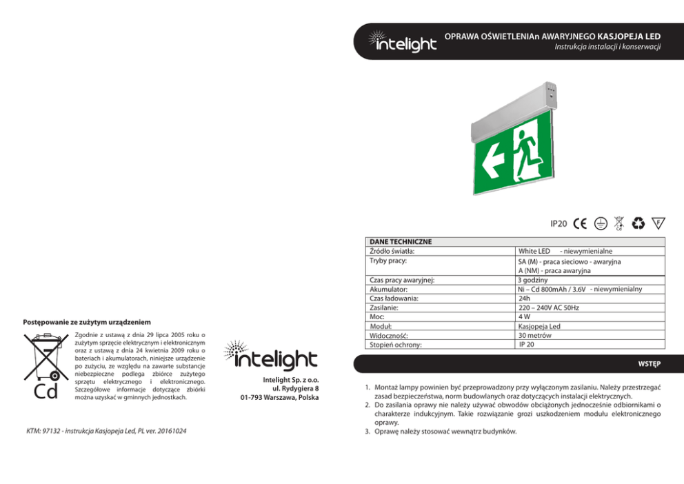 OPRAWA OŚWIETLENIAn AWARYJNEGO KASJOPEJA LED Instrukcja instalacji i konserwacji IP20 DANE TECHNICZNE Źródło światła: Tryby pracy: Czas pracy awaryjnej: Akumulator: Czas ładowania: Zasilanie: Moc: Moduł: Widoczność: Stopień ochrony: Postępowanie ze zużytym urządzeniem Zgodnie z ustawą z dnia 29 lipca 2005 roku o zużytym sprzęcie elektrycznym i elektronicznym oraz z ustawą z dnia 24 kwietnia 2009 roku o bateriach i akumulatorach, niniejsze urządzenie po zużyciu, ze względu na zawarte substancje niebezpieczne podlega zbiórce zużytego sprzętu elektrycznego i elektronicznego. Szczegółowe informacje dotyczące zbiórki można uzyskać w gminnych jednostkach. KTM: 97132 - instrukcja Kasjopeja Led, PL ver. 20161024 White LED - niewymienialne SA (M) - praca sieciowo - awaryjna A (NM) - praca awaryjna 3 godziny Ni – Cd 800mAh / 3.6V - niewymienialny 24h 220 – 240V AC 50Hz 4W Kasjopeja Led 30 metrów IP 20 WSTĘP Intelight Sp. z o.o. ul. Rydygiera 8 01-793 Warszawa, Polska 1. Montaż lampy powinien być przeprowadzony przy wyłączonym zasilaniu. Należy przestrzegać zasad bezpieczeństwa, norm budowlanych oraz dotyczących instalacji elektrycznych. 2. Do zasilania oprawy nie należy używać obwodów obciążonych jednocześnie odbiornikami o charakterze indukcyjnym. Takie rozwiązanie grozi uszkodzeniem modułu elektronicznego oprawy. 3. Oprawę należy stosować wewnątrz budynków. INSTALACJA 1. Przed instalacją należy upewnić się, że oprawa będzie podłączana do sieci 220-240VAC przewodem o przekroju min. 1,0 mm2. 2. Oprawa przystosowana jest do pracy w trybie Sieciowo-Awaryjnym i aby działała poprawnie należy podłączyć odpowiednio przewody oprawy: Brązowy kolor izolacji – przewód fazowy należy połączyć z przewodem fazowym z sieci, Niebieski kolor izolacji – przewód neutralny należy połączyć z przewodem neutralnym sieci, Żółto-zielony kolor izolacji – przewód uziemiający należy połączyć z przewodem uziemiającym. 3. Test poprawnego działania – włączyć zasilanie AC. Zielona dioda LED (opisana POWER) powinna świecić sygnalizując podłączenie do sieci AC. Żółta dioda LED (opisana CHARGE) powinna świecić sygnalizując ładowanie (po pełnym naładowaniu akumulatora dioda gaśnie). Dioda opisana FAULT nie powinna się świecić w przypadku prawidłowego działania lampy. 4. Pierwsze ładowanie akumulatora powinno trwać nieprzerwanie przez 48 godzin, ze względu na jego konstrukcję (Ni-Cd). Pozwoli to właściwie sformatować pakiet akumulatorowy. Nie należy w tym czasie wywoływać testów lub odłączać zasilania w innym celu. Pierwsze odłączenie zasilania powinno nastąpić po 48 godzinach. Oprawa powinna przepracować w trybie awaryjnym cały swój czas, po czym należy powtórnie podłączyć zasilanie na 36 godzin. Taka kolejność rzeczy kończy cykl formatowania. BŁĘDY PRACY I MOŻLIWOŚĆ ICH DIAGNOZY Dioda LED (opisana POWER) nie świeci Problem z zasilaniem sieciowym AC. Dioda LED (opisana FAULT) świeci Akumulator jest odłączony lub uszkodzony. Oprawa nie świeci odpowiednio długo w trybie awaryjnym dla danego modelu Możliwe, że akumulator potrzebuje pełnego cyklu ładowania (48h). Jeżeli po 48h ładowania lampa nadal nie utrzymuje zadanego czasu pracy możliwe, że akumulator jest zużyty lub uszkodzony. ZALECANE PRZEGLĄDY OKRESOWE Oprawa powinna być regularnie testowana zgodnie z obowiązującymi przepisami. Wyniki testów muszą być spisywane i przechowywane na potrzeby kontroli inspektora przeciwpożarowego. UŻYTKOWANIE Raz na dzień Należy wizualnie sprawdzić czy dioda LED (POWER) w oprawie świeci na zielono. Tryb pracy awaryjno-sieciowej - przełącznik w pozycji „SA” W tym trybie lampa świeci jeśli jest podłączone napięcie zasilające AC. Prawidłowe jej działanie potwierdzone jest również przez świecącą na zielono diodę LED (opisana POWER). Akumulator jest na bieżąco doładowywany na potrzeby pracy w trybie awaryjnym (świeci się dioda CHARGE do czasu pełnego naładowania). Przy braku zasilania AC lampa automatycznie przechodzi w tryb pracy awaryjnej, a źródło światła zostaje włączone przez określony czas dla danego modelu. Raz na miesiąc Należy odłączyć zasilanie AC lub przycisnąć przycisk testu na 30 sekund i sprawdzić czy lampa przejdzie w tryb pracy awaryjnej – zgaśnie zielona dioda LED, a zapali się 13 białych diod LED. Tryb pracy awaryjnej – przełącznik w pozycji „A” W tym trybie lampa nie świeci jeśli jest podłączone napięcie zasilające AC. Prawidłowe jej działanie potwierdzone jest przez świecącą na zielono diodę LED (POWER). Akumulator jest na bieżąco doładowywany na potrzeby pracy w trybie awaryjnym. Przy braku zasilania AC lampa automatycznie przechodzi w tryb pracy awaryjnej, a źródło światła zostaje włączone przez określony czas dla danego modelu. Informacja o pracy lampy Lampa działa poprawnie i ładuje akumulator, jeśli dioda LED (opisana POWER) świeci na zielono, a dioda LED (opisana CHARGE) nie świeci lub świeci na żółto do czasu pełnego naładowania akumulatora. Jeżeli dioda LED (opisana FAULT) świeci się oznacza to, że lampa nie pracuje poprawnie – należy skontaktować się z serwisem producenta. Akumulator Lampa wyposażona została w akumulator niklowo-kadmowy Ni-Cd z możliwością wielokrotnego ładowania. Należy pamiętać o właściwym procesie pierwszego ładowania. Przy tego rodzaju akumulatorach jest to bardzo istotne - decyduje o właściwej jego pojemności i żywotności w późniejszej pracy. Raz na rok Należy odłączyć zasilanie AC i sprawdzić czy lampa świeci przez zadany czas w trybie pracy awaryjnej. Jeśli czas pracy w trybie awaryjnym nie jest odpowiedni należy naładować akumulator do pełna i przeprowadzić ponowny test. Jeśli test nadal wypada negatywnie należy zwrócić się do serwisu producenta. UWAGI! - Wszelkie usterki powstałe wsk