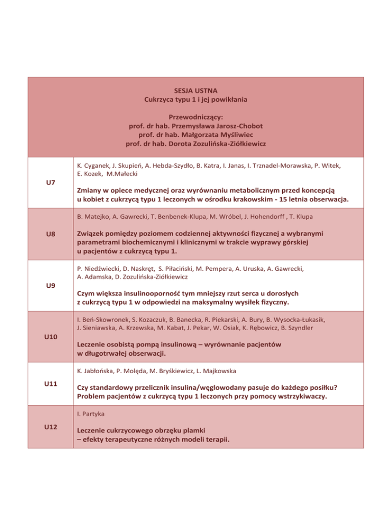 SESJA USTNA Cukrzyca typu 1 i jej powikłania Przewodniczący: prof. dr hab. Przemysława Jarosz-Chobot prof. dr hab. Małgorzata Myśliwiec prof. dr hab. Dorota Zozulińska-Ziółkiewicz K. Cyganek, J. Skupień, A. Hebda-Szydło, B. Katra, I. Janas, I. Trznadel-Morawska, P. Witek, E. Kozek, M.Małecki U7 Zmiany w opiece medycznej oraz wyrównaniu metabolicznym przed koncepcją u kobiet z cukrzycą typu 1 leczonych w ośrodku krakowskim - 15 letnia obserwacja. B. Matejko, A. Gawrecki, T. Benbenek-Klupa, M. Wróbel, J. Hohendorff , T. Klupa U8 Związek pomiędzy poziomem codziennej aktywności fizycznej a wybranymi parametrami biochemicznymi i klinicznymi w trakcie wyprawy górskiej u pacjentów z cukrzycą typu 1. P. Niedźwiecki, D. Naskręt, S. Piłaciński, M. Pempera, A. Uruska, A. Gawrecki, A. Adamska, D. Zozulińska-Ziółkiewicz U9 Czym większa insulinooporność tym mniejszy rzut serca u dorosłych z cukrzycą typu 1 w odpowiedzi na maksymalny wysiłek fizyczny. I. Beń-Skowronek, S. Kozaczuk, B. Banecka, R. Piekarski, A. Bury, B. Wysocka-Łukasik, J. Sieniawska, A. Krzewska, M. Kabat, J. Pekar, W. Osiak, K. Rębowicz, B. Szyndler U10 Leczenie osobistą pompą insulinową – wyrównanie pacjentów w długotrwałej obserwacji. K. Jabłońska, P. Molęda, M. Bryśkiewicz, L. Majkowska U11 Czy standardowy przelicznik insulina/węglowodany pasuje do każdego posiłku? Problem pacjentów z cukrzycą typu 1 leczonych przy pomocy wstrzykiwaczy. I. Partyka U12 Leczenie cukrzycowego obrzęku plamki – efekty terapeutyczne różnych modeli terapii.