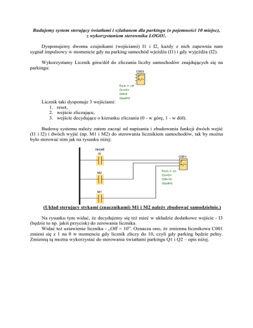 Budujemy system sterujący światłami i szlabanem dla parkingu (o pojemności 10 miejsc), z wykorzystaniem sterownika LOGO!. Dysponujemy dwoma czujnikami (wejściami) I1 i I2, każdy z nich zapewnia nam sygnał impulsowy w momencie gdy na parking samochód wjeżdża (I1) i gdy wyjeżdża (I2). Wykorzystamy Licznik góra/dół do zliczania liczby samochodów znajdujących się na parkingu: Licznik taki dysponuje 3 wejściami: 1. reset, 2. wejście zliczające, 3. wejście decydujące o kierunku zliczania (0 - w górę, 1 - w dół). Budowę systemu należy zatem zacząć od napisania i zbudowania funkcji dwóch wejść (I1 i I2) i dwóch wyjść (np. M1 i M2) do sterowania licznikiem samochodów, tak by można było sterować nim jak na rysunku niżej: (Układ sterujący stykami (znacznikami) M1 i M2 należy zbudować samodzielnie.) Na rysunku tym widać, że decydujemy się też mieć w układzie dodatkowe wejście - I3 (będzie to np. jakiś przycisk) do zerowania licznika. Widać też ustawienie licznika - „Off = 10”. Oznacza ono, że zmienna licznikowa C001 zmieni się z 1 na 0 w momencie gdy licznik zliczy do 10, czyli gdy parking będzie pełny. Zmienną tą można wykorzystać do sterowania światłami parkingu Q1 i Q2 – opis niżej. Niech więc nasz układ ma 3 wyjścia: − Q1 i Q2 to światło zielone i czerwone, działające w sposób intuicyjny, czyli że Q1 świeci się gdy liczba samochodów na parkingu jest mniejsza niż 9, natomiast gdy na parkingu znajdzie się 10 samochodów zapala się światło czerwone. − Q3 to natomiast szlaban, niezależny od liczny samochodów na parkingu. Niech szlaban zamyka się w określonych dniach i godzinach tygodnia. Jak to zrobić? Należy wyjściem Q3 sterować za pomocą układu Timera tygodniowego, tak jak na rysunku: W układzie tym można ustawić załączanie/wyłącznie zmiennej licznikowej (w przypadku licznika z rysunku powyżej byłaby to zmienna T005) w określonych godzinach w określonych dniach tygodnia. Niech więc nasz parking jest czynny następująco: o pn.-pt.: 9-21, o sobota: 10-20, o niedziela nieczynne. Sterownik LOGO! dysponuje też wyświetlaczem. Skoro tak jest, wykorzystajmy go. By to zrobić należy wstawić do układu blok Komunikaty i odpowiednio go skonfigurować (edycja przez dwuklik na układ): Niech na wyświetlaczu wyświetlają się następujące parametry: − aktualna liczba samochodów na parkingu, − data, − godzina.