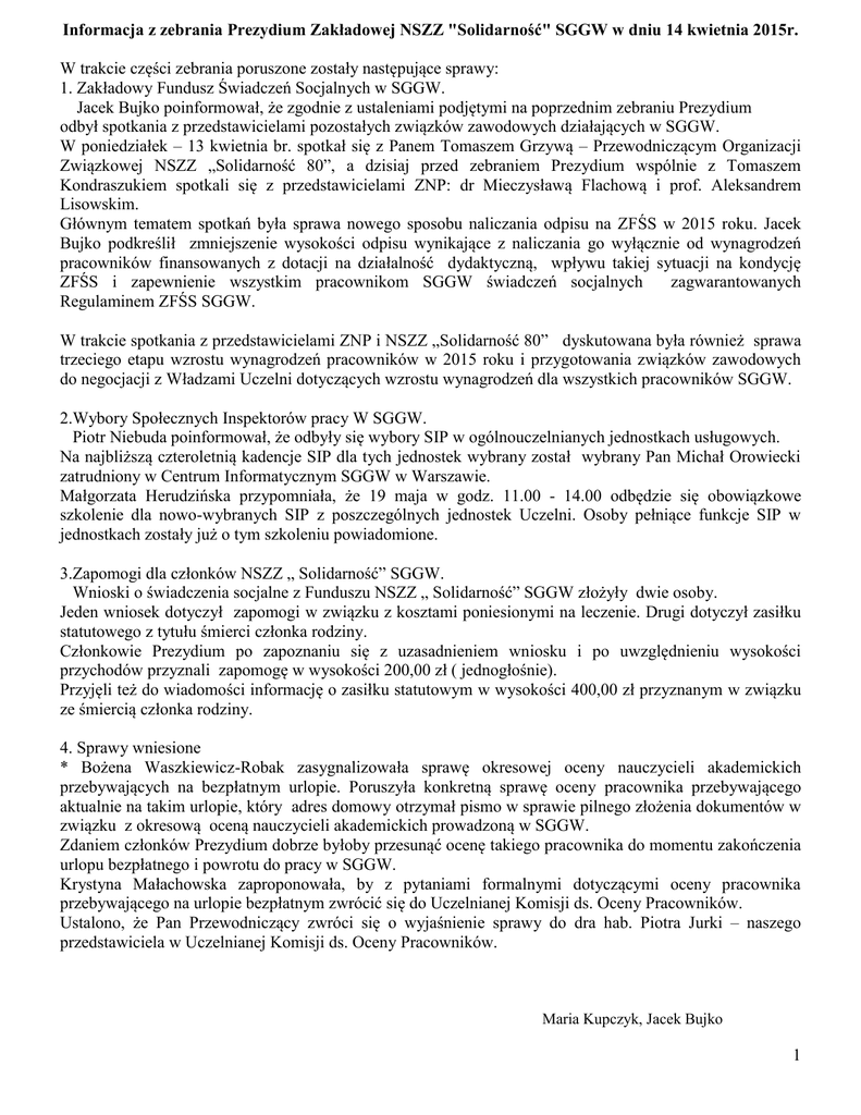 Informacja z zebrania Prezydium Zakładowej NSZZ "Solidarność" SGGW w dniu 14 kwietnia 2015r. W trakcie części zebrania poruszone zostały następujące sprawy: 1. Zakładowy Fundusz Świadczeń Socjalnych w SGGW. Jacek Bujko poinformował, że zgodnie z ustaleniami podjętymi na poprzednim zebraniu Prezydium odbył spotkania z przedstawicielami pozostałych związków zawodowych działających w SGGW. W poniedziałek – 13 kwietnia br. spotkał się z Panem Tomaszem Grzywą – Przewodniczącym Organizacji Związkowej NSZZ „Solidarność 80”, a dzisiaj przed zebraniem Prezydium wspólnie z Tomaszem Kondraszukiem spotkali się z przedstawicielami ZNP: dr Mieczysławą Flachową i prof. Aleksandrem Lisowskim. Głównym tematem spotkań była sprawa nowego sposobu naliczania odpisu na ZFŚS w 2015 roku. Jacek Bujko podkreślił zmniejszenie wysokości odpisu wynikające z naliczania go wyłącznie od wynagrodzeń pracowników finansowanych z dotacji na działalność dydaktyczną, wpływu takiej sytuacji na kondycję ZFŚS i zapewnienie wszystkim pracownikom SGGW świadczeń socjalnych zagwarantowanych Regulaminem ZFŚS SGGW. W trakcie spotkania z przedstawicielami ZNP i NSZZ „Solidarność 80” dyskutowana była również sprawa trzeciego etapu wzrostu wynagrodzeń pracowników w 2015 roku i przygotowania związków zawodowych do negocjacji z Władzami Uczelni dotyczących wzrostu wynagrodzeń dla wszystkich pracowników SGGW. 2.Wybory Społecznych Inspektorów pracy W SGGW. Piotr Niebuda poinformował, że odbyły się wybory SIP w ogólnouczelnianych jednostkach usługowych. Na najbliższą czteroletnią kadencje SIP dla tych jednostek wybrany został wybrany Pan Michał Orowiecki zatrudniony w Centrum Informatycznym SGGW w Warszawie. Małgorzata Herudzińska przypomniała, że 19 maja w godz. 11.00 - 14.00 odbędzie się obowiązkowe szkolenie dla nowo-wybranych SIP z poszczególnych jednostek Uczelni. Osoby pełniące funkcje SIP w jednostkach zostały już o tym szkoleniu powiadomione. 3.Zapomogi dla członków NSZZ „ Solidarność” SGGW. Wnioski o świadczenia socjalne z Funduszu NSZZ „ Solidarność” SGGW złożyły dwie osoby. Jeden wniosek dotyczył zapomogi w związku z kosztami poniesionymi na leczenie. Drugi dotyczył zasiłku statutowego z tytułu śmierci członka rodziny. Członkowie Prezydium po zapoznaniu się z uzasadnieniem wniosku i po uwzględnieniu wysokości przychodów przyznali zapomogę w wysokości 200,00 zł ( jednogłośnie). Przyjęli też do wiadomości informację o zasiłku statutowym w wysokości 400,00 zł przyznanym w związku ze śmiercią członka rodziny. 4. Sprawy wniesione * Bożena Waszkiewicz-Robak zasygnalizowała sprawę okresowej oceny nauczycieli akademickich przebywających na bezpłatnym urlopie. Poruszyła konkretną sprawę oceny pracownika przebywającego aktualnie na takim urlopie, który adres domowy otrzymał pismo w sprawie pilnego złożenia dokumentów w związku z okresową oceną nauczycieli akademickich prowadzoną w SGGW. Zdaniem członków Prezydium dobrze byłoby przesunąć ocenę takiego pracownika do momentu zakończenia urlopu bezpłatnego i powrotu do pracy w SGGW. Krystyna Małachowska zaproponowała, by z pytaniami formalnymi dotyczącymi oceny pracownika przebywającego na urlopie bezpłatnym zwrócić się do Uczelnianej Komisji ds. Oceny Pracowników. Ustalono, że Pan Przewodniczący zwróci się o wyjaśnienie sprawy do dra hab. Piotra Jurki – naszego przedstawiciela w Uczelnianej Komisji ds. Oceny Pracowników. Maria Kupczyk, Jacek Bujko 1