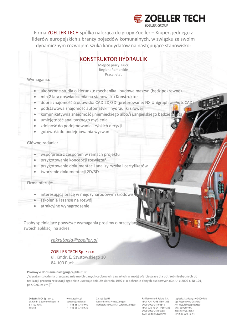 Firma ZOELLER TECH spółka należąca do grupy Zoeller – Kipper, jednego z liderów europejskich z branży pojazdów komunalnych, w związku ze swoim dynamicznym rozwojem szuka kandydatów na następujące stanowisko: KONSTRUKTOR HYDRAULIK Miejsce pracy: Puck Region: Pomorskie Praca: etat Wymagania: ukończone studia o kierunku: mechanika i budowa maszyn (bądź pokrewne) min 2 lata doświadczenia na stanowisku Konstruktor dobra znajomość środowiska CAD 2D/3D (preferowane: NX Unigraphics, AutoCAD) podstawowa znajomość automatyki i hydrauliki siłowej komunikatywna znajomość j.niemieckiego albo/i j.angielskiego będzie zaletą umiejętność analitycznego myślenia zdolność do podejmowania szybkich decyzji gotowość do podejmowania wyzwań Główne zadania: współpraca z zespołem w ramach projektu przygotowanie koncepcji rozwiązań przygotowanie dokumentacji analizy ryzyka i certyfikatów tworzenie dokumentacji 2D/3D Firma oferuje: interesującą pracę w międzynarodowym środowisku szkolenia i szanse na rozwój atrakcyjne wynagrodzenie Osoby spełniające powyższe wymagania prosimy o przesyłanie swoich aplikacji na adres: [email protected] ZOELLER TECH Sp. z o.o. ul. Kmdr. E. Szystowskiego 10 84-100 Puck Prosimy o dopisanie następującej klauzuli: „Wyrażam zgodę na przetwarzanie moich danych osobowych zawartych w mojej ofercie pracy dla potrzeb niezbędnych do realizacji procesu rekrutacji zgodnie z ustawą z dnia 29 sierpnia 1997 r. o ochronie danych osobowych (Dz. U. z 2002 r. Nr 101, poz. 926, ze zm.)”