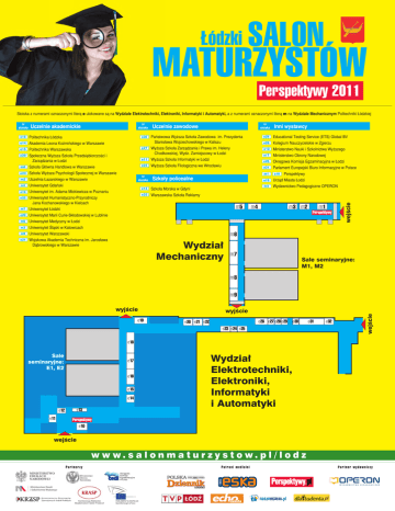 Łódzki Salon MaturzyStów Perspektywy 2011 Stoiska z numerami oznaczonymi literą e ulokowane są na Wydziale Elektrotechniki, Elektroniki, Informatyki i Automatyki, a z numerami oznaczonymi literą m na Wydziale Mechanicznym Politechniki Łódzkiej nr stoiska Uczelnie akademickie e18 Politechnika Łódzka e14 Akademia Leona Koźmińskiego w Warszawie e15 Politechnika Warszawska e29 Społeczna Wyższa Szkoła Przedsiębiorczości i Zarządzania w Łodzi e23 Szkoła Wyższa Psychologii Społecznej w Warszawie m2 Uczelnia Łazarskiego w Warszawie m5 Uniwersytet Gdański e16 Uniwersytet im. Adama Mickiewicza w Poznaniu e22 Uniwersytet Humanistyczno-Przyrodniczy Jana Kochanowskiego w Kielcach m7 Uniwersytet Łódzki e20 Uniwersytet Marii Curie-Skłodowskiej w Lublinie m6 Uniwersytet Medyczny w Łodzi m3 Uniwersytet Śląski w Katowicach m9 Uniwersytet Warszawski e21 Wojskowa Akademia Techniczna im. Jarosława Dąbrowskiego w Warszawie Inni wystawcy e24 Educational Testing Service (ETS) Global BV e28 Kolegium Nauczycielskie w Zgierzu Wyższa Szkoła Zarządzania i Prawa im. Heleny Chodkowskiej, Wydz. Zamiejscowy w Łodzi e12 Ministerstwo Nauki i Szkolnictwa Wyższego e17 e11 Ministerstwo Obrony Narodowej Wyższa Szkoła Informatyki w Łodzi e26 e25 Okręgowa Komisja Egzaminacyjna w Łodzi Wyższa Szkoła Filologiczna we Wrocławiu e31 Parlament Europejski Biuro Informacyjne w Polsce e27 Szkoła Główna Handlowa w Warszawie Uczelnie zawodowe Państwowa Wyższa Szkoła Zawodowa im. Prezydenta Stanisława Wojciechowskiego w Kaliszu e30 m8 nr stoiska nr stoiska m1 Szkoły policealne e13 Szkoła Morska w Gdyni e32 Warszawska Szkoła Reklamy m5 e10 Perspektywy e19 Urząd Miasta Łodzi m4 Wydawnictwo Pedagogiczne OPERON m4 m3 m2 m1 Perspektywy wejście nr stoiska m6 Wydział Mechaniczny m7 Sale seminaryjne: M1, M2 m8 wyjście e19 wyjście e26 e27 e28 e29 e20 e21 e22 e30 e23 e24 e25 e31 e32 wejście m9 e18 Sale seminaryjne: E1, E2 e17 e16 e15 e14 e12 e11 e13 Wydział Elektrotechniki, Elektroniki, Informatyki i Automatyki Perspektywy e10 wejście w w w. s a l o n m a t u r z y s t o w. p l / l o d z Partnerzy Ministerstwo Obrony Narodowej Konferencja Rektorów Akademickich Szkół Polskich Patroni medialni Okręgowa Komisja Egzaminacyjna w Łodzi Partner wydawniczy