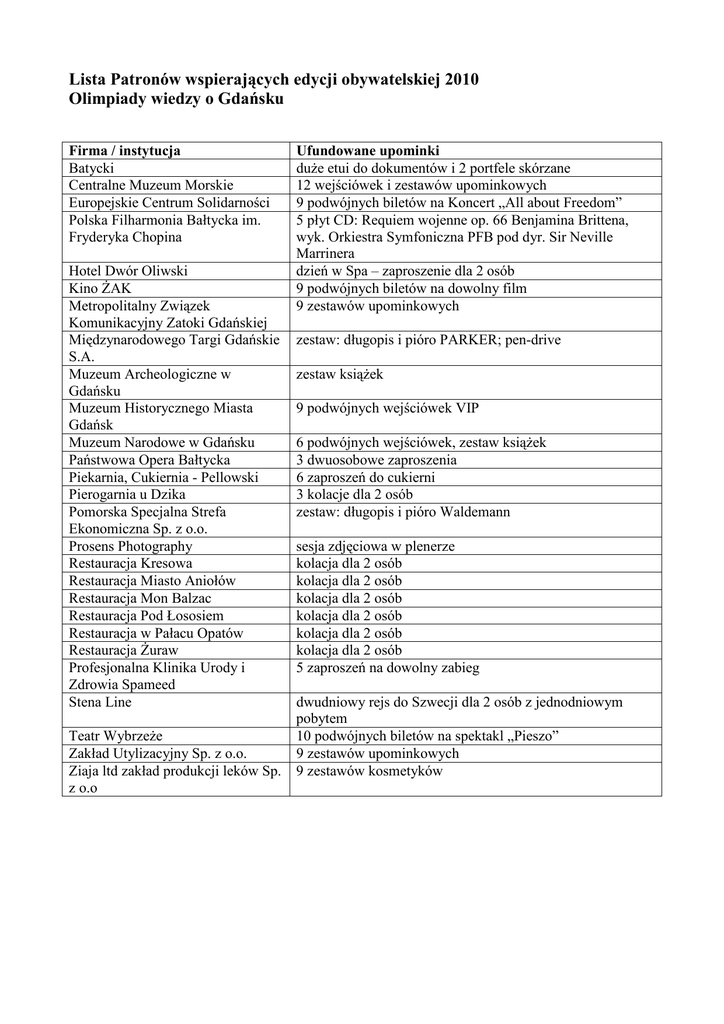 Lista Patronów wspierających edycji obywatelskiej 2010 Olimpiady wiedzy o Gdańsku Firma / instytucja Batycki Centralne Muzeum Morskie Europejskie Centrum Solidarności Polska Filharmonia Bałtycka im. Fryderyka Chopina Hotel Dwór Oliwski Kino śAK Metropolitalny Związek Komunikacyjny Zatoki Gdańskiej Międzynarodowego Targi Gdańskie S.A. Muzeum Archeologiczne w Gdańsku Muzeum Historycznego Miasta Gdańsk Muzeum Narodowe w Gdańsku Państwowa Opera Bałtycka Piekarnia, Cukiernia - Pellowski Pierogarnia u Dzika Pomorska Specjalna Strefa Ekonomiczna Sp. z o.o. Prosens Photography Restauracja Kresowa Restauracja Miasto Aniołów Restauracja Mon Balzac Restauracja Pod Łososiem Restauracja w Pałacu Opatów Restauracja śuraw Profesjonalna Klinika Urody i Zdrowia Spameed Stena Line Teatr WybrzeŜe Zakład Utylizacyjny Sp. z o.o. Ziaja ltd zakład produkcji leków Sp. z o.o Ufundowane upominki duŜe etui do dokumentów i 2 portfele skórzane 12 wejściówek i zestawów upominkowych 9 podwójnych biletów na Koncert „All about Freedom” 5 płyt CD: Requiem wojenne op. 66 Benjamina Brittena, wyk. Orkiestra Symfoniczna PFB pod dyr. Sir Neville Marrinera dzień w Spa – zaproszenie dla 2 osób 9 podwójnych biletów na dowolny film 9 zestawów upominkowych zestaw: długopis i pióro PARKER; pen-drive zestaw ksiąŜek 9 podwójnych wejściówek VIP 6 podwójnych wejściówek, zestaw ksiąŜek 3 dwuosobowe zaproszenia 6 zaproszeń do cukierni 3 kolacje dla 2 osób zestaw: długopis i pióro Waldemann sesja zdjęciowa w plenerze kolacja dla 2 osób kolacja dla 2 osób kolacja dla 2 osób kolacja dla 2 osób kolacja dla 2 osób kolacja dla 2 osób 5 zaproszeń na dowolny zabieg dwudniowy rejs do Szwecji dla 2 osób z jednodniowym pobytem 10 podwójnych biletów na spektakl „Pieszo” 9 zestawów upominkowych 9 zestawów kosmetyków