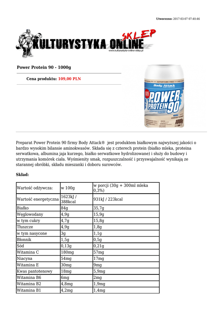 Utworzono: 2017-03-07 07:40:46 Power Protein 90 - 1000g Cena produktu: 109,00 PLN Preparat Power Protein 90 firmy Body Attack® jest produktem białkowym najwyższej jakości o bardzo wysokim bilansie aminokwasów. Składa się z czterech protein (białko mleka, proteina serwatkowa, albumina jaja kurzego, białko serwatkowe hydrolizowane) i służy do budowy i utrzymania komórek ciała. Wyśmienity smak, rozpuszczalność i przyswajalność wynikają ze starannej obróbki, składu mieszanki i doboru surowców. Skład: Wartość odżywcza: w 100g w porcji (30g + 300ml mleka 0,3%) Wartość energetyczna 1623kJ / 388kcal 931kJ / 223kcal Białko 84g 35,7g Węglowodany 4,9g 15,9g w tym cukry 4,7g 15,8g Tłuszcze 4,9g 1,8g w tym nasycone 3g 1,1g Błonnik 1,5g 0,5g Sód 0,13g 0,21g Witamina C 180mg 57mg Niacyna 54mg 17mg Witamina E 30mg 9mg Kwas pantotenowy 18mg 5,9mg Witamina B6 6mg 2mg Witamina B2 4,8mg 1,9mg Witamina B1 4,2mg 1,4mg Kwas foliowy 600ug 195ug Biotyna 450ug 141ug Witamina B12 3ug 1,8ug Dawkowanie: Zaleca się stosowanie jednej do dwóch porcji dziennie. Adres: http://www.ko.sklep.pl/ Telefon: kom. 782 010 880 Email: [email protected]