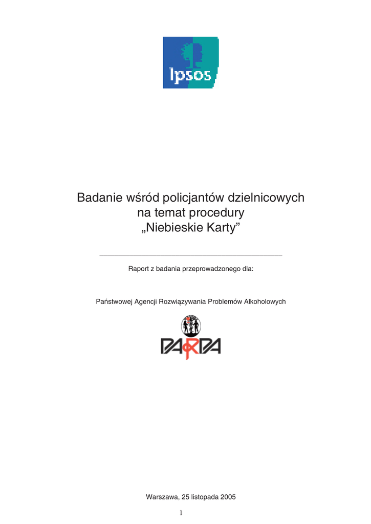 Badanie wśród policjantów dzielnicowych na temat procedury „Niebieskie Karty” ________________________________________________ Raport z badania przeprowadzonego dla: Państwowej Agencji Rozwiązywania Problemów Alkoholowych Warszawa, 25 listopada 2005 1 WPROWADZENIE .......................................................................................................................................3 OGÓLNA WIEDZA O PROCEDURZE „NIEBIESKIE KARTY”.....................................................................3 DOŚWIADCZENIA ZWIĄZANE Z PROCEDURĄ „NIEBIESKIE KARTY” I JEJ OCENA .............................4 SPOSOBY POSTĘPOWANIA W RÓŻNYCH PRZYPADKACH PRZEMOCY DOMOWEJ .........................6 WSPÓŁPRACA Z INNYMI INSTYTUCJAMI W ZAKRESIE POMOCY OFIAROM PRZEMOCY DOMOWEJ...................................................................................................................................................7 BARIERY W EFEKTYWNYM DZIAŁANIU NA RZECZ POMOCY OFIAROM PRZEMOCY ......................10 OPINIE DOTYCZĄCE PRZEMOCY W RODZINIE ....................................................................................11 2 Wprowadzenie Badanie dotyczące procedury przeprowadzania interwencji domowej wobec przemocy w rodzinie „Niebieskie Karty” obejmowało trzy grupy respondentów: policjantów patrolowych, dzielnicowych oraz pracowników ośrodków pomocy społecznej. Wywiady z wszystkimi grupami respondentów przeprowadzane były równolegle w dniach 19 października – 8 listopada 2005 w wylosowanych do badania gminach na terenie całej Polski. W badaniu wzięło udział łącznie 302 policjantów dzielnicowych. Celem projektu było poznanie poziomu wiedzy pracowników badanych instytucji na temat procedury „Niebieskie Karty” oraz ich opinii i doświadczeń zawodowych związanych z realizacją tej procedury. Badanie przeprowadzone było metodą bezpośrednich wywiadów kwestionariuszowych przy użyciu narzędzia przygotowanego przez Państwową Agencję Rozwiązywania Problemów Alkoholowych. W poniższej tabeli przedstawiona jest szczegółowa struktura badanych osób ze względu na ich płeć, wiek, wielkość miejscowości, wykształcenie i staż pracy w zawodzie. Tab. 1.1.: Profil respondenta Baza: wszyscy badani policjanci dzielnicowi, n=302 Płeć Wiek Wielkość miejscowości Wykształcenie Staż pracy Kobieta Mężczyzna Do 30 lat 31-40 lat 41-50 lat Powyżej 50 lat miasto 200 tys. + miasto 50 – 200 tys. miasto do 50 tys. wieś średnie policealne licencjat wyższe krócej niż rok 1-5 lat 6-10 lat 11-20 lat ponad 20 lat 5% 95% 24% 60% 14% 2% 21% 20% 35% 23% 83% 3% 3% 10% 12% 35% 49% 4% Ogólna wiedza o procedurze „Niebieskie Karty” Niemal wszyscy badani policjanci byli zgodni, co do tego, że „Niebieskie Karty” dotyczą sytuacji przemocy fizycznej (bicie, okaleczanie) oraz psychicznej (znieważanie, wyzywanie) – takiego zdania było odpowiednio 998% i 98% respondentów. Sytuacje wykorzystywania seksualnego i zaniedbywania wskazywane były przez znacznie mniejsze odsetki badanych (75% i 45 %). Sytuacje zaniedbywania częściej zaliczyli do procedury policjanci z wyższym wykształceniem – odsetek wskazań wyniósł 61%. Działania policjanta posługującego się „Niebieską Kartą” mają na celu przede wszystkim dostarczenie ofierze (ofiarom) przemocy w rodzinie informacji prawnej oraz informacji o możliwościach dalszego szukania pomocy (92%). Około jednej czwartej respondentów wskazało również na odpowiedzi: § Ułatwienie dzielnicowemu prowadzenia dalszych działań prewencyjnych wobec rodziny, w której jest przemoc oraz uruchomienie i usprawnienie współpracy z innymi służbami społecznymi przeciwdziałającymi przemocy w rodzinie (76%) § Rozpoznanie skali zjawiska i zagrożeń w rodzinie (75%) Rejestracja śladów i przebiegu wydarzeń oraz podjętych czynności, gromadzenie informacji z interwencji domowych i stały kontakt z zagrożoną rodziną było wymienione przez najmniejszy 3 odsetek respondentów (65%). Większość, bo aż 76% badanych dzielnicowych, twierdzi, że w skład dokumentacji „Niebieskich Kart” wchodzą dwa formularze A i B ( grupie osób w wieku do lat 30 odsetek ten wyniósł 84%) . Jeden na pięciu jest natomiast zdania, że są to trzy formularze A, B i C (13%) lub cztery – A, B, C i D (8%). Ponad 80% badanych jest jednocześnie przekonanych, że karta B jest przeznaczona dla ofiary przemocy (odsetek ten jest wyższy wśród pracowników wieku do 30 lat i wynosi 92%). Wśród pozostałych 20% połowa jest zdania, że dla dyżurnego jednostki, a połowa – że dla policjanta przeprowadzającego interwencję. Badani dzielnicowi do swoich zadań w sprawach dotyczących przemocy zaliczyli przede wszystkim: § nawiązanie współpracy z innymi służbami pomagającymi ofiarom przemocy domowej w środowisku lokalnym (93%), § założenie teczki zagadnieniowej pt. “Przemoc domowa” (92%), § gromadzenie dokumentacji z każdej interwencji i działań podjętych po interwencji (91%). Pozostałe odpowiedzi wskazane były przez mniejsze odsetki badanych. Ponad połowa jednak (58%) za swój obowiązek uznało systematyczne wizyty - co najmniej raz w roku - sprawdzające stan bezpieczeństwa domowników i zachowanie sprawców, a niemal jedna trzecia (32%) - kontrolowanie interwencji podejmowanych przez inne służby pomagające ofiarom przemocy domowej. Doświadczenia związane z procedurą „Niebieskie Karty” i jej ocena Spośród wszystkich rodzajów przemocy rodzinnej, badani policjanci dzielnicowi w ostatnim roku najczęściej mieli do czynienia z przypadkami ofiar przemocy fizycznej (94%) oraz osób poważnie krzywdzonych emocjonalnie w rodzinie (84%). Niemal co drugi badany (45%) spotkał się z przypadkami dzieci zaniedbywanych. Natomiast przypadki osób wykorzystywanych seksualnie w rodzinie zaobserwowało jedynie 13% policjantów dzielnicowych i były to przypadki sporadyczn