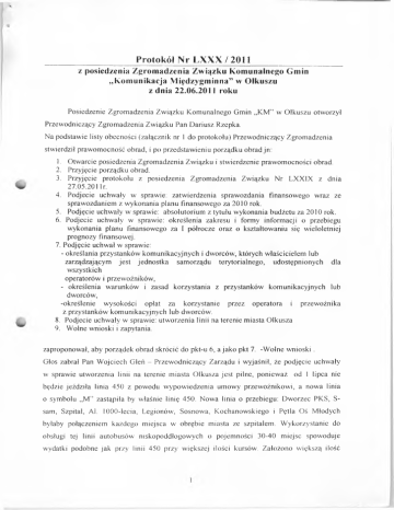 Protokół Nr L X X X / 2011 z posiedzenia Z grom adzenia Związku Komunalnego Gmin „K om unikacja Międzygminna” w Olkuszu z dnia 22.06.2011 roku Posiedzenie Zgrom adzenia Zw iązku Kom unalnego Gmin „K M ” w O lkuszu otworzył Przewodniczący Zgrom adzenia Związku Pan Dariusz Rzepka. Na podstawcie listy obecności (załącznik nr 1 do protokołu) Przewodniczący Zgrom adzenia stwierdził praw om ocność obrad, i po przedstawieniu porządku obrad jn; 1. O twarcie posiedzenia Zgrom adzenia Zw iązku i stwierdzenie praw om ocności obrad. 2. Przyjęcie porządku obrad. 3. Przyjęcie protokołu z posiedzenia Zgrom adzenia Związku Nr LXXIX z dnia 27.05.2011r. 4. Podjecie ucłiwały w sprawie: zatw ierdzenia sprawozdania finansow ego wTaz ze sprawozdaniem z wykonania planu finansowego za 2010 rok. 5. Podjęcie uchwały w sprawie; absolutorium z tytułu wykonania budżetu za 2010 rok. 6. Podjecie uchwały w sprawie; określenia zakresu i formy inform acji o przebiegu wykonania planu finansowego za I półrocze oraz o kształtow aniu się wieloletniej prognozy finansowej. 7. Podjęcie uchw ał w sprawie; - określania przystanków kom unikacyjnych i dworców, których w łaścicielem lub zarządzającym je st jednostka sam orządu terytorialnego, udostępnionych dla wszystkich operatorów i przewoźników, - określenia w arunków i zasad korzystania z przystanków kom unikacyjnych lub dworców, -określenie wysokości opłat za korzystanie przez operatora i przew oźnika z przystanków kom unikacyjnych lub dworców. 8. Podjecie uchwały w sprawie; utw orzenia linii na terenie miasta O lkusza 9. Wolne wnioski i zapytania. zaproponował, aby porządek obrad skrócić do pkt-u 6, a jako pkt 7. -W olne wnioski . Głos zabrał Pan W ojciech Gleń - Przew odniczący Zarządu i wyjaśnił, że podjęcie uchwały w sprawie utworzenia linii na terenie m iasta Olkusza jest pilne, ponieważ od 1 lipca nie będzie jeździła linia 450 z powodu w>'powiedzenia umowy przew oźnikowi, a nowa linia o symbolu „M ” zastąpiła by właśnie linię 450. Nowa linia o przebiegu; Dworzec PKS, Ssam, Szpital, Al. lOOO-lecia, Legionów, Sosnow'a, Kochanowskiego i Pętla Oś M łodych byłaby połączeniem każdego miejsca w obrębie miasta ze szpitalem. W ykorzystanie do obsługi tej linii autobusów niskopoddłogow ych o pojemności 30-40 miejsc spowoduje wydatki podobne jak przy linii 450 przy większej ilości kursów. Założono większą ilość kursów, gdyż po Nowym Roku zaw ieszona zostanie także linia 450S, na realizację której umowa przewozowa kończy się 31.12.201 Ir. Pan Dariusz Rzepka zapytał, czy na okres wakacji można zawiesić linię 450 i nie uruchamiać nowej linii. Zdaniem Pana W ojciecha Glenia od połowy sierpnia nowa linia pow inna ju ż istnieć, żeby przyzwyczaić pasażerów przed rozpoczęciem nowego roku szkolnego we w rześniu do nowej linii o innym przebiegu niż linia 450. Pan Jacek Sierka stwierdził, że będzie trudno przyzwyczaić pasażerów do innego przebiegu, gdyż jest to zm iana kierunku jazdy w przypadku ul. K.K. W ielkiego. Po przedyskutowaniu Członkowie Zgrom adzenia zdecydowali odłożyć podjecie uchwały w sprawie utworzenia linii do następnego posiedzenia którego term in ustalono na początek lipca. Przewodniczący Zgrom adzenia zapytał, czy ktoś ma uwagi do zm ienionego porządku obrad. Ponieważ więcej uwag nie było porządek obrad z wpro wsadzony mi zm ianam i został przyjęty jednogłośnie (7 głosów za). Ad. 3. Protokół N r LXXIX z dnia 27 m aja 20 li r . został przyjęty jednogłośnie. Ad. 4. Przewodniczący Komisji Rewizyjnej Pan Jan Kucharzyk odczytał protokół Komisji Rewizyjnej, w którym K om isja nie w niosła zastrzeżeń do w ykonania budżetu za 2010 rok (załącznik nr 2 do protokołu). Przewodniczący Zgrom adzenia Zw iązku Pan Dariusz R zepka zapytał, kto je st za przyjęciem uchwały. W głosowaniu jaw nym jednogłośnie (7 głosów za) członkow ie Zgrom adzenia podjęli: Uchwałę Nr LXXX / 295 /2011 Zgromadzenia Związku Komunalnego Gmin „Komunikacja Międzygminna” w Olkuszu w sprawie: zatw ierdzenia spraw ozdania finansowego wraz ze spraw^ozdaniem z w ykonania planu finansow ego za 2010 rok. (Załącznik nr 3 do protokołu). Ad 5 Pan Jan Kucharzyk odczytał wniosek Komisji Rewizyjnej w sprawie udzielenia absolutorium dla Zarządu Związku za 2 0 10 rok (załącznik nr 4 do protokołu). Przewodniczący Zgrom adzenia Pan Dariusz Rzepka odczytał uchw ałę Regionalnej Izby Obrachunkow'ej w Krakowie w sprawcie zaopiniow ania wniosku Komisji Rewizyjnej Zgrom adzenia Związku Kom unalnego Gmin „K om unikacja M iędzygm m na” w Olkuszu w sprawie absolutorium dla Zarządu Zw iązku z tylułu w ykonania budżetu za 20l0r. (Załącznik nr 5 do protokołu) Głos zabrał Przewodniczący Zarządu Pan W ojciech Gleń podjąć działania, opracować plan transportowy. i pow iedział, że Zarząd musi Kom unikacja jest Unansow^ana z dwóch źródeł: z dotacji Gmin i ze sprzedaży biletów. K om unikacja miejska jako komunikacja użyteczności publicznej, nie jest instytucją dochodow ą, lecz ma służyć społeczeństwu. Nowa ustawa nakłada na Gminy powyżej 50 tys. m ieszkańców i na Związki przygotowanie planu transportowego, którego opracow^anie Zarząd postanow ił zlecić specjalistom jeszcze w tym roku. Ponieważ nikt więcej nie zabrał głosu Przewodniczący Zgrom adzenia zapytał kto jest za przyjęciem uchwały. W związku z powyższym Członkowie Zgrom adzenia jednogłośnie (7 głosów za) podjęli: Uchwałę Nr LXXX / 296 /2011 Zgromadzenia Związku Komunalnego Gmin „Komunikacja Międzygminna” w Olkuszu w sprawie: absolutorium z tytułu wykonania budżetu za 2010 rok. (Załącznik nr 6 do protokołu). Ad. 6 Przewodniczący Zgrom adzenia zapytał, czy ktoś m a uwagi do proponow anej uchwały w sprawie określenia zakresu i formy inform acji o przebiegu w ykonania planu finansowego za I półroc