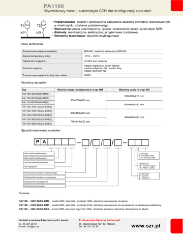 PA1100 Stycznikowy moduł automatyki SZR dla konfiguracji sieć-sieć • Przeznaczenie: nadzór i samoczynne załączenie zasilania obwodów rezerwowanych w chwili zaniku zasilania podstawowego. • Sterowanie: praca automatyczna, ręczna i odstawienie układu automatyki SZR. • Blokady: mechaniczna, elektryczna, programowa i pożarowa • Elementy łączeniowe: styczniki trzybiegunowe Dane techniczne Znamionowe napięcie zasilania 400VAC, zasilanie automatyki 230VAC Zakres temperatury pracy -10°C…+50°C Wilgotność względna do 95% bez roszenia Kontrola napięcia nadzór napięcia w trzech fazach, nadzór kolejności faz i zaniku fazy, nadzór asymetrii faz Znamionowe napięcie izolacji styczników 1000V Wymiary modułów Typ Wymiary płyty montażowej (w-s-g) -KM Wymiary szafy (w-s-g) -KS PA1100-30/30/0/0-KM(S) PA1100-50/50/0/0-KM(S) PA1100-80/80/0/0-KM(S) 500x500x210 mm 550x350x200 mm 600x600x250 mm PA1100-100/100/0/0-KM(S) PA1100-160/160/0/0-KM(S) PA1100-210/210/0/0-KM(S) PA1100-300/300/0/0-KM(S) PA1100-400/400/0/0-KM(S) 650x450x200 mm 800x800x300 mm 789x543x225 mm Sposób kodowania modułów P A Ilość zasilań podstawowych Lokalizacja: 0 - wewnątrz szafy 1 - na elewacji szafy Ilość zasilań podstawowych Ilość łączników sprzęgłowych Wykonanie: M - moduł na płycie S - moduł w szafie Ilość agregatów Prąd łączników zasilania podstawowego Typ łącznika: K - stycznik Q - wyłącznik Prąd łączników zasilania rezerwowego Prąd łączników sprzęgłowych Prąd łączników agregatu Przykłady: PA1100 – 100/100/0/0-KM0 – moduł SZR, sieć-sieć, styczniki 100A, elementy sterownicze na płycie PA1100 – 210/210/0/0-KM1 – moduł SZR, sieć-sieć, styczniki 210A, elementy sterownicze do wyniesienia na elewację rozdzielnicy PA1100 – 160/160/0/0-KS0 – moduł SZR, sieć-sieć, styczniki 160A, obudowa szafowa, elementy sterownicze na płycie Kontakt w sprawach technicznych i serwis Profesjonalne Systemy Automatyki tel. 48 331 20 57 e-mail: [email protected] Ul. Staromiejska 12/14C, Radom fax. 48 331 25 36 www.szr.pl PA1100 Stycznikowy moduł automatyki SZR dla konfiguracji sieć-sieć Typoszereg sieć-sieć Moduły na płycie montażowej Moduły w szafie Elementy sterownicze na płycie montażowej PA1100-30/30/0/0-KM0 PA1100-55/55/0/0-KM0 PA1100-80/80/0/0-KM0 PA1100-100/100/0/0-KM0 PA1100-160/160/0/0-KM0 PA1100-210/210/0/0-KM0 PA1100-300/300/0/0-KM0 PA1100-400/400/0/0-KM0 Elementy sterownicze na płycie montażowej PA1100-30/30/0/0-KS0 PA1100-55/55/0/0-KS0 PA1100-80/80/0/0-KS0 PA1100-100/100/0/0-KS0 PA1100-160/160/0/0-KS0 PA1100-210/210/0/0-KS0 PA1100-300/300/0/0-KS0 PA1100-400/400/0/0-KS0 Elementy sterownicze montaż na elewacji PA1100-30/30/0/0-KM1 PA1100-55/55/0/0-KM1 PA1100-80/80/0/0-KM1 PA1100-100/100/0/0-KM1 PA1100-160/160/0/0-KM1 PA1100-210/210/0/0-KM1 PA1100-300/300/0/0-KM1 PA1100-400/400/0/0-KM1 Elementy sterownicze na elewacji szafy PA1100-30/30/0/0-KS1 PA1100-55/55/0/0-KS1 PA1100-80/80/0/0-KS1 PA1100-100/100/0/0-KS1 PA1100-160/160/0/0-KS1 PA1100-210/210/0/0-KS1 PA1100-300/300/0/0-KS1 PA1100-400/400/0/0-KS1 Znamionowy prąd styczników 30 A 55 A 80 A 100 A 160 A 210 A 300 A 400 A AC-1 AC-1 AC-1 AC-1 AC-1 AC-1 AC-1 AC-1 Diagram działania zasilanie podstawowe zasilanie rezerwowe wyłącznik pożarowy stycznik KP stycznik KR 1 0/1 0 zamknięty otwarty 0 1 0 otwarty zamknięty 0/1 0/1 1 otwarty otwarty Funkcjonalność Moduł realizuje funkcję SZR z samopowrotem dla konfiguracji sieć-sieć Praca automatyczna, ręczna i odstawienie układu automatyki Regulowany czas pobudzenia po powrocie zasilania Kontrola zamknięcia i otwarcia styczników Wykrywanie uszkodzenia styków Wykrywanie uszkodzenia cewki stycznika Wyświetlanie komunikatów tekstowych o stanie SZR Blokada mechaniczna, programowa, pożarowa i elektryczna W dostawie Kompletnie zmontowany, uruchomiony i testowany moduł automatyki SZR Dla wersji KM-1 elementy sterowniczo-sygnalizacyjne do zabudowania na elewacji rozdzielnicy Pełna dokumentacja techniczna, elektryczna, montażowa i instrukcja obsługi Opcje: Dodatkowe styki sygnalizacyjne Moduł sieci Modbus RTU Styk odciążający część rozdzielnicy przy zasilaniu rezerwowym Zmiana sygnału pożarowego z NO na NC Zasilanie modułu automatyki UPS lub 220DC Projektujemy i wykonujemy moduły automatyki SZR dla wszystkich konfiguracji sieci zasilających wraz z agregatami prądotwórczymi, siłowniami prądu stałego oraz zasilaczami UPS dużej mocy. Zastrzegamy sobie prawo do wprowadzenia zmian i ulepszeń zarówno programowych jak i sprzętowych bez wpływu na samą funkcjonalność modułu automatyki SZR. Kontakt w sprawach technicznych i serwis Profesjonalne Systemy Automatyki tel. 48 331 20 57 e-mail: [email protected] Ul. Staromiejska 12/14C, Radom fax. 48 331 25 36 www.szr.pl