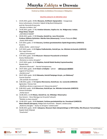 MUZYKA ZAKLĘTA W DREWNIE 2015 1. 2. 3. 4. 5. 6. 7. 8. 9. 10. 11. 12. 13. 14. 23.05.2015, godz. 19:00, Muszyna, Amfiteatr Zapopradzie – Inauguracja Anna Jurksztowicz, Krzesimir Dębski & Big Band Małopolski pod dyr Ryszarda Krawczuka „Muzyka na dobre i złe" 14.06.2015, godz. 17:30, Kraków-Salwator, Kaplica św. św. Małgorzaty i Judyty Kinga Rataj i Zespół „HISTORIA D'AMOR” 28.06.2015, godz. 17:00 Orawka, Kościół św. Jana Chrzciciela Profesor Elżbieta Stefańska i Mariko Kato (klawesyny), Tomasz Potaczek (flet) „Duety XVIII wieku” 5.07.2015, godz. 17:30 Owczary, Cerkiew greckokatolicka Opieki Bogarodzicy (UNESCO) Susanna „Nisko słonko - pieśni duszy” 5.07.2015, godz. 12:00 Dębno Podhalańskie, Kościół pw. św. Michała Archanioła (UNESCO) Pier Luigi Corona „Gitara romantyczna” 5.07.2015, godz. 19:00 Muzeum i Skansen Pszczelarski w Stróżach Siostry Matkowskie „Romanse w cieniu skrzypiec” 12.07.2015, godz. 16:30 Mętków, Kościół Matki Boskiej Częstochowskiej Rozalia Kierc „Rosarium Musicale” – Recital fortepianowy 19.07.2015, godz. 18:00 Dwór w Dołędze – plener - 100 koncert MZWD! Legend of Kazimierz „Zamknij oczy” 26.07.2015, godz. 18:00 Rdzawka, Kościół Świętego Krzyża „na Obidowej” Czortet Quartet „Od zachodu do wschodu” 2.08.2015, godz. 17:00 Lipnica Murowana, Kościół pw. św. Leonarda (UNESCO) Agnieszka i Tomasz Kuk „Modlitwa ukryta w operowej arii i klasycznej pieśni” 9.08.2015, godz. 18:00 Binarowa, Kościół pw. św. Michała Archanioła (UNESCO) Octava Ensemble „Verba Sacra” 16.08.2015, 12.00 Dłużec, Kościół św. św. Mikołaja i Wawrzyńca Duo Sonore – Ilona Nieciąg oraz Krzysztof Leksycki "Rokoko na dwa smyczki" 23.08.2015, godz. 18:00 Kwiatoń, Cerkiew greckokatolicka św. Paraskewii (UNESCO) Maria Sławek (skrzypce), Małgorzata Kuziemska - Sławek ( wiolonczela) „Rodzinny dwugłos – duety na skrzypce i wiolonczele” 30.08.2015, godz. 18:00 Zakopane, Muzeum Stylu Zakopiańskiego w Willi Koliba, filia Muzeum Tatrzańskiego Kapela Hanki Wójciak "Znachorka"