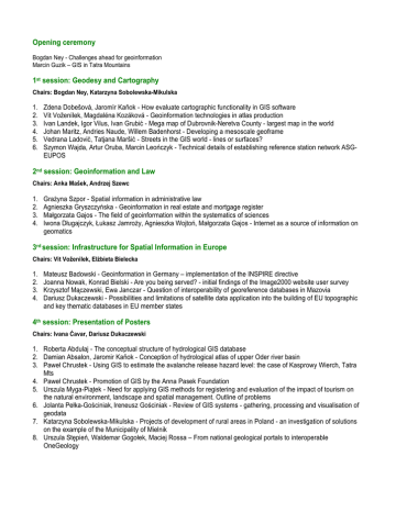 Opening ceremony Bogdan Ney - Challenges ahead for geoinformation Marcin Guzik – GIS in Tatra Mountains 1st session: Geodesy and Cartography Chairs: Bogdan Ney, Katarzyna Sobolewska-Mikulska 1. 2. 3. 4. 5. 6. Zdena Dobešová, Jaromír Kaňok - How evaluate cartographic functionality in GIS software Vít Voženílek, Magdaléna Kozáková - Geoinformation technologies in atlas production Ivan Landek, Igor Vilus, Ivan Grubić - Mega map of Dubrovnik-Neretva County - largest map in the world Johan Maritz, Andries Naude, Willem Badenhorst - Developing a mesoscale geoframe Vedrana Ladović, Tatjana Maršić - Streets in the GIS world - lines or surfaces? Szymon Wajda, Artur Oruba, Marcin Leończyk - Technical details of establishing reference station network ASGEUPOS 2nd session: Geoinformation and Law Chairs: Anka Mašek, Andrzej Szewc 1. 2. 3. 4. GraŜyna Szpor - Spatial information in administrative law Agnieszka Gryszczyńska - Geoinformation in real estate and mortgage register Małgorzata Gajos - The field of geoinformation within the systematics of sciences Iwona Długajczyk, Łukasz JamroŜy, Agnieszka Wojtoń, Małgorzata Gajos - Internet as a source of information on geomatics 3rd session: Infrastructure for Spatial Information in Europe Chairs: Vit Voženilek, ElŜbieta Bielecka 1. 2. 3. 4. Mateusz Badowski - Geoinformation in Germany – implementation of the INSPIRE directive Joanna Nowak, Konrad Bielski - Are you being served? - initial findings of the Image2000 website user survey Krzysztof Mączewski, Ewa Janczar - Question of interoperability of georeference databases in Mazovia Dariusz Dukaczewski - Possibilities and limitations of satellite data application into the building of EU topographic and key thematic databases in EU member states 4th session: Presentation of Posters Chairs: Ivana Ćavar, Dariusz Dukaczewski 1. Roberta Abdulaj - The conceptual structure of hydrological GIS database 2. Damian Absalon, Jaromir Kaňok - Conception of hydrological atlas of upper Oder river basin 3. Paweł Chrustek - Using GIS to estimate the avalanche release hazard level: the case of Kasprowy Wierch, Tatra Mts 4. Paweł Chrustek - Promotion of GIS by the Anna Pasek Foundation 5. Urszula Myga-Piątek - Need for applying GIS methods for registering and evaluation of the impact of tourism on the natural environment, landscape and spatial management. Outline of problems 6. Jolanta Pełka-Gościniak, Ireneusz Gościniak - Review of GIS systems - gathering, processing and visualisation of geodata 7. Katarzyna Sobolewska-Mikulska - Projects of development of rural areas in Poland - an investigation of solutions on the example of the Municipality of Mielnik 8. Urszula Stępień, Waldemar Gogołek, Maciej Rossa – From national geological portals to interoperable OneGeology 5th session: GIS in the Environmental Sciences Chairs: Stanisław Ostaficzuk, Joanna Nowak 1. ElŜbieta Bielecka - Diversity of spatial organisation in Europe based on land cover and land use 2. Vilém Pechanec, Helena Kilianová, Vit Voženílek - GIS analysis of ecotone variability 3. Anka Mašek, Katica Križanović, Sonja Vuković -The case study of sustainable rural development of Erdut Municipality 4. Anka Mašek, Katica Križanović, Gordana Stojanović - The case study of the Municipality of Borovo's tourist offer development by a fractal approach 5. Maria Styblińska - The Carpathian heritage - the challenge for the future 6. Johan Maritz - Using GPS data loggers to measure rural accessibility in South Africa 6th session: Information Technology Chairs: Vlatko Maček, GraŜyna Szpor 1. 2. 3. 4. 5. 6. Slobodan Bajagić, Darko Bajagić - Challenges of 3D visualization Valerija Škorić, Amel Džanić, Vlatko Maček - Internet Vehicle Routing (IVR) Jedrzej Gąsiorowski - Analytical tools for business intelligence in spatial databases Vedrana Ladović, Tatjana Maršić - Web editing of GIS data – when, where and why Bogusz Piliczewski - Visualisation of marine data products using GMT Vladimir Sulimanović, Igor Mlinarić, Hrvoje Vranić - Adriatic Pipeline - GIS concept 7th session: GIS in Meteorology, Climatology, Hydrology and Water Management Chairs: Zdena Dobešová, Zbigniew Ustrnul 1. Vlado Dadić, Vjekoslav Tičina, Damir Ivanković - Usage of geospatial methods in determination of pelagic fish stock distribution 2. Maciej Kryza - Application and validation of the residual kriging method for interpolation of the monthly precipitation field in Poland 3. Mariusz Szymanowski, Maciej Kryza, Krzysztof Migała, Piotr Sobolewski, Lech Kolondra - Modelling and validation of the potential solar radiation for the Hornsund region - application of the r.sun model 4. Jakub Walawender - Mapping and on-line dissemination of ultraviolet radiation products over Poland 8th session: Sponsors’ Presentations Chairs: Zygmunt Wróbel, Małgorzata Gajos 1. ESRI Sp. z o. o. - Magdalena Borodzicz, Karolina Karpisz - Understanding the world through GIS 2. Alteris Sp. z o. o. - Marek Pilch-Kowalczyk - Geospatial aspects of mobile medicine 9th field session: Spatial Aspects of High Mountain Environment - Kasprowy Wierch Chair: Urszula Myga-Piatek 10th field session: Man and Environment - Kościeliska Valley Chair: Damian Absalon 11th session: Cultural Heritage Chairs: Vlado Dadić, Maria Styblińska 1. Davorin Kereković - Exhibition “European Cultural Heritage – Architecture & Sculpture” 2. Maciej Bonawentura Pawlicki, Jacek Czechowicz - The database of historic monuments of architecture as the application aiding the methodology of conservation works 3. Krešimir Buntak, Zygmunt Wróbel, Davorin Kereković: A method for reconstruction of sculptures: the Šibenik Cathedral project 4. Davorin Kereković – Exhibition “Kraków in the Heart and on the Photograph” 5. Stanisław Stanek, Małgorzata Pańkowska, Andrzej Sołtysik, Mariusz śytniewski - Agent system application for geoinformation management at municipal office (3rd
