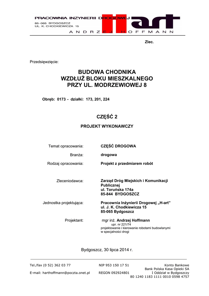 Zlec. Przedsięwzięcie: BUDOWA CHODNIKA WZDŁUś BLOKU MIESZKALNEGO PRZY UL. MODRZEWIOWEJ 8 Obręb: 0173 - działki: 173, 201, 224 CZĘŚĆ 2 PROJEKT WYKONAWCZY Temat opracowania: BranŜa: Rodzaj opracowania: Zleceniodawca: Jednostka projektująca: Projektant: CZĘŚĆ DROGOWA drogowa Projekt z przedmiarem robót Zarząd Dróg Miejskich i Komunikacji Publicznej ul. Toruńska 174a 85-844 BYDGOSZCZ Pracownia InŜynierii Drogowej „H-art” ul. J. K. Chodkiewicza 15 85-065 Bydgoszcz mgr inŜ. Andrzej Hoffmann upr. nr 221/74 projektowanie i kierowanie robotami budowlanymi w specjalności drogi Bydgoszcz, 30 lipca 2014 r. Tel./fax (0 52) 362 03 77 E-mail: [email protected] NIP 953 150 17 51 Konto Bankowe Bank Polska Kasa Opieki SA REGON 092924801 I Oddział w Bydgoszczy 80 1240 1183 1111 0010 0598 4757 BUDOWA CHODNIKA WZDŁUś BLOKU MIESZKALNEGO PRZY UL. MODRZEWIOWEJ 8 projekt wykonawczy części drogowej ZAWARTOŚĆ OPRACOWANIA Opis techniczny Przedmiar robót Rysunki 1. Plan syt.-wys. w skali 1 : 500 2. Przekrój normalny i szczegóły konstrukcyjne Pracownia InŜynierii Drogowej „H-art” Andrzej Hoffmann 2 BUDOWA CHODNIKA WZDŁUś BLOKU MIESZKALNEGO PRZY UL. MODRZEWIOWEJ 8 projekt wykonawczy części drogowej OPIS TECHNICZNY DO CZĘŚCI DROGOWEJ 1. PRZEDMIOT I ZAKRES OPRACOWANIA Przedmiotem opracowania jest projekt budowlano-wykonawczy budowy chodnika w pasie drogowym ul. Modrzewiowej w Bydgoszczy wzdłuŜ bloku nr 8. Projekt swoim zakresem obejmuje budowę nowego odcinka chodnika o długości ok. 100 m, wraz z przebudową dojść do jezdni ulic Świerkowej i Bukowej. 2. PODSTAWA OPRACOWANIA Projekt opracowany został na zlecenie Zarządu Dróg Miejskich i Komunikacji Publicznej w Bydgoszczy w oparciu o zawartą w dniu 29.04.2014 r. umowę nr 60/IP/14. W opracowaniu projektu wykorzystano następujące materiały: • aktualną mapę syt.-wys. terenu opracowaną przez firmę GEAD w Bydgoszczy, • Geotechniczne warunki posadowienia obiektów budowlanych opracowane na potrzeby projektu przez Pracownię Geotechniczną mgr inŜ. J. Juszczakiewicza, • Rozporządzenie ministra transportu i gospodarki morskiej z dnia 2 marca 1999 r. w sprawie warunków technicznych, jakim powinny odpowiadać drogi publiczne i ich usytuowanie, będące przepisem wykonawczym do ustawy Prawo budowlane, • wytyczne ZDMiKP niepełnosprawnych, • obowiązujące przepisy, normy i katalogi, • zalecenia, opinie i wstępne uzgodnienia zleceniodawcy, • naniesienia i warunki techniczne podane przez gestorów sieci uzbrojenia, • inwentaryzacje urządzeń opracowania projektu. dot. stosowania i elementów uzupełniające informacyjnych pomiary wykonane dla w osób ramach 3. STAN ISTNIEJĄCY 3.1. Zagospodarowanie terenu Istniejący po południowej stronie jezdni ul. Modrzewiowej chodnik pomiędzy skrzyŜowaniami z ulicami Świerkową i Bukową znajduje się wyjątkowo poza pasem drogowym tej ulicy. Usytuowany jest na sąsiedniej działce wzdłuŜ budynku mieszkalnego w odległości ok. 10 m od granicy z pasem drogowym ul. Modrzewiowej i ok. 16 m od krawędzi jezdni tej ulicy. Pracownia InŜynierii Drogowej „H-art” Andrzej Hoffmann 3 BUDOWA CHODNIKA WZDŁUś BLOKU MIESZKALNEGO PRZY UL. MODRZEWIOWEJ 8 projekt wykonawczy części drogowej Południową część pasa drogowego oraz przylegający do niego teren o nieznacznym nachyleniu w kierunku zabudowy wypełnia trawnik. Pod trawnikiem w gruncie zlokalizowane są niektóre sieci uzbrojenia terenu (gazociąg i kable energet. nn), przebiegające wzdłuŜ ulicy oraz przyłącza do budynku. Z urządzeń naziemnych przy jezdni usytuowane są słupy oświetleniowe, do których podwieszona jest sieć energet. nn. 3.2. Opinia geotechniczna Wierzchnią warstwę terenu stanowią holoceńskie nasypy piaszczysto-gruzowe o miąŜszości wynoszącej ok. 0,6 m. Pod nasypami występują średnio zagęszczone piaski średnie i grube. Zalegają co najmniej do głębokości udokumentowanej (3 m). Nie stwierdzono występowania wody gruntowej. PodłoŜem dla warstwy konstrukcji drogowej powinny być zagęszczone do wskaźnika > 0,95 istniejące grunty piaszczyste, uzupełnione podsypką z piasku średniego. Projektowane nawierzchnie chodnika zaliczone są do pierwszej kategorii geotechnicznej. Szczegółowy opis warunków gruntowo-wodnych znajduje się w oddzielnym opracowaniu. 4. UKŁAD PROJEKTOWANY 4.1. Rozwiązanie sytuacyjno-wysokościowe Projektowany odcinek chodnika o szerokości 2,0 m poprowadzony został stycznie do granicy pasa drogowego. Zamawiający przewiduje bowiem dobudowę w terminie późniejszym ścieŜki rowerowej, której przebieg zamarkowano na rysunku. W rejonie skrzyŜowań z ulicami Świerkową i Bukową ciąg pieszy dowiązano do istniejących chodników tych ulic. Obecne dojścia od budynku nr 8 do jezdni ul. Modrzewiowej ulegają skróceniu i kończą się na projektowanym chodniku. Pod względem wysokościowym chodnik został poprowadzony równolegle do niwelety jezdni z niewielkim wyniesieniem ponad nieutwardzony teren, na którym się znajdzie. Jest to bardzo waŜne, gdyŜ po wybudowaniu ścieŜki rowerowej utwardzona zostanie cała powierzchnia terenu pomiędzy chodnikiem a jezdnią. Wyniesienie chodnika pozwala na jego powierzchniowe odwodnienie. W przekroju poprzecznym chodnik ma pochylenie jednostronne, ze spadkiem zgodnym z kierunkiem nachylenia terenu. W miejscach przejść dla pieszych przez jezdnie przewidziano wymianę krawęŜników na niŜsze (wtopione) i wprowadzenie w nawierzchni chodnika jednego rzędu płytek ostrzegawczych, których zadaniem jest ułatwienie lokalizacji przejścia osobom niewidomym i słabowidzącym. 4.2 Konstrukcja nawierzchni Konstrukcję nowego chodnika zaprojektowano w następującym układzie warstw: • • • płyty betonowe 50x50 cm kolor szary podsypka cementowo-piaskowa 1:4 podsypka piaskowa Pracownia InŜynierii Drogowej „H-art” Andrzej Hoffmann - 7 cm - 5 cm - 15 cm 4 BUDOWA CHODNIKA WZDŁUś BLOKU MIESZK