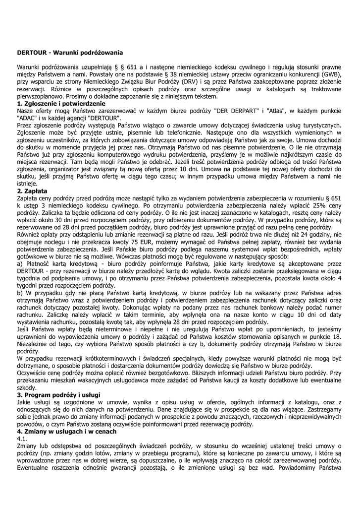 DERTOUR - Warunki podróżowania Warunki podróżowania uzupełniają § § 651 a i następne niemieckiego kodeksu cywilnego i regulują stosunki prawne między Państwem a nami. Powstały one na podstawie § 38 niemieckiej ustawy przeciw ograniczaniu konkurencji (GWB), przy wsparciu ze strony Niemieckiego Związku Biur Podróży (DRV) i są przez Państwa zaakceptowane poprzez złożenie rezerwacji. Różnice w poszczególnych opisach podróży oraz szczególne uwagi w katalogach są traktowane pierwszoplanowo. Prosimy o dokładne zapoznanie się z niniejszym tekstem. 1. Zgłoszenie i potwierdzenie Nasze oferty mogą Państwo zarezerwować w każdym biurze podróży "DER DERPART" i "Atlas", w każdym punkcie "ADAC" i w każdej agencji "DERTOUR". Przez zgłoszenie podróży występują Państwo wiążąco o zawarcie umowy dotyczącej świadczenia usług turystycznych. Zgłoszenie może być przyjęte ustnie, pisemnie lub telefonicznie. Następuje ono dla wszystkich wymienionych w zgłoszeniu uczestników, za których zobowiązania dotyczące umowy odpowiadają Państwo jak za swoje. Umowa dochodzi do skutku w momencie przyjęcia jej przez nas. Otrzymają Państwo od nas pisemne potwierdzenie. O ile nie otrzymają Państwo już przy zgłoszeniu komputerowego wydruku potwierdzenia, przyślemy je w możliwie najkrótszym czasie do miejsca rezerwacji. Tam będą mogli Państwo je odebrać. Jeżeli treść potwierdzenia podróży odbiega od treści Państwa zgłoszenia, organizator jest związany tą nową ofertą przez 10 dni. Umowa na podstawie tej nowej oferty dochodzi do skutku, jeśli przyjmą Państwo ofertę w ciągu tego czasu; w innym przypadku umowa między Państwem a nami nie istnieje. 2. Zapłata Zapłata ceny podróży przed podróżą może nastąpić tylko za wydaniem potwierdzenia zabezpieczenia w rozumieniu § 651 k ustęp 3 niemieckiego kodeksu cywilnego. Po otrzymaniu potwierdzenia zabezpieczenia należy wpłacić 25% ceny podróży. Zaliczka ta będzie odliczona od ceny podróży. O ile nie jest inaczej zaznaczone w katalogach, resztę ceny należy wpłacić około 30 dni przed rozpoczęciem podróży, przy odbieraniu dokumentów podróży. W przypadku podróży, które są rezerwowane od 28 dni przed początkiem podróży, biuro podróży jest uprawnione przyjąć od razu pełną cenę podróży. Również opłaty przy odstąpieniu lub zmianie rezerwacji są płatne od razu. Jeśli podróż trwa nie dłużej niż 24 godziny, nie obejmuje noclegu i nie przekracza kwoty 75 EUR, możemy wymagać od Państwa pełnej zapłaty, również bez wydania potwierdzenia zabezpieczenia. Jeśli Pańskie biuro podróży podlega naszemu systemowi wpłat bezpośrednich, wpłaty gotówkowe w biurze nie są możliwe. Wówczas płatności mogą być regulowane w następujący sposób: a) Płatność kartą kredytową - biuro podróży poinformuje Państwa, jakie karty kredytowe są akceptowane przez DERTOUR - przy rezerwacji w biurze należy przedłożyć kartę do wglądu. Kwota zaliczki zostanie przeksięgowana w ciągu tygodnia od podpisania umowy, i po otrzymaniu przez Państwa potwierdzenia zabezpieczenia, pozostała kwota około 4 tygodni przed rozpoczęciem podróży. b) W przypadku gdy nie płacą Państwo kartą kredytową, w biurze podróży lub na wskazany przez Państwa adres otrzymają Państwo wraz z potwierdzeniem podróży i potwierdzeniem zabezpieczenia rachunek dotyczący zaliczki oraz rachunek dotyczący pozostałej kwoty. Dokonując wpłaty na podany przez nas rachunek bankowy należy podać numer rachunku. Zaliczkę należy wpłacić w takim terminie, aby wpłynęła ona na nasze konto w ciągu 10 dni od daty wystawienia rachunku, pozostałą kwotę tak, aby wpłynęła 28 dni przed rozpoczęciem podróży. Jeśli Państwa wpłaty będą nieterminowe i niepełne i nie uregulują Państwo wpłat po upomnieniach, to jesteśmy uprawnieni do wypowiedzenia umowy o podróży i zażądać od Państwa kosztów stornowania opisanych w punkcie 18. Niezależnie od tego, czy wybiorą Państwo sposób płatności a czy b, dokumenty podróży otrzymają Państwo w biurze podróży. W przypadku rezerwacji krótkoterminowych i świadczeń specjalnych, kiedy powyższe warunki płatności nie mogą być dotrzymane, o sposobie płatności i dostarczenia dokumentów podróży dowiedzą się Państwo w biurze podróży. Oczywiście cenę podróży można opłacić również bezgotówkowo. Bliższych informacji udzieli Państwu biuro podróży. Przy przekazaniu mieszkań wakacyjnych usługodawca może zażądać od Państwa kaucji za koszty dodatkowe lub ewentualne szkody. 3. Program podróży i usługi Jakie usługi są uzgodnione w umowie, wynika z opisu usług w ofercie, ogólnych informacji z katalogu, oraz z odnoszących się do nich danych na potwierdzeniu. Dane znajdujące się w prospekcie są dla nas wiążące. Zastrzegamy sobie jednak prawo do zmiany informacji podanych w prospekcie z powodu znaczących, rzeczowych i nieprzewidywalnych powodów, o czym Państwo zostaną oczywiście poinformowani przed rezerwacją podróży. 4. Zmiany w usługach i w cenach 4.1. Zmiany lub odstępstwa od poszczególnych świadczeń podróży, w stosunku do wcześniej ustalonej treści umowy o podróży (np. zmiany godzin lotów, zmiany w przebiegu programu), które są konieczne po zawarciu umowy, i które są wprowadzone przez nas w dobrej wierze, są dopuszczalne, o ile wpływają znacząco na całość zarezerwowanej podróży. Ewentualne roszczenia odnośnie gwarancji pozostają, o ile zmienione usługi są bez wad. Powiadomimy Państwa niezwłocznie o zmianach lub odstępstwach. W takim przypadku zaoferujemy Państwu również bezpłatną zmianę rezerwacji lub bezpłatne odstąpienie od umowy. 4.2. Zastrzegamy sobie prawo do zmiany ceny uzgodnionej w umowie o podróży w przypadku podwyżki kosztów transportu lub opłat za takie usługi jak opłaty portowe lub lotniskowe, lub też w przypadku