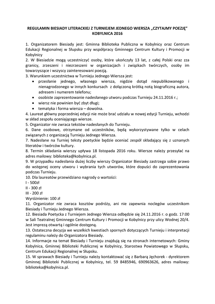 REGULAMIN BIESIADY LITERACKIEJ Z TURNIEJEM JEDNEGO WIERSZA „CZYTAJMY POEZJĘ” KOBYLNICA 2016 1. Organizatorem Biesiady jest: Gminna Biblioteka Publiczna w Kobylnicy oraz Centrum Edukacji Regionalnej w Słupsku przy współpracy Gminnego Centrum Kultury i Promocji w Kobylnicy 2. W Biesiadzie mogą uczestniczyć osoby, które ukończyły 13 lat, z całej Polski oraz zza granicy, zrzeszeni i niezrzeszeni w organizacjach i związkach twórczych, osoby im towarzyszące i wszyscy zainteresowani poezją. 3. Warunkiem uczestnictwa w Turnieju Jednego Wiersza jest: przesłanie jednego, własnego wiersza, nigdzie dotąd niepublikowanego i nienagrodzonego w innych konkursach z dołączoną krótką notą biograficzną autora, adresem i numerem telefonu; osobiste zaprezentowanie nadesłanego utworu podczas Turnieju 24.11.2016 r.; wiersz nie powinien być zbyt długi; tematyka i forma wiersza – dowolna. 4. Laureat główny poprzedniej edycji nie może brać udziału w nowej edycji Turnieju, wchodzi w skład zespołu oceniającego wiersze. 5. Organizator nie zwraca tekstów nadesłanych do Turnieju. 6. Dane osobowe, otrzymane od uczestników, będą wykorzystywane tylko w celach związanych z organizacją Turnieju Jednego Wiersza. 7. Nadesłane na Turniej teksty poetyckie będzie oceniać zespół składający się z uznanych literatów i twórców kultury. 8. Termin składania wierszy upływa 18 listopada 2016 roku. Wiersze należy przesyłać na adres mailowy: [email protected]. 9. W przypadku nadesłania dużej liczby wierszy Organizator Biesiady zastrzega sobie prawo do wstępnej oceny utworu i wybrania tych utworów, które dopuści do zaprezentowania podczas Turnieju. 10. Dla laureatów przewidziano nagrody o wartości: I - 500zł II - 300 zł III - 200 zł Wyróżnienie: 100 zł 11. Organizator nie zwraca kosztów podróży, ani nie zapewnia noclegów uczestnikom Biesiady i Turnieju Jednego Wiersza. 12. Biesiada Poetycka z Turniejem Jednego Wiersza odbędzie się 24.11.2016 r. o godz. 17:00 w Sali Teatralnej Gminnego Centrum Kultury i Promocji w Kobylnicy przy ulicy Wodnej 20/4. Jest imprezą otwartą i ogólnie dostępną. 13. Ostateczna decyzja we wszelkich kwestiach spornych dotyczących Turnieju i interpretacji regulaminu należy do Organizatora Biesiady. 14. Informacje na temat Biesiady i Turnieju znajdują się na stronach internetowych: Gminy Kobylnica, Gminnej Biblioteki Publicznej w Kobylnicy, Starostwa Powiatowego w Słupsku, Centrum Edukacji Regionalnej w Słupsku. 15. W sprawach Biesiady i Turnieju należy kontaktować się z Barbarą Jęchorek - dyrektorem Gminnej Biblioteki Publicznej w Kobylnicy, tel. 59 8485946, 690963626, adres mailowy: [email protected].