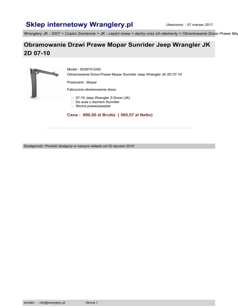 Sklep internetowy Wranglery.pl Utworzono : 07 marzec 2017 Wranglery JK - 2007 > Części Zamienne > JK - części nowe > dachy oraz ich elementy > Obramowanie Drzwi Prawe Mop Obramowanie Drzwi Prawe Mopar Sunrider Jeep Wrangler JK 2D 07-10 Model : 55397412AD Obramowanie Drzwi Prawe Mopar Sunrider Jeep Wrangler JK 2D 07-10 Producent : Mopar Fabryczne obramowanie drzwi. � 07-10 Jeep Wrangler 2-Drzwi (JK) � Do auta z dachem Sunrider � Strona prawe/pasażer Cena : 690,00 zł Brutto ( 565,57 zł Netto) Dostępność: Produkt dostępny w naszym sklepie od 02 styczeń 2010 kontakt : - [email protected] Strona 1