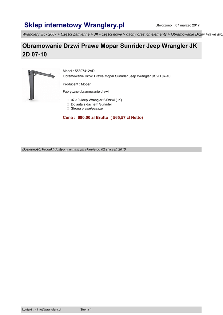 Obramowanie Drzwi Prawe Mopar Sunrider Jeep