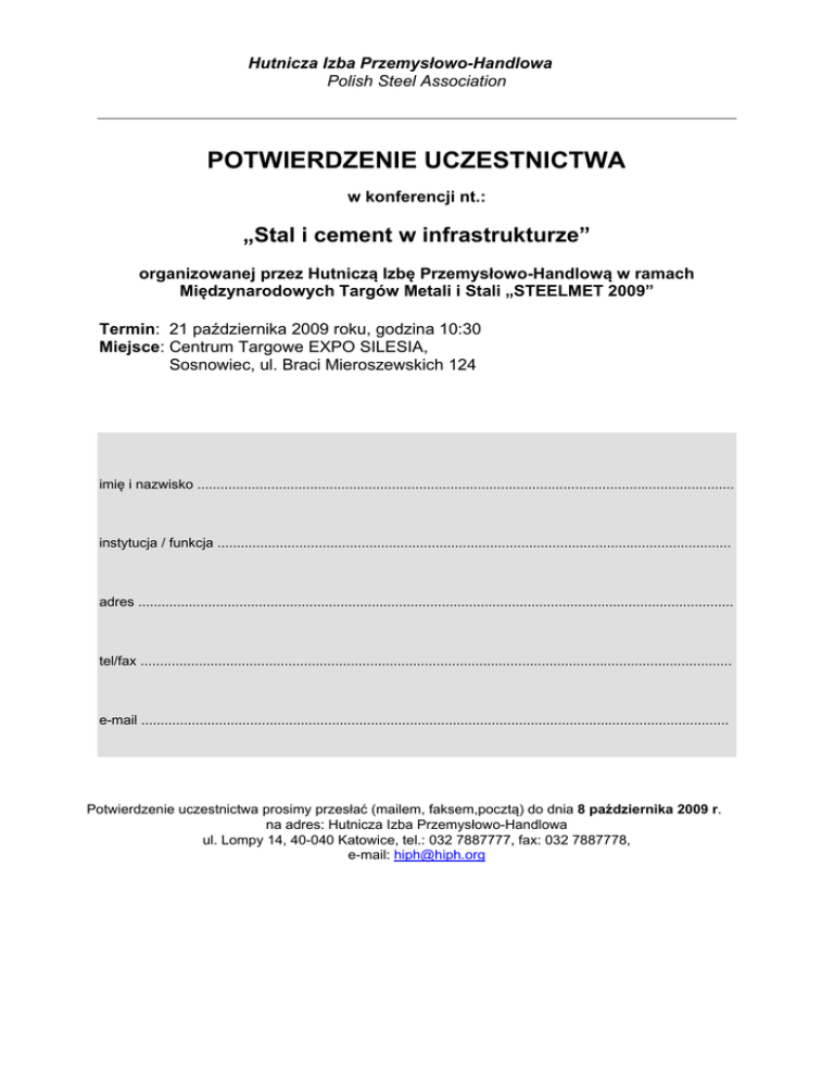 Hutnicza Izba Przemysłowo-Handlowa Polish Steel Association POTWIERDZENIE UCZESTNICTWA w konferencji nt.: „Stal i cement w infrastrukturze” organizowanej przez Hutniczą Izbę Przemysłowo-Handlową w ramach Międzynarodowych Targów Metali i Stali „STEELMET 2009” Termin: 21 października 2009 roku, godzina 10:30 Miejsce: Centrum Targowe EXPO SILESIA, Sosnowiec, ul. Braci Mieroszewskich 124 imię i nazwisko .......................................................................................................................................... instytucja / funkcja .................................................................................................................................... adres ......................................................................................................................................................... tel/fax ........................................................................................................................................................ e-mail ....................................................................................................................................................... Potwierdzenie uczestnictwa prosimy przesłać (mailem, faksem,pocztą) do dnia 8 października 2009 r. na adres: Hutnicza Izba Przemysłowo-Handlowa ul. Lompy 14, 40-040 Katowice, tel.: 032 7887777, fax: 032 7887778, e-mail: [email protected]