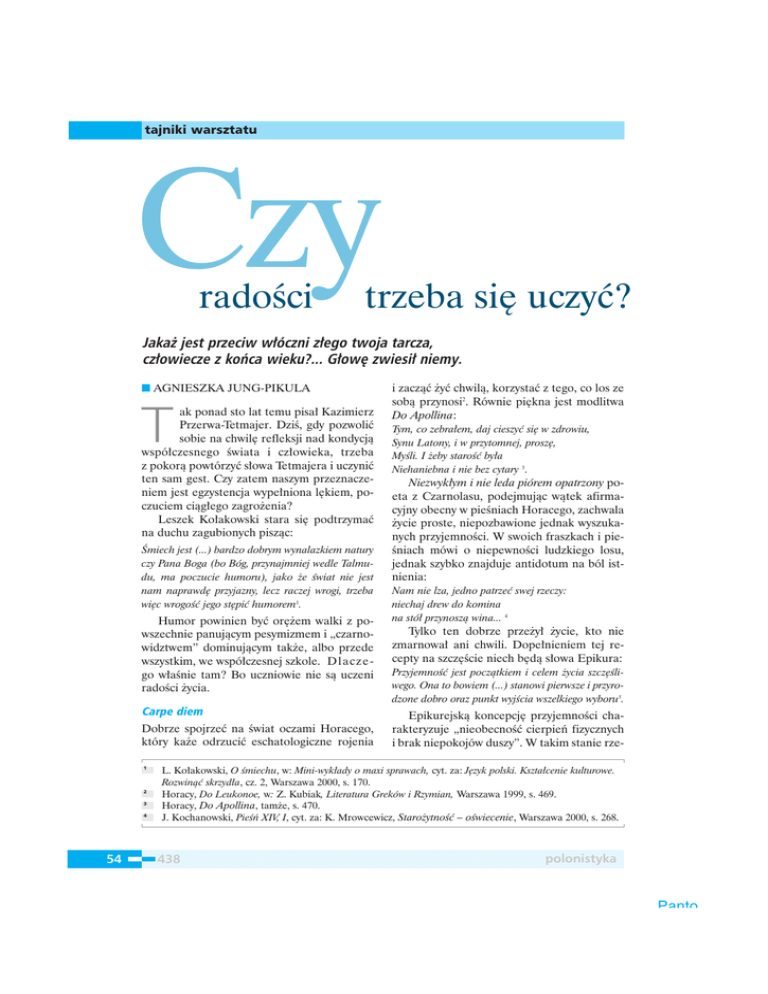 tajniki warsztatu Czy radoÊci trzeba si´ uczyç? Jaka˝ jest przeciw w∏óczni z∏ego twoja tarcza, cz∏owiecze z koƒca wieku?... G∏ow´ zwiesi∏ niemy. ■ AGNIESZKA JUNG-PIKULA T ak ponad sto lat temu pisa∏ Kazimierz Przerwa-Tetmajer. DziÊ, gdy pozwoliç sobie na chwil´ refleksji nad kondycjà wspó∏czesnego Êwiata i cz∏owieka, trzeba z pokorà powtórzyç s∏owa Tetmajera i uczyniç ten sam gest. Czy zatem naszym przeznaczeniem jest egzystencja wype∏niona l´kiem, poczuciem ciàg∏ego zagro˝enia? Leszek Ko∏akowski stara si´ podtrzymaç na duchu zagubionych piszàc: Âmiech jest (...) bardzo dobrym wynalazkiem natury czy Pana Boga (bo Bóg, przynajmniej wedle Talmudu, ma poczucie humoru), jako ˝e Êwiat nie jest nam naprawd´ przyjazny, lecz raczej wrogi, trzeba wi´c wrogoÊç jego st´piç humorem1. Humor powinien byç or´˝em walki z powszechnie panujàcym pesymizmem i „czarnowidztwem” dominujàcym tak˝e, albo przede wszystkim, we wspó∏czesnej szkole. Dl a c z e go w∏aÊnie tam? Bo uczniowie nie sà uczeni radoÊci ˝ycia. Carpe diem Dobrze spojrzeç na Êwiat oczami Horacego, który ka˝e odrzuciç eschatologiczne rojenia 1 2 3 4 54 i zaczàç ˝yç chwilà, korzystaç z tego, co los ze sobà przynosi2. Równie pi´kna jest modlitwa Do Apollina: Tym, co zebra∏em, daj cieszyç si´ w zdrowiu, Synu Latony, i w przytomnej, prosz´, MyÊli. I ˝eby staroÊç by∏a Niehaniebna i nie bez cytary 3. Niezwyk∏ym i nie leda piórem opatrzony poeta z Czarnolasu, podejmujàc wàtek afirmacyjny obecny w pieÊniach Horacego, zachwala ˝ycie proste, niepozbawione jednak wyszukanych przyjemnoÊci. W swoich fraszkach i pieÊniach mówi o niepewnoÊci ludzkiego losu, jednak szybko znajduje antidotum na ból istnienia: Nam nie lza, jedno patrzeç swej rzeczy: niechaj drew do komina na stó∏ przynoszà wina... 4 Tylko ten dobrze prze˝y∏ ˝ycie, kto nie zmarnowa∏ ani chwili. Dope∏nieniem tej recepty na szcz´Êcie niech b´dà s∏owa Epikura: PrzyjemnoÊç jest poczàtkiem i celem ˝ycia szcz´Êliwego. Ona to bowiem (...) stanowi pierwsze i przyrodzone dobro oraz punkt wyjÊcia wszelkiego wyboru5. Epikurejskà koncepcj´ przyjemnoÊci charakteryzuje „nieobecnoÊç cierpieƒ fizycznych i brak niepokojów duszy”. W takim stanie rze- L. Ko∏akowski, O Êmiechu, w: Mini-wyk∏ady o maxi sprawach, cyt. za: J´zyk polski. Kszta∏cenie kulturowe. Rozwinàç skrzyd∏a, cz. 2, Warszawa 2000, s. 170. Horacy, Do Leukonoe, w: Z. Kubiak, Literatura Greków i Rzymian, Warszawa 1999, s. 469. Horacy, Do Apollina, tam˝e, s. 470. J. Kochanowski, Pieʃ XIV, I, cyt. za: K. Mrowcewicz, Staro˝ytnoÊç – oÊwiecenie, Warszawa 2000, s. 268. 438 polonistyka Panto tajniki warsztatu czywiÊcie nietrudno chwaliç ˝ycie we wszystkich jego przejawach. Aby nie dopuÊciç do zbyt frenetycznego zach∏yÊni´cia si´ radoÊcià ˝ycia, dobrze jeszcze przytoczyç fragment z Anakreonta: PrzynieÊ nam tu czar´, ch∏opcze, Chc´ popijaç jednym duszkiem! Do dziesi´ciu kubków wody Pi´ç zaledwie dolej wina, Bym w bakchicznym uniesieniu Móg∏ zachowaç jakàÊ miar´ 6. Pochwa∏a prostoty i powszednioÊci Upijanie si´ winem ˝ycia to jeden z mo˝liwych rodzajów afirmacji. Innego dostarcza postaç Êw. Franciszka. Ten, jak sam siebie nazywa∏, „Bo˝y weso∏ek” z politowaniem patrzy∏ na wczesnoÊredniowiecznych Êwi´tych ascetów, którzy g∏osili chwa∏´ bo˝à, wyrzekajàc si´ wszelkich radoÊci i drobnych, prostych, ludzkich przyjemnoÊci. Nauk´ Êw. Franciszka wyró˝nia∏a mi∏oÊç do Êwiata i radoÊç ˝ycia. Wszystko zosta∏o stworzone przez Boga i jako takie godne by∏o uwielbienia. Radosny Êwi´ty uwa˝a∏ te˝, ˝e ubóstwo wcale nie musi wiàzaç si´ z cierpieniem. Âwiat zosta∏ stworzony tak, aby nawet ubogi móg∏ czuç si´ szcz´Êliwy. Szcz´Êciem napawajà go ma∏e, proste przyjemnoÊci i radoÊci dnia powszedniego. Podobnie rzecz ma si´ w wierszu Anny Âwirszczyƒskiej Skàd wziàç z∏oty aksamit.. Jedzenie truskawek przywodzi na myÊl akt mi∏osny – sprawia rozkosz, daje zapomnienie. Wszystkie niepokoje rozp∏ywajà si´ w smaku i zapachu tych owoców. Tak niezwyk∏a przyjemnoÊç, bardzo trudna do opisania, wymaga wi´c szlachetnej materii, jakà jest z∏oty aksamit. W tytule wiersza pobrzmiewa pewna nuta dramatyzmu – jedzàca truskawki nie jest pewna, skàd wziàç z∏oty aksamit. Bez odpowiedzi przeto pozostaje pytanie o mo˝liwoÊç lub brak mo˝liwoÊci wyra˝enia „niewyra˝alnego.” 5 6 7 8 przy cichej ulicy. By∏oby tam ciep∏o, ciasno, ale mi∏o, du˝o by si´ spa∏o, cz´sto by si´ pi∏o8. Chwila w takim miejscu pozwala na niczym nie zmàconà radoÊç ˝ycia, ˝ycia prostego, z dala od zgie∏ku wielkiego miasta. Najbardziej jednak z prostych rzeczy potrafi si´ cieszyç Miron Bia∏oszewski. Hymniczna apostrofa otwierajàca Szare eminencje zachwytu przywodzi na myÊl rzecz wielkà i donios∏à. Tymczasem okazuje si´, ˝e sakralizacji ulega zwyk∏a ∏y˝ka cedzakowa. Podobnie rzecz si´ ma z piecem. Bia∏oszewski dostrzega w nim pi´kno, na które zwykle pozostaje si´ oboj´tnym. Te zwyczajne z pozoru przedmioty: piec podobny do bramy triumfalnej, ∏y˝ka czy b∏ogos∏awiona pod∏oga, sk∏adajà si´ na prostà, zwyczajnà codziennoÊç. Jest ona êród∏em niekoƒczàcej si´ radoÊci, a przedmioty tworzà bezpieczny azyl, w którym poeta spokojnie mo˝e cieszyç si´ ˝yciem. Ogrody radoÊci Zachwyt nad pi´knem otaczajàcego Êwiata pojawia si´ i w tak doÊç szczególnych okolicznoÊciach, jak w opowiadaniu Gustawa Herlinga-Grudziƒskiego Wie˝a. Odizolowany w swo- Epikur, List do Menoikeusa, w: Diogenes Laertios, ˚ywoty i poglàdy s∏ynnych filozofów, Warszawa 1982, s. 121-135. Anakreont, PrzynieÊ nam tarcz´, ch∏opcze, cyt. za K. Mrowcewicz, op. cit., s. 186. Zob.: Skarbiec j´zyka, literatury i sztuki. Wypisy z çwiczeniami dla klasy 1 liceum, pod. red. B. Chrzàstow