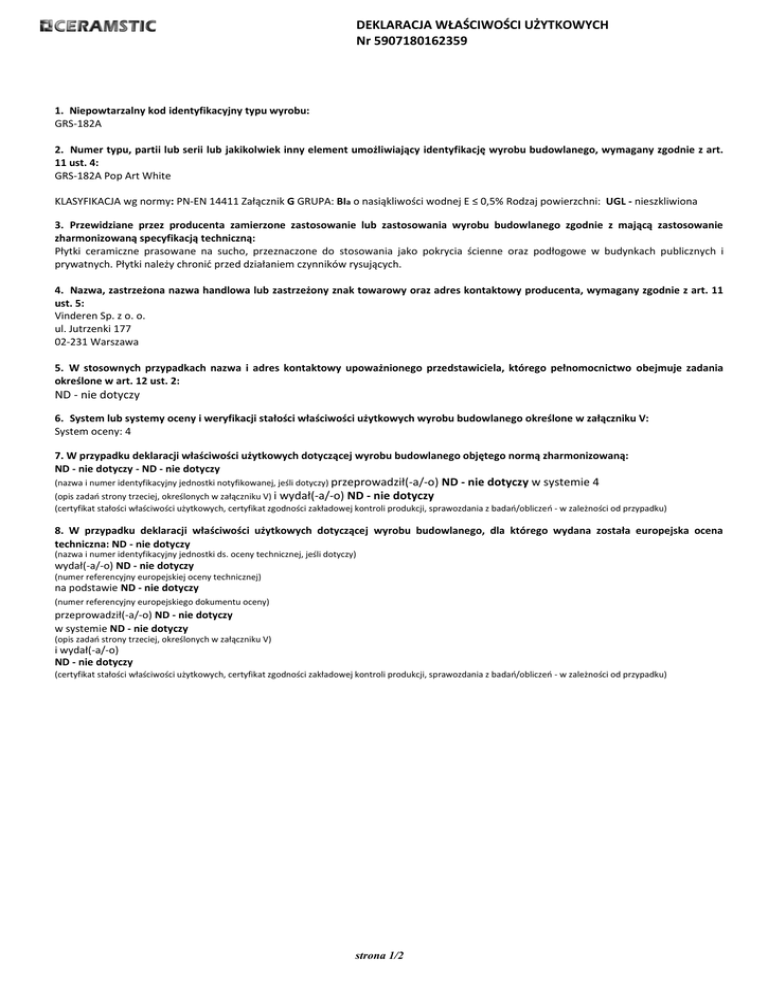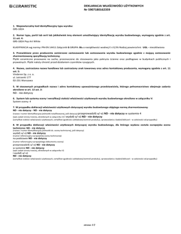 DEKLARACJA WŁAŚCIWOŚCI UŻYTKOWYCH Nr 5907180162359 1. Niepowtarzalny kod identyfikacyjny typu wyrobu: GRS-182A 2. Numer typu, partii lub serii lub jakikolwiek inny element umożliwiający identyfikację wyrobu budowlanego, wymagany zgodnie z art. 11 ust. 4: GRS-182A Pop Art White KLASYFIKACJA wg normy: PN-EN 14411 Załącznik G GRUPA: BIa o nasiąkliwości wodnej E ≤ 0,5% Rodzaj powierzchni: UGL - nieszkliwiona 3. Przewidziane przez producenta zamierzone zastosowanie lub zastosowania wyrobu budowlanego zgodnie z mającą zastosowanie zharmonizowaną specyfikacją techniczną: Płytki ceramiczne prasowane na sucho, przeznaczone do stosowania jako pokrycia ścienne oraz podłogowe w budynkach publicznych i prywatnych. Płytki należy chronić przed działaniem czynników rysujących. 4. Nazwa, zastrzeżona nazwa handlowa lub zastrzeżony znak towarowy oraz adres kontaktowy producenta, wymagany zgodnie z art. 11 ust. 5: Vinderen Sp. z o. o. ul. Jutrzenki 177 02-231 Warszawa 5. W stosownych przypadkach nazwa i adres kontaktowy upoważnionego przedstawiciela, którego pełnomocnictwo obejmuje zadania określone w art. 12 ust. 2: ND - nie dotyczy 6. System lub systemy oceny i weryfikacji stałości właściwości użytkowych wyrobu budowlanego określone w załączniku V: System oceny: 4 7. W przypadku deklaracji właściwości użytkowych dotyczącej wyrobu budowlanego objętego normą zharmonizowaną: ND - nie dotyczy - ND - nie dotyczy (nazwa i numer identyfikacyjny jednostki notyfikowanej, jeśli dotyczy) przeprowadził(-a/-o) ND - nie dotyczy w systemie 4 (opis zadań strony trzeciej, określonych w załączniku V) i wydał(-a/-o) ND - nie dotyczy (certyfikat stałości właściwości użytkowych, certyfikat zgodności zakładowej kontroli produkcji, sprawozdania z badań/obliczeń - w zależności od przypadku) 8. W przypadku deklaracji właściwości użytkowych dotyczącej wyrobu budowlanego, dla którego wydana została europejska ocena techniczna: ND - nie dotyczy (nazwa i numer identyfikacyjny jednostki ds. oceny technicznej, jeśli dotyczy) wydał(-a/-o) ND - nie dotyczy (numer referencyjny europejskiej oceny technicznej) na podstawie ND - nie dotyczy (numer referencyjny europejskiego dokumentu oceny) przeprowadził(-a/-o) ND - nie dotyczy w systemie ND - nie dotyczy (opis zadań strony trzeciej, określonych w załączniku V) i wydał(-a/-o) ND - nie dotyczy (certyfikat stałości właściwości użytkowych, certyfikat zgodności zakładowej kontroli produkcji, sprawozdania z badań/obliczeń - w zależności od przypadku) strona 1/2 DEKLARACJA WŁAŚCIWOŚCI UŻYTKOWYCH Nr 5907180162359 9. Deklarowane właściwości użytkowe. Uwagi do tabeli: 1. Kolumna 1 zawiera wykaz zasadniczych charakterystyk określonych w zharmonizowanych specyfikacjach technicznych dla zamierzonego zastosowania lub zamierzonych zastosowań wskazanych w pkt 3 powyżej. 2. Dla każdej zasadniczej charakterystyki wymienionej w kolumnie 1 i zgodnie z wymaganiami art. 6 kolumna 2 zawiera deklarowane właściwości użytkowe, wyrażone, jako poziom lub klasa, lub w sposób opisowy, powiązane z odpowiednimi zasadniczymi charakterystykami. Zawiera litery „NPD" (właściwości użytkowe nieustalone; ang. No Performance Determined), o ile właściwości użytkowe nie zostały zadeklarowane. 3. Dla każdej zasadniczej charakterystyki wymienionej w kolumnie 1 kolumna 3 zawiera: a) datowane odniesienie do odpowiedniej normy zharmonizowanej oraz w stosownych wypadkach numer referencyjny zastosowanej specjalnej lub odpowiedniej dokumentacji technicznej; lub b) datowane odniesienie do odpowiedniego europejskiego dokumentu oceny, w przypadku, gdy jest on dostępny, oraz numer referencyjny zastosowanej europejskiej oceny technicznej. Nasiąkliwość wodna E [%] E ≤ 0,5 EN14411:2012 Siła łamiąca [N] minimum 1300 EN14411:2012 Odporność na ścieranie szkliwa PEI/ ilość obrotów NPD - właściwości użytkowe nieustalone EN14411:2012 Wytrzymałość na zginanie [N/mm2] ≥ 35 EN14411:2012 Odporność na szok termiczny Odporne EN14411:2012 Mrozoodporność Odporne EN14411:2012 Antypoślizgowość NPD - właściwości użytkowe nieustalone EN14411:2012 Odporność na ogień A1fl EN14411:2012 Odporność na plamienie / zabrudzenia min. klasa 3 EN14411:2012 Promieniotwórczość naturalna [Bq/kg] f1 <= 1, f2 <= 200 EN14411:2012 W przypadku, gdy na podstawie art. 37 lub 38 zastosowana została specjalna dokumentacja techniczna, wymagania, z którymi wyrób jest zgodny: Atest PZH Nr HR/B/65/2012 10. Właściwości użytkowe wyrobu określone w pkt 1 i 2 są zgodne z właściwościami użytkowymi deklarowanymi w pkt 9. Niniejsza deklaracja właściwości użytkowych wydana zostaje na wyłączną odpowiedzialność producenta określonego w pkt 4. W imieniu producenta podpisał(-a) Warszawa, 08.10.2015 strona 2/2