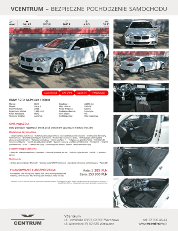 BMW 520d M-Pakiet 190KM Marka: Model: Rok Produkcji: Pojemność silnika : Kolor Nadwozia: Skrzynia biegów: BMW Seria 5 2015 1995 cm3 Biały Automat Przebieg : Moc silnika : Kolor Wnętrza: Rodzaj nadwozia: Ilość drzwi: Rodzaj paliwa: 44850 km 190 KM Czarny Limuzyna 4/5 Olej napędowy OPIS POJAZDU: Data pierwszej rejestracji: 09.06.2015 Dokument sprzedaży: Faktura Vat 23% Dodatkowe Wyposażenie ✓18-calowe felgi aluminiowe ✓Automatycznie przyciemniane wewnętrzne lusterko wsteczne ✓Elektrycznie sterowany fotel kierowcy ✓Elementy dekoracyjne aluminiowe ✓Kierownica wykończona skórą ✓Klimatyzacja automatyczna sterowana elektronicznie ✓Komputer pokładowy ✓Pakiet sportowy M ✓Podgrzewane przednie fotele ✓Reflektory BiXenonowe Aktywne ✓Światła do jazdy dziennej LED ✓System nawigacji satelitarnej Professional ✓Tempomat ✓Czujniki parkowania tył i przód ✓Elektryczne szyby ✓Automatyczna skrzynia biegów ✓Przyciemniane szyby Systemy Bezpieczeństwa ✓Poduszka powietrzna kierowcy i pasażera ✓Poduszki przednie boczne ✓Poduszki tylne boczne ✓ISOFIX ✓Centralny zamek Multimedia ✓Zestaw głośnomówiący Bluetooth ✓Zestaw audio BMW Professional ✓Sportowa kierownica wielofunkcyjna ✓Radio CD FINANSOWANIE I UBEZPIECZENIA: Przykładowa rata miesięczna, wpłata 20%, okres leasingu/kredytu 48 miesięcy, 10% wykupu. Rata leasingu jest wartością netto bez vat. Rata: 1 385 Cena: 153 900 PLN PLN Niniejsza treść nie stanowi oferty w rozumieniu przepisów Kodeksu Cywilnego oraz opisu towaru ani zapewnienia w rozumieniu art. 4 Ustawy z dnia 27 lipca 2002r o szczególnych warunkach sprzedaży konsumenckiej. Powered by TCPDF (www.tcpdf.org)