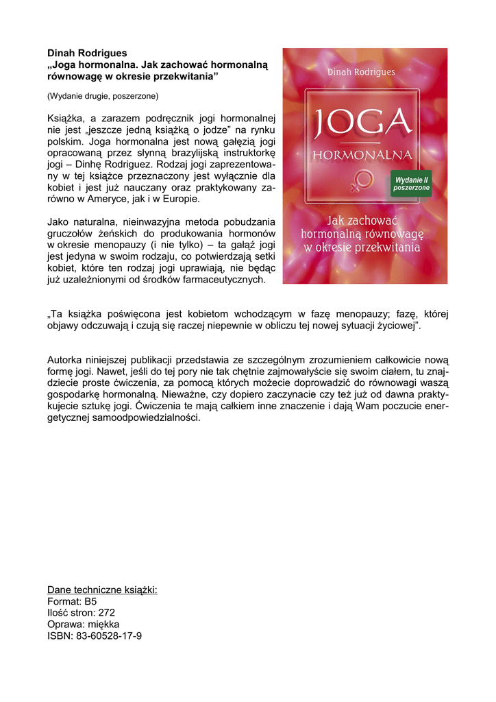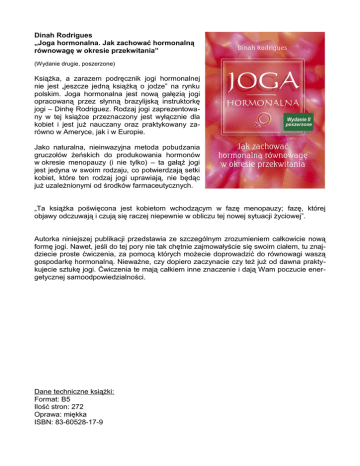 Dinah Rodrigues „Joga hormonalna. Jak zachować hormonalną równowagę w okresie przekwitania” (Wydanie drugie, poszerzone) Książka, a zarazem podręcznik jogi hormonalnej nie jest „jeszcze jedną książką o jodze” na rynku polskim. Joga hormonalna jest nową gałęzią jogi opracowaną przez słynną brazylijską instruktorkę jogi – Dinhę Rodriguez. Rodzaj jogi zaprezentowany w tej książce przeznaczony jest wyłącznie dla kobiet i jest już nauczany oraz praktykowany zarówno w Ameryce, jak i w Europie. Jako naturalna, nieinwazyjna metoda pobudzania gruczołów żeńskich do produkowania hormonów w okresie menopauzy (i nie tylko) – ta gałąź jogi jest jedyna w swoim rodzaju, co potwierdzają setki kobiet, które ten rodzaj jogi uprawiają, nie będąc już uzależnionymi od środków farmaceutycznych. „Ta książka poświęcona jest kobietom wchodzącym w fazę menopauzy; fazę, której objawy odczuwają i czują się raczej niepewnie w obliczu tej nowej sytuacji życiowej”. Autorka niniejszej publikacji przedstawia ze szczególnym zrozumieniem całkowicie nową formę jogi. Nawet, jeśli do tej pory nie tak chętnie zajmowałyście się swoim ciałem, tu znajdziecie proste ćwiczenia, za pomocą których możecie doprowadzić do równowagi waszą gospodarkę hormonalną. Nieważne, czy dopiero zaczynacie czy też już od dawna praktykujecie sztukę jogi. Ćwiczenia te mają całkiem inne znaczenie i dają Wam poczucie energetycznej samoodpowiedzialności. Dane techniczne książki: Format: B5 Ilość stron: 272 Oprawa: miękka ISBN: 83-60528-17-9