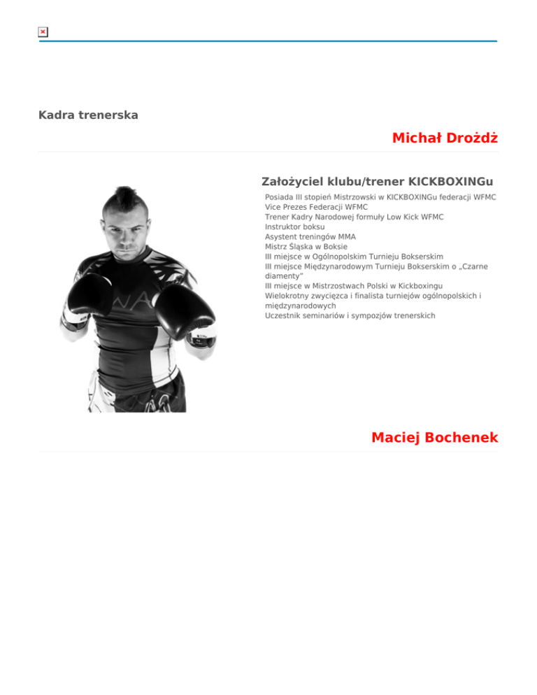 Kadra trenerska Michał Drożdż Założyciel klubu/trener KICKBOXINGu Posiada III stopień Mistrzowski w KICKBOXINGu federacji WFMC Vice Prezes Federacji WFMC Trener Kadry Narodowej formuły Low Kick WFMC Instruktor boksu Asystent treningów MMA Mistrz Śląska w Boksie III miejsce w Ogólnopolskim Turnieju Bokserskim III miejsce Międzynarodowym Turnieju Bokserskim o „Czarne diamenty” III miejsce w Mistrzostwach Polski w Kickboxingu Wielokrotny zwycięzca i finalista turniejów ogólnopolskich i międzynarodowych Uczestnik seminariów i sympozjów trenerskich Maciej Bochenek Trener MMA Instruktor Jiu-Jitsu Posiadacz Niebieskiego Pasa BJJ II Miejsce Otwarty Turniej Seniorów Grappling II Miejsce Międzynarodowy Turniej Full Contact Jiu-Jitsu I Miejsce Turniej Submission Wrestling II Miejsce Rio Grappling Club Meeting Andrzej Kosior Asystent ds. KICKBOXINGu Odpowiedzialny za treningi poranne Uczestnik międzynarodowych szkoleń i seminariów Piotr Jendryś Asystent ds. KICKBOXINGu Odpowiedzialny za treningi poranne Uczestnik międzynarodowych szkoleń i seminariów Paweł Popek Asystent ds. KICKBOXINGu Uczestnik międzynarodowych szkoleń i seminariów