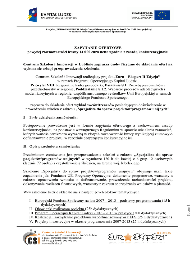 Projekt „EURO-EKSPERT II Edycja” współfinansowany jest ze środków Unii Europejskiej w ramach Europejskiego Funduszu Społecznego ZAPYTANIE OFERTOWE powyżej równowartości kwoty 14 000 euro netto zgodnie z zasadą konkurencyjności Centrum Szkoleń i Innowacji w Lublinie zaprasza osoby fizyczne do składania ofert na wykonanie usługi przeprowadzenia szkolenia. Centrum Szkoleń i Innowacji realizujący projekt „Euro – Ekspert II Edycja” w ramach Programu Operacyjnego Kapitał Ludzki, Priorytet VIII. Regionalne kadry gospodarki, Działanie 8.1. Rozwój pracowników i przedsiębiorstw w regionie, Poddziałanie 8.1.2. Wsparcie procesów adaptacyjnych i modernizacyjnych w regionie, współfinansowanego ze środków Unii Europejskiej w ramach Europejskiego Funduszu Społecznego, zaprasza do składania ofert wykładowców/trenerów posiadających doświadczenie w prowadzeniu szkoleń z zakresu „Specjalista do spraw projektów/programów unijnych”. I Tryb udzielenia zamówienia: Postępowanie prowadzone jest w formie zapytania ofertowego z zachowaniem zasady konkurencyjności, na podstawie wewnętrznego Regulaminu w sprawie udzielania zamówień, których wartość przekracza wyrażoną w złotych równowartość kwoty wynikającej z umowy o dofinansowanie projektu, w rozdziale dotyczącym konkurencyjności. II Opis przedmiotu zamówienia: Przedmiotem zamówienia jest przeprowadzenie szkoleń z zakresu „Specjalista do spraw projektów/programów unijnych” w wymiarze 120 h dla każdej z 6 grup 12 osobowych (łącznie 72 osoby) z częstotliwością 5h/dzień, na terenie woj. lubelskiego. Szkolenie „Specjalista do spraw projektów/programów unijnych” obejmuje m.in. takie zagadnienia jak: Fundusze UE, Programy Operacyjne, dokumenty programowe, warsztaty z zakresu opracowania wniosku o dofinansowanie, prowadzenie rachunkowości projektu, dokonywanie rozliczeń finansowych, warsztaty z zakresu sporządzania wniosków o płatność. Centrum Szkoleń i Innowacji ul. Krakowskie Przedmieście 21, 20-002 Lublin e-mail: [email protected] tel. 81 534 60 98; 505 465 100 www.csi.lublin.pl Strona I. Europejski Fundusz Społeczny na lata 2007 – 2013 – podstawy programowania (15 h dydaktycznych) II. Obowiązki realizatora projektu (25h dydaktycznych) III. Program Operacyjny Kapitał Ludzki 2007 – 2013 w praktyce (30h dydaktycznych) IV. Realizacja i zarządzanie projektami współfinansowanymi z EFS (25 h dydaktycznych) V. Projekty inwestycyjne w okresie programowania 2007-2013 (25 h dydaktycznych) 1 W/w szkolenie będzie składało się z następujących bloków tematycznych: Projekt „EURO-EKSPERT II Edycja” współfinansowany jest ze środków Unii Europejskiej w ramach Europejskiego Funduszu Społecznego Dokładny program szkolenia stanowi Załącznik nr 4 do niniejszego zapytania ofertowego. Do zadań trenera będzie należeć: Opracowanie prezentacji na szablonach przekazanych przez Zamawiającego; Sporządzenie dokumentacji z odbytego szkolenia na wzorach przekazanych przez Zamawiającego (m.in. listy obecności, dzienniki zajęć); Osobiste prowadzenie szkolenia w ustalonym miejscu i terminie (zgodnie z harmonogramem), a w razie wystąpienia obiektywnych przesłanek uniemożliwiających poprowadzenie warsztatu, poinformowanie o tym Zamawiającego na min. 7 dni przed wyznaczonym terminem i wyznaczenie zastępstwa; Poinformowanie uczestników szkolenia o współfinansowaniu projektu ze środków Unii Europejskiej w ramach Europejskiego Funduszu Społecznego. Zamawiający przewiduje możliwość składania ofert częściowych w ramach poniższych części, według poszczególnych bloków tematycznych, w zależności od dogodności terminów odbywania się zajęć: Część I Prowadzenie szkolenia z zakresu „Specjalista do spraw projektów/programów unijnych” blok tematyczny: Europejski Fundusz Społeczny na lata 2007 – 2013 – podstawy programowania (15 h dydaktycznych) – grupa 1/I-E/EEII/CSI Termin: kwiecień - maj 2011 r Część II Prowadzenie szkolenia z zakresu „Specjalista do spraw projektów/programów unijnych” blok tematyczny: Obowiązki realizatora projektu (25h dydaktycznych) - grupa 1/I-E/EEII/CSI Termin: kwiecień - maj 2011 r Część III Prowadzenie szkolenia z zakresu „Specjalista do spraw projektów/programów unijnych” blok tematyczny: Program Operacyjny Kapitał Ludzki 2007 – 2013 w praktyce (30h dydaktycznych) - grupa 1/I-E/EEII/CSI Termin: kwiecień - maj 2011 r Strona 2 Część IV Prowadzenie szkolenia z zakresu „Specjalista do spraw projektów/programów unijnych” blok tematyczny: Realizacja i zarządzanie projektami współfinansowanymi z EFS (25 h dydaktycznych) – grupa 1/I-E/EEII/CSI Termin: kwiecień - maj 2011 r Centrum Szkoleń i Innowacji ul. Krakowskie Przedmieście 21, 20-002 Lublin e-mail: [email protected] tel. 81 534 60 98; 505 465 100 www.csi.lublin.pl Projekt „EURO-EKSPERT II Edycja” współfinansowany jest ze środków Unii Europejskiej w ramach Europejskiego Funduszu Społecznego Część V Prowadzenie szkolenia z zakresu „Specjalista do spraw projektów/programów unijnych” blok tematyczny: Projekty inwestycyjne w okresie programowania 2007-2013 (25 h dydaktycznych) – grupa 1/I-E/EEII/CSI Termin: kwiecień - maj 2011 r Część VI Prowadzenie szkolenia z zakresu „Specjalista do spraw projektów/programów unijnych” blok tematyczny: Europejski Fundusz Społeczny na lata 2007 – 2013 – podstawy programowania (15 h dydaktycznych) – grupa 2/I-E/EEII/CSI Termin: kwiecień - maj 2011 r Część VII Prowadzenie szkolenia z zakresu „Specjalista do spraw projektów/programów unijnych” blok tematyczny: Obowiązki realizatora projektu (25h dydaktycznych) - grupa 2/I-E/EEII/CSI Termin: kwiecień - maj 2011 r Część VIII Prowadzenie szkolenia z zakresu „Specjalista do spraw projektów/programów unijnych” blok tematyczny: Program Operacyjny Kapitał Ludzki 2007 – 2013 w praktyce (30h dyd
