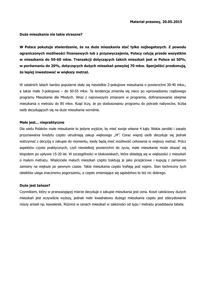 Materiał prasowy, 20.05.2015 Duże mieszkania nie