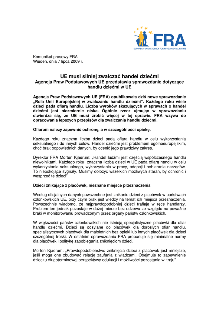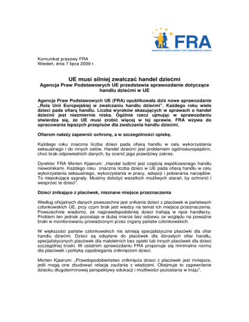 Komunikat prasowy FRA Wiedeń, dnia 7 lipca 2009 r. UE musi silniej zwalczać handel dziećmi Agencja Praw Podstawowych UE przedstawia sprawozdanie dotyczące handlu dziećmi w UE Agencja Praw Podstawowych UE (FRA) opublikowała dziś nowe sprawozdanie „Rola Unii Europejskiej w zwalczaniu handlu dziećmi”. Każdego roku wiele dzieci pada ofiarą handlu. Liczba wyroków skazujących w sprawach o handel dziećmi jest niezmiernie niska. Ogólnie rzecz ujmując w sprawozdaniu stwierdza się, że UE musi zrobić więcej w tej sprawie. FRA wzywa do opracowania lepszych przepisów dla zwalczania handlu dziećmi. Ofiarom należy zapewnić ochronę, a w szczególności opiekę. Każdego roku znaczna liczba dzieci pada ofiarą handlu w celu wykorzystania seksualnego i do innych celów. Handel dziećmi jest problemem ogólnoeuropejskim, choć brak odpowiednich danych, by ocenić jego prawdziwy zakres. Dyrektor FRA Morten Kjaerum: „Handel ludźmi jest częścią współczesnego handlu niewolnikami. Każdego roku znaczna liczba dzieci w UE pada ofiarą handlu w celu wykorzystania seksualnego, wykorzystania w pracy, adopcji i pobierania narządów. To niepokojące sygnały. Musimy dołożyć wszelkich możliwych starań, by ochronić i wesprzeć te dzieci”. Dzieci znikające z placówek, nieznane miejsce przeznaczenia Według oficjalnych danych powszechne jest znikanie dzieci z placówek w państwach członkowskich UE, przy czym brak jest wiedzy na temat ich miejsca przeznaczenia. Powszechnie wiadomo, że najprawdopodobniej dzieci trafiają w ręce handlarzy. Problem ten jednak pozostaje w dużej mierze bez odzewu ze względu na poważne braki w monitorowaniu prowadzonym przez organy państw członkowskich. W większości państw członkowskich nie istnieją specjalistyczne placówki dla ofiar handlu dziećmi. Dzieci są odsyłane do placówek dla dorosłych ofiar handlu, specjalistycznych placówek dla małoletnich bez opieki lub innych placówek dla dzieci szczególnej troski. W ostatnim sprawozdaniu FRA proponuje się minimalne normy dla placówek i politykę zapobiegania zniknięciom dzieci. Morten Kjaerum: „Prawdopodobieństwo zniknięcia dzieci z placówek jest mniejsze, jeśli mogą one zbudować relację zaufania z władzami. Obejmuje to zapewnienie dziecku długoterminowej perspektywy edukacji i możliwości pozostania w kraju”. Identyfikacja ofiar ma podstawowe znaczenie dla ścigania przestępstw Często ofiary handlu dziećmi nie są prawidłowo identyfikowane jako ofiary, natomiast identyfikacja ofiar ma podstawowe znaczenie przy ściganiu handlarzy. Dostępne dane wskazują, że istnieje bardzo mało przypadków skazania handlarzy w sprawach o handel dziećmi. W latach 2000–2007 r. przypadki skazania zarejestrowano jedynie w 4 państwach członkowskich. Sprawozdanie FRA określa dobre praktyki w zakresie identyfikacji ofiar w Finlandii i Czechach. Te dobre praktyki powinny stanowić podstawę opracowania i wdrożenia ogólnoeuropejskich minimalnych norm. Morten Kjaerum: „Bez udoskonalenia identyfikacji ofiar i skazywania sprawców przepisy stworzone z myślą o uniemożliwianiu handlu dziećmi i ochronie ofiar będą nadal istniały tylko na papierze". Minimalne normy wymagane w celu zwiększenia ochrony ofiar „Choć dzieci będące przedmiotem handlu są w oczywisty sposób ofiarami, często traktowane są jak przestępcy. Niedopuszczalne, by dzieci, które są ofiarami handlu, były uznawane za osoby łamiące prawo, a nawet zatrzymywane", dodał Morten Kjaerum. W niektórych państwach członkowskich ofiary handlu dziećmi spotyka areszt w związku z nielegalnym przekraczaniem granicy i innymi działaniami niezgodnymi z prawem, jak prostytucja. Przepisy europejskie powinny zatem zapewnić minimalne normy w odniesieniu do polityki niekarania ofiar handlu dziećmi. Pozwoliłoby to również zwiększyć zaufanie do organów państwowych, a jednocześnie nie pozostawiałoby ofiar zależnych od ich handlarzy. „W tym kontekście Agencja Praw Podstawowych UE z radością przyjmuje powstały tej wiosny wniosek Komisji EU w sprawie zwalczania handlu ludźmi. Silnie zalecam Radzie przyjęcie tego wniosku, który mógłby być znaczącym krokiem naprzód w UE w zwalczaniu handlu ludźmi. Jeśli chodzi o dzieci, będą konieczne dodatkowe kroki, ponieważ dzieci są szczególnie bezbronne i tym samym wymagają szczególnej uwagi i opieki”. Sprawozdanie FRA jest dostępne pod adresem: http://fra.europa.eu W razie jakichkolwiek pytań prosimy o kontakt z Waltrud Heller E-mail: [email protected] Tel.: +43 158 030 642 Uwagi dla redaktorów.: Agencja Praw Podstawowych Unii Europejskiej została ustanowiona w marcu 2007 r. w Wiedniu w Austrii. Agencja pełni trzy kluczowe funkcje: gromadzenie informacji i danych na temat praw podstawowych; doradztwo w UE i jej państwach członkowskich; promowanie dialogu ze społeczeństwem obywatelskim w celu zwiększenia społecznej świadomości na temat praw podstawowych. Zobacz http://fra.europa.eu W dniu 25 marca 2009 r. Komisja Europejska przyjęła wniosek w sprawie zwalczania handlu ludźmi. W dokumencie tym przybliża się krajowe przepisy i kary, a także dąży do stawiania sprawców przed sądem, nawet jeśli przestępstwa popełniono za granicą. Ofiary otrzymają zakwaterowanie, opiekę medyczną, a w razie konieczności - ochronę policji, by mogły dojść do siebie w trudnej sytuacji i nie bały się zeznawać przeciwko sprawcom. Będą one chronione przed dalszymi urazami psychicznymi w trakcie postępowania karnego, które pojawiają się na przykład w związku z dociekliwymi pytaniami o ich doświadczenia związane z wymuszonymi usługami seksualnymi. Ofiary otrzymają bezpłatną pomoc prawną w trakcie całego postępowania, w tym dla celów ubiegania się o odszkodowanie finansowe. We wniosku zachęca się do karania klientów osób zmuszonych do świadczenia usług seksualnych i pracowników wykorzystujących osoby, któ