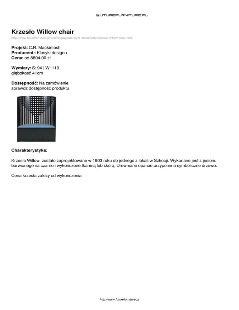 Krzesło Willow chair http://www.futurefurniture.pl/pl/offer/projektanci/cr-mackintosh/krzeslo-willow-chair.html/ Projekt: C.R. Mackintosh Producent:: Klasyki designu Cena: od 8804.00 zł Wymiary: S: 94 | W: 119 głębokość 41cm Dostępność: Na zamówienie sprawdź dostępność produktu Charakterystyka: Krzesło Willow zostało zaprojektowane w 1903 roku do jednego z lokali w Szkocji. Wykonane jest z jesionu barwionego na czarno i wykończone tkaniną lub skórą. Drewniane oparcie przypomina symboliczne drzewo. Cena krzesła zależy od wykończenia http://www.futurefurniture.pl http://www.futurefurniture.pl Zdjęcia produktu: http://www.futurefurniture.pl Powered by TCPDF (www.tcpdf.org)