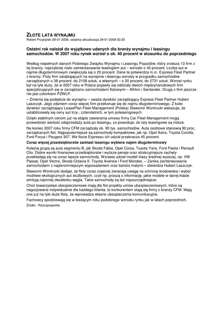 ZŁOTE LATA WYNAJMU Robert Przybylski 29-01-2008, ostatnia aktualizacja 29-01-2008 02:30 Ostatni rok należał do wyjątkowo udanych dla branży wynajmu i leasingu samochodów. W 2007 roku rynek wzrósł o ok. 40 procent w stosunku do poprzedniego Według niepełnych danych Polskiego Związku Wynajmu i Leasingu Pojazdów, który zrzesza 13 firm z tej branży, najszybciej rosło zainteresowanie leasingiem aut – wzrosło o 40 procent. Liczba aut w najmie długoterminowym zwiększyła się o 20 procent. Dane te potwierdza m.in. Express Fleet Partner z branży. Floty firm zarabiających na wynajmie i leasingu wzrosły w przypadku samochodów zarządzanych o 38 procent, do 2108 sztuk, a własnych – o 20 procent, do 2731 sztuk. Wzrost rynku był na tyle duży, że w 2007 roku w Polsce pojawiły się oddziały dwóch międzynarodowych firm specjalizujących się w zarządzaniu samochodami flotowymi – Athlon i Santander. Druga z firm jeszcze nie jest członkiem PZWLP. – Zmienia się podejście do wynajmu – uważa dyrektor zarządzający Express Fleet Partner Hubert Laszczyk. Jego zdaniem coraz więcej firm przekonuje się do najmu długoterminowego. Z kolei dyrektor zarządzający LeasePlan Fleet Management (Polska) Sławomir Wontrucki wskazuje, że ustabilizowały się ceny aut trzy-, czteroletnich, w tym poleasingowych. Dzięki stabilnym cenom już na etapie zawierania umowy firmy Car Fleet Management mogą przewidzieć wartość odsprzedaży auta po leasingu, co powoduje, że raty leasingowe są niższe. Na koniec 2007 roku firmy CFM zarządzały ok. 95 tys. samochodów. Auta osobowe stanowią 90 proc. zarządzanych flot. Najpopularniejsze są samochody kompaktowe, jak np. Opel Astra, Toyota Corolla, Ford Focus i Peugeot 307. We flocie Expressu ich udział przekracza 45 procent. Coraz więcej przedsiębiorstw zamiast leasingu wybiera najem długoterminowy Kolejną grupą są auta segmentu B, jak Skoda Fabia, Opel Corsa, Toyota Yaris, Ford Fiesta i Renault Clio. Dobre wyniki finansowe przedsiębiorstw i wyższe pensje oraz atrakcyjniejsze zachęty przekładają się na coraz lepsze samochody. Wzrasta udział modeli klasy średniej wyższej, np. VW Passat, Opel Vectra, Skoda Octavia II, Toyota Avensis i Ford Mondeo. – Zanika zainteresowanie samochodami z najskromniejszym wyposażeniem oraz bardzo małymi – stwierdza Hubert Laszczyk. Sławomir Wontrucki dodaje, że floty coraz częściej zwracają uwagę na ochronę środowiska i wybór możliwie ekologicznych aut służbowych, czyli np. proszą o informację, jakie modele w danej klasie emitują najmniej dwutlenku węgla. Takie samochody są też najoszczędniejsze. Choć towarzystwa ubezpieczeniowe mają dla flot projekty umów ubezpieczeniowych, które są negocjowane indywidualnie dla każdego klienta, to konkurentem stają się firmy z branży CFM. Mają one już na tyle duże floty, że wprowadza własne ubezpieczenia komunikacyjne. Fachowcy spodziewają się w bieżącym roku podobnego wzrostu rynku jak w latach poprzednich. Źródło : Rzeczpospolita