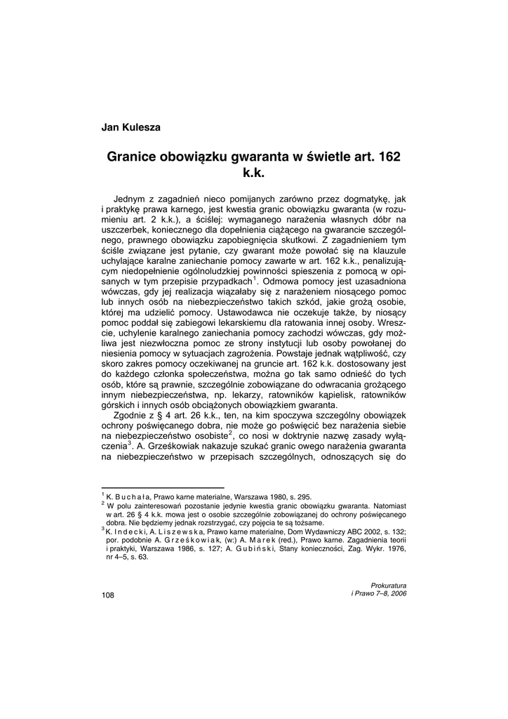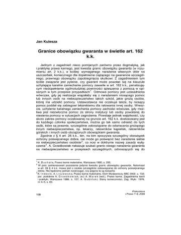 J. Kulesza Jan Kulesza Granice obowiązku gwaranta w świetle art. 162 k.k. Jednym z zagadnień nieco pomijanych zarówno przez dogmatykę, jak i praktykę prawa karnego, jest kwestia granic obowiązku gwaranta (w rozumieniu art. 2 k.k.), a ściślej: wymaganego narażenia własnych dóbr na uszczerbek, koniecznego dla dopełnienia ciążącego na gwarancie szczególnego, prawnego obowiązku zapobiegnięcia skutkowi. Z zagadnieniem tym ściśle związane jest pytanie, czy gwarant może powołać się na klauzule uchylające karalne zaniechanie pomocy zawarte w art. 162 k.k., penalizującym niedopełnienie ogólnoludzkiej powinności spieszenia z pomocą w opisanych w tym przepisie przypadkach 1 . Odmowa pomocy jest uzasadniona wówczas, gdy jej realizacja wiązałaby się z narażeniem niosącego pomoc lub innych osób na niebezpieczeństwo takich szkód, jakie grożą osobie, której ma udzielić pomocy. Ustawodawca nie oczekuje także, by niosący pomoc poddał się zabiegowi lekarskiemu dla ratowania innej osoby. Wreszcie, uchylenie karalnego zaniechania pomocy zachodzi wówczas, gdy możliwa jest niezwłoczna pomoc ze strony instytucji lub osoby powołanej do niesienia pomocy w sytuacjach zagrożenia. Powstaje jednak wątpliwość, czy skoro zakres pomocy oczekiwanej na gruncie art. 162 k.k. dostosowany jest do każdego członka społeczeństwa, można go tak samo odnieść do tych osób, które są prawnie, szczególnie zobowiązane do odwracania grożącego innym niebezpieczeństwa, np. lekarzy, ratowników kąpielisk, ratowników górskich i innych osób obciążonych obowiązkiem gwaranta. Zgodnie z § 4 art. 26 k.k., ten, na kim spoczywa szczególny obowiązek ochrony poświęcanego dobra, nie może go poświęcić bez narażenia siebie na niebezpieczeństwo osobiste 2 , co nosi w doktrynie nazwę zasady wyłączenia 3 . A. Grześkowiak nakazuje szukać granic owego narażenia gwaranta na niebezpieczeństwo w przepisach szczególnych, odnoszących się do 1 K. B u c h a ł a, Prawo karne materialne, Warszawa 1980, s. 295. W polu zainteresowań pozostanie jedynie kwestia granic obowiązku gwaranta. Natomiast w art. 26 § 4 k.k. mowa jest o osobie szczególnie zobowiązanej do ochrony poświęcanego dobra. Nie będziemy jednak rozstrzygać, czy pojęcia te są tożsame. 3 K. I n d e c k i, A. L i s z e w s k a, Prawo karne materialne, Dom Wydawniczy ABC 2002, s. 132; por. podobnie A. G r z e ś k o w i a k, (w:) A. M a r e k (red.), Prawo karne. Zagadnienia teorii i praktyki, Warszawa 1986, s. 127; A. G u b i ń s k i, Stany konieczności, Zag. Wykr. 1976, nr 4–5, s. 63. 2 108 Prokuratura i Prawo 7–8, 2006 Granice obowiązku gwaranta... funkcjonowania określonych zawodów bądź w deontologii zawodowej 4 . Istnienia klauzuli wyłączenia zdaje się natomiast nie zauważać P. Konieczniak twierdząc, że w zakresie narażania na niebezpieczeństwo własnych dóbr, obowiązek gwaranta nie różni się od obowiązku powszechnego 5 . S. Cypin pisał swego czasu, iż istnienie klauzuli wyłączenia oznacza „obowiązek zniesienia grożącej szkody” 6 , jednak gwarant nie musi oczywiście „dać się zabić” w obronie tego dobra, ale musi przynajmniej „wystawić” własne dobra osobiste na niebezpieczeństwo, czyli narazić się na niebezpieczeństwo utraty życia, uszczerbku na zdrowiu, naruszenia nietykalności cielesnej, pozbawienia wolności, naruszenia czci 7 , przy czym niebezpieczeństwo to nie musi wcale charakteryzować się bezpośredniością 8 . Natomiast W. Wolter stwierdza, że dla osób tych dobra, które mają obowiązek chronić, są dobrami wyższej wartości, niż ich własne życie, ciało i zdrowie 9 . Zdaniem M. Filara, nie stanowi niebezpieczeństwa osobistego zagrożenie dla dóbr o charakterze majątkowym 10 . O ile teza ta nie budzi wątpliwości, jeśli odniesiemy ją ściśle do znaczenia „niebezpieczeństwa osobistego”, o tyle nie można wyciągać z niej dalej idących wniosków, które wpływałyby na wykładnię art. 26 § 4 k.k. W przepisie tym mowa jest bowiem o tym, że sprawca ma obowiązek chronić określone dobra nawet z narażeniem się na niebezpieczeństwo osobiste, co oznacza, że może też zajść sytuacja, w której będzie musiał poświęcić jedynie dobra o charakterze majątkowym. Narażenie na niebezpieczeństwo osobiste stanowi jedynie przesunięcie górnej granicy wymaganego poświęcenia, natomiast dolna granica nie ulega przez to zmianie. 4 A. G r z e ś k o w i a k, (w:) A. M a r e k (red.), Prawo…, s. 127. P. K o n i e c z n i a k, Czyn jako podstawa odpowiedzialności w prawie karnym, Kantor Wydawniczy Zakamycze, Kraków 2002, s. 306–307. 6 S. C y p i n, hasło „Konieczność wyższa”, (w:) W. M a k o w s k i (red.), Encyklopedia podręczna prawa karnego, t. II, Warszawa, około 1938, s. 748. M. F i l a r głosi pogląd dokładnie przeciwny, zgodnie z którym gwarant nie ma obowiązku poddania się skutkowi wynikającemu z niebezpieczeństwa [M. F i l a r, (w:) O. G ó r n i o k (red.), Kodeks karny. Komentarz, Warszawa 2004, s. 83]. 7 A. W ą s e k, Kodeks karny. Komentarz, t. I, Gdańsk 1999, s. 352; por. podobnie: W. W o l t e r, Nauka o przestępstwie, Warszawa 1973, s. 183; M. F i l a r, Wyłączenie odpowiedzialności karnej, (w:) Nowa kodyfikacja karna. Kodeks karny, Krótkie komentarze, z. 18, Warszawa 1998, s. 29; t e n ż e, (w:) O. G ó r n i o k (red.), Kodeks..., s. 83. K. B u c h a ł a czyni rozróżnienie na praktycznie zachodzące niebezpieczeństwo śmierci, uszkodzenia ciała, utraty zdrowia i raczej teoretyczne zagrożenie dla innych dóbr osobistych: wolności, czci, godności (K. B u c h a ł a, Prawo..., s. 293–294). 8 E. Z i e l i ń s k a, Odpowiedzialność zawodowa lekarza i jej stosunek do odpowiedzialności karnej, Warszawa 2001, s. 360; por. podobnie: K. B u c h a ł a, Prawo..., s. 266. 9 W. W o l t e r, Nauka..., s. 183. 10 M. F i l a r, (w:) O. G ó r n i o k (red.), Ko