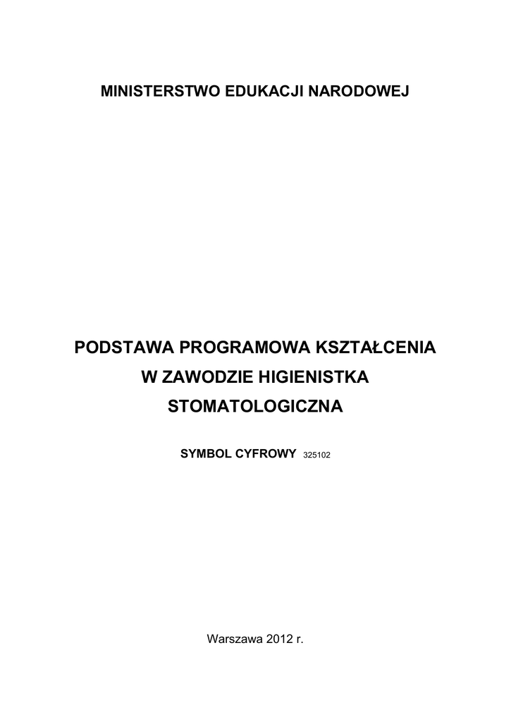 MINISTERSTWO EDUKACJI NARODOWEJ PODSTAWA PROGRAMOWA KSZTAŁCENIA W ZAWODZIE HIGIENISTKA STOMATOLOGICZNA SYMBOL CYFROWY 325102 Warszawa 2012 r. I. CELE KSZTAŁCENIA W ZAWODZIE Absolwent szkoły kształcącej w zawodzie higienistka stomatologiczna powinien być przygotowany do wykonywania następujących zadań zawodowych: 1) przygotowania gabinetu i stanowiska pracy lekarza dentysty oraz bieŜącej konserwacji sprzętu; 2) organizowania prac związanych ze świadczeniem usług z zakresu stomatologii; 3) wykonywania czynności administracyjnych i prowadzenie dokumentacji związanej z funkcjonowaniem gabinetu dentystycznego; 4) wykonywania wstępnych badań stomatologicznych i zabiegów profilaktyczno-leczniczych pod nadzorem i na zlecenie lekarza dentysty; 5) prowadzenia stomatologicznej edukacji zdrowotnej i promocji zdrowia w róŜnych środowiskach. II. EFEKTY KSZTAŁCENIA Do wykonywania wyżej wymienionych zadań zawodowych niezbędne jest osiągnięcie zakładanych efektów kształcenia, na które składają się: 1) efekty kształcenia wspólne dla wszystkich zawodów; 2) efekty kształcenia wspólne dla zawodów w ramach obszaru medyczno-społecznego, stanowiące podbudowę do kształcenia w zawodzie lub grupie zawodów PKZ(Z.a). 3) efekty kształcenia właściwe dla kwalifikacji wyodrębnionej w zawodzie higienistka stomatologiczna: Z.14. Prowadzenie działalności profilaktyczno-leczniczej pod nadzorem i na zlecenie lekarza dentysty oraz utrzymanie gabinetu w gotowości do pracy i prowadzenie promocji zdrowia. II A. EFEKTY KSZTAŁCENIA WSPÓLNE DLA WSZYSTKICH ZAWODÓW (BHP). Bezpieczeństwo i higiena pracy Uczeń: 1) rozróżnia pojęcia związane z bezpieczeństwem i higieną pracy, ochroną przeciwpożarową, ochroną środowiska i ergonomią; 2) rozróżnia zadania i uprawnienia instytucji oraz służb działających w zakresie ochrony pracy i ochrony środowiska w Polsce; 3) określa prawa i obowiązki pracownika oraz pracodawcy w zakresie bezpieczeństwa i higieny pracy; 4) przewiduje zagrożenia dla zdrowia i życia człowieka oraz mienia i środowiska związane z wykonywaniem zadań zawodowych; 5) określa zagrożenia związane z występowaniem szkodliwych czynników w środowisku pracy; 6) określa skutki oddziaływania czynników szkodliwych na organizm człowieka; 7) organizuje stanowisko pracy zgodnie z obowiązującymi wymaganiami ergonomii, przepisami bezpieczeństwa i higieny pracy, ochrony przeciwpożarowej i ochrony środowiska; 8) stosuje środki ochrony indywidualnej i zbiorowej podczas wykonywania zadań zawodowych; 9) przestrzega zasad bezpieczeństwa i higieny pracy oraz stosuje przepisy prawa dotyczące ochrony przeciwpożarowej i ochrony środowiska; 10) udziela pierwszej pomocy poszkodowanym w wypadkach przy pracy oraz w stanach zagrożenia zdrowia i życia. (PDG). Podejmowanie i prowadzenie działalności gospodarczej Uczeń: 1) stosuje pojęcia z obszaru funkcjonowania gospodarki rynkowej; 2) stosuje przepisy prawa pracy, przepisy prawa dotyczące ochrony danych osobowych oraz przepisy prawa podatkowego i prawa autorskiego; 3) stosuje przepisy prawa dotyczące prowadzenia działalności gospodarczej; 4) rozróżnia przedsiębiorstwa i instytucje występujące w branży i powiązania między nimi; 5) analizuje działania prowadzone przez przedsiębiorstwa funkcjonujące w branży; 6) inicjuje wspólne przedsięwzięcia z różnymi przedsiębiorstwami z branży; 7) przygotowuje dokumentację niezbędną do uruchomienia i prowadzenia działalności gospodarczej; 8) prowadzi korespondencję związaną z prowadzeniem działalności gospodarczej; 9) obsługuje urządzenia biurowe oraz stosuje programy komputerowe wspomagające prowadzenie działalności gospodarczej; 10) planuje i podejmuje działania marketingowe prowadzonej działalności gospodarczej; 11) optymalizuje koszty i przychody prowadzonej działalności gospodarczej. (JOZ). Język obcy ukierunkowany zawodowo Uczeń: 1) posługuje się zasobem środków językowych (leksykalnych, gramatycznych, ortograficznych oraz fonetycznych), umożliwiających realizację zadań zawodowych; 2) interpretuje wypowiedzi dotyczące wykonywania typowych czynności zawodowych artykułowane powoli i wyraźnie, w standardowej odmianie języka; 3) analizuje i interpretuje krótkie teksty pisemne dotyczące wykonywania typowych czynności zawodowych; 4) formułuje krótkie i zrozumiałe wypowiedzi oraz teksty pisemne umożliwiające komunikowanie się w środowisku pracy; 5) korzysta z obcojęzycznych źródeł informacji. (KPS). Kompetencje personalne i społeczne Uczeń: 1) przestrzega zasad kultury i etyki; 2) jest kreatywny i konsekwentny w realizacji zadań; 3) przewiduje skutki podejmowanych działań; 4) jest otwarty na zmiany; 5) potrafi radzić sobie ze stresem; 6) aktualizuje wiedzę i doskonali umiejętności zawodowe; 7) przestrzega tajemnicy zawodowej; 8) potrafi ponosić odpowiedzialność za podejmowane działania; 9) potrafi negocjować warunki porozumień; 10) współpracuje w zespole. (OMZ). Organizacja pracy małych zespołów (wyłącznie dla zawodów nauczanych na poziomie technika) Uczeń: 1) planuje pracę zespołu w celu wykonania przydzielonych zadań; 2) dobiera osoby do wykonania przydzielonych zadań; 3) kieruje wykonaniem przydzielonych zadań; 4) ocenia jakość wykonania przydzielonych zadań; 5) wprowadza rozwiązania techniczne i organizacyjne wpływające na poprawę warunków i jakość pracy; 6) komunikuje się ze współpracownikami. II B. EFEKTY KSZTAŁCENIA WSPÓLNE DLA ZAWODÓW W RAMACH OBSZARU KSZTAŁCENIA, STANOWIĄCE PODBUDOWĘ DO KSZTAŁCENIA W ZAWODZIE LUB GRUPIE ZAWODÓW OBSZAR MEDYCZNO-SPOŁECZNY (Z) PKZ(Z.a) Uczeń: 1) wyjaśnia ogólną budowę i funkcje organizmu człowieka; 2) charakteryzuje podstawowe pojęcia z zakresu zdrowia oraz promocji i profilaktyki zdrowia; 3) przestrzega zasad promocji zdrowia i zdrowego stylu życia; 4) wyjaśnia pojęcia z zakresu patologii, c