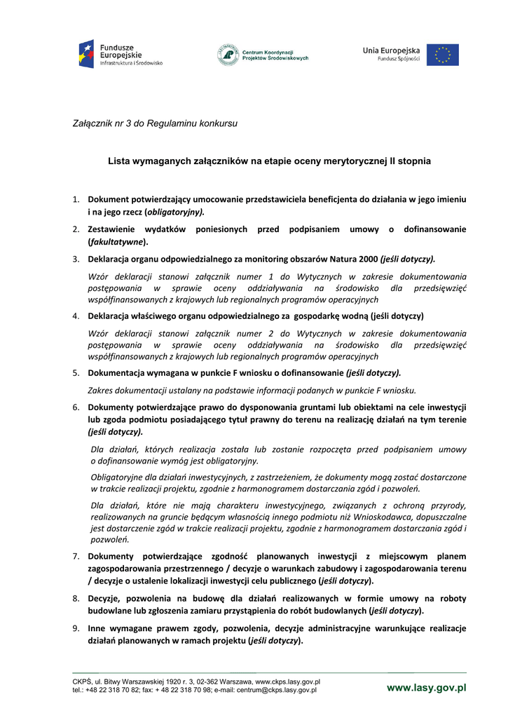 Załącznik nr 3 do Regulaminu konkursu Lista wymaganych załączników na etapie oceny merytorycznej II stopnia 1. Dokument potwierdzający umocowanie przedstawiciela beneficjenta do działania w jego imieniu i na jego rzecz (obligatoryjny). 2. Zestawienie wydatków (fakultatywne). poniesionych przed podpisaniem umowy o dofinansowanie 3. Deklaracja organu odpowiedzialnego za monitoring obszarów Natura 2000 (jeśli dotyczy). Wzór deklaracji stanowi załącznik numer 1 do Wytycznych w zakresie dokumentowania postępowania w sprawie oceny oddziaływania na środowisko dla przedsięwzięć współfinansowanych z krajowych lub regionalnych programów operacyjnych 4. Deklaracja właściwego organu odpowiedzialnego za gospodarkę wodną (jeśli dotyczy) Wzór deklaracji stanowi załącznik numer 2 do Wytycznych w zakresie dokumentowania postępowania w sprawie oceny oddziaływania na środowisko dla przedsięwzięć współfinansowanych z krajowych lub regionalnych programów operacyjnych 5. Dokumentacja wymagana w punkcie F wniosku o dofinansowanie (jeśli dotyczy). Zakres dokumentacji ustalany na podstawie informacji podanych w punkcie F wniosku. 6. Dokumenty potwierdzające prawo do dysponowania gruntami lub obiektami na cele inwestycji lub zgoda podmiotu posiadającego tytuł prawny do terenu na realizację działań na tym terenie (jeśli dotyczy). Dla działań, których realizacja została lub zostanie rozpoczęta przed podpisaniem umowy o dofinansowanie wymóg jest obligatoryjny. Obligatoryjne dla działań inwestycyjnych, z zastrzeżeniem, że dokumenty mogą zostać dostarczone w trakcie realizacji projektu, zgodnie z harmonogramem dostarczania zgód i pozwoleń. Dla działań, które nie mają charakteru inwestycyjnego, związanych z ochroną przyrody, realizowanych na gruncie będącym własnością innego podmiotu niż Wnioskodawca, dopuszczalne jest dostarczenie zgód w trakcie realizacji projektu, zgodnie z harmonogramem dostarczania zgód i pozwoleń. 7. Dokumenty potwierdzające zgodność planowanych inwestycji z miejscowym planem zagospodarowania przestrzennego / decyzje o warunkach zabudowy i zagospodarowania terenu / decyzje o ustalenie lokalizacji inwestycji celu publicznego (jeśli dotyczy). 8. Decyzje, pozwolenia na budowę dla działań realizowanych w formie umowy na roboty budowlane lub zgłoszenia zamiaru przystąpienia do robót budowlanych (jeśli dotyczy). 9. Inne wymagane prawem zgody, pozwolenia, decyzje administracyjne warunkujące realizacje działań planowanych w ramach projektu (jeśli dotyczy). CKPŚ, ul. Bitwy Warszawskiej 1920 r. 3, 02-362 Warszawa, www.ckps.lasy.gov.pl tel.: +48 22 318 70 82; fax: + 48 22 318 70 98; e-mail: [email protected] www.lasy.gov.pl Dla działań, których realizacja została lub zostanie rozpoczęta przed podpisaniem umowy o dofinansowanie wymóg dostarczenia kopii dokumentów jest obligatoryjny. Dla działań, których realizacja zostanie rozpoczęta po podpisaniu umowy o dofinansowanie Wnioskodawca może przedłożyć zestawienie wymaganych prawem zgód pozwoleń i decyzji administracyjnych określając jednocześnie harmonogram ich uzyskania. Wszelkie działania podejmowane w ramach projektu powinny być realizowane zgodnie z aktualnymi wymogami krajowych i wspólnotowych aktów prawnych. 10. Harmonogram dostarczania zgód i pozwoleń (jeśli dotyczy). Dla działań, których realizacja została lub zostanie rozpoczęta przed podpisaniem umowy o dofinansowanie wymóg dostarczenia kopii pozwoleń na budowę jest obligatoryjny. Dla działań, których realizacja zostanie rozpoczęta po podpisaniu umowy o dofinansowanie Wnioskodawca może przedłożyć zestawienie wymaganych prawem pozwoleń na budowę określając jednocześnie harmonogram ich uzyskania. Jeśli Wnioskodawca jest w posiadaniu wszystkich lub części wymaganych pozwoleń, należy dostarczyć ich kopie. 11. Porozumienia lub umowy pomiędzy do ponoszenia wydatków (jeśli dotyczy). beneficjentem, a podmiotami upoważnionymi Jeśli w projekcie przewidziano podmioty upoważnione do ponoszenia wydatków, a porozumienie/umowa przedłożona na etapie składania wniosku o dofinansowanie nie zawierała uregulowań w zakresie: - wkładu finansowego i rzeczowego do projektu (jeśli dotyczy), - zakresu rzeczowego realizowanych zadań, - zasad przepływów finansowych, - własności wytworzonych lub zakupionych środków trwałych i/lub nieruchomości po zakończeniu projektu, - sposobu zapewnienia trwałości projektu w okresie trwałości, należy przedłożyć porozumienie/umowę/ aneks do wcześniej zawartego porozumienia, regulujące powyższe kwestie. 12. Oświadczenie o stosowaniu lub braku obowiązku stosowania ustawy PzP (obligatoryjnie). Załącznik sporządzany odrębnie dla beneficjenta, odrębnie dla każdego z podmiotów upoważnionych (jeśli dotyczy) 13. Regulamin udzielania zamówień w ramach projektu (obligatoryjny) i/lub procedura dotycząca zawierania umów dla zadań objętych projektem (zg z zasadami zawierania umów określonymi w „Wytycznych w zakresie kwalifikowania wydatków w ramach POIiŚ 2014-2020, w przypadku umów do których nie stosuje się ustawy Prawo zamówień publicznych) Załącznik sporządzany odrębnie dla beneficjenta, odrębnie dla każdego z podmiotów upoważnionych (jeśli dotyczy) 14. Plan udzielania zamówień (obligatoryjny). Załącznik sporządzany odrębnie dla beneficjenta, odrębnie dla każdego z podmiotów upoważnionych (jeśli dotyczy) 15. Oświadczenie podmiotu upoważnionego o stosowaniu zasad zawierania umów nie mniej restrykcyjnych niż beneficjent (jeśli dotyczy). 16. Zaświadczenie z banku o posiadaniu przez beneficjenta rachunku bankowego, na który będą przekazywane środki na dofinansowanie w formie zaliczki oraz w formie refundacji (jeśli dotyczy). 2 Beneficjent przedkłada poświadczoną za zgodność z oryginałem kopię umowy z bankiem lub kopię zaświadczenia z banku, w którym prowadzony je