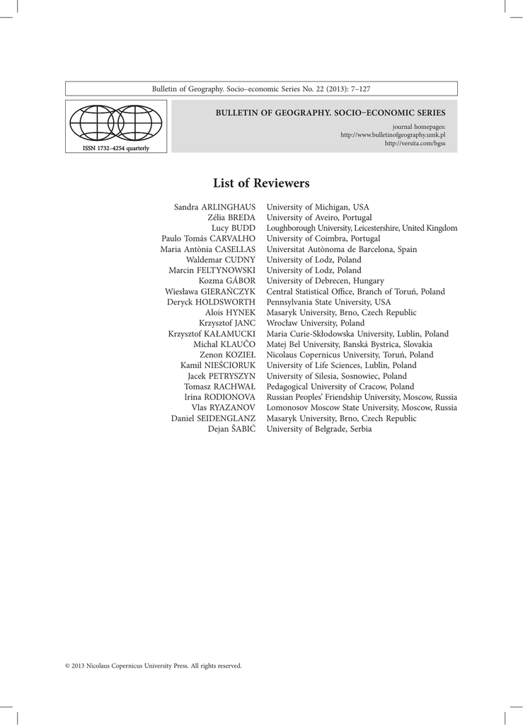 Bulletin of Geography. Socio–economic Series No. 22 (2013): 7–127 Bulletin of Geography. Socio–economic Series journal homepages: http://www.bulletinofgeography.umk.pl http://versita.com/bgss ISSN 1732–4254 quarterly List of Reviewers Sandra ARLINGHAUS Zélia BREDA Lucy BUDD Paulo Tomás CARVALHO Maria Antònia CASELLAS Waldemar CUDNY Marcin FELTYNOWSKI Kozma GÁBOR Wiesława GIERAŃCZYK Deryck HOLDSWORTH Alois HYNEK Krzysztof JANC Krzysztof KAŁAMUCKI Michal KLAUČO Zenon KOZIEŁ Kamil NIEŚCIORUK Jacek PETRYSZYN Tomasz RACHWAŁ Irina RODIONOVA Vlas RYAZANOV Daniel SEIDENGLANZ Dejan ŠABIĆ © 2013 Nicolaus Copernicus University Press. All rights reserved. University of Michigan, USA University of Aveiro, Portugal Loughborough University, Leicestershire, United Kingdom University of Coimbra, Portugal Universitat Autònoma de Barcelona, Spain University of Lodz, Poland University of Lodz, Poland University of Debrecen, Hungary Central Statistical Office, Branch of Toruń, Poland Pennsylvania State University, USA Masaryk University, Brno, Czech Republic Wrocław University, Poland Maria Curie-Skłodowska University, Lublin, Poland Matej Bel University, Banská Bystrica, Slovakia Nicolaus Copernicus University, Toruń, Poland University of Life Sciences, Lublin, Poland University of Silesia, Sosnowiec, Poland Pedagogical University of Cracow, Poland Russian Peoples’ Friendship University, Moscow, Russia Lomonosov Moscow State University, Moscow, Russia Masaryk University, Brno, Czech Republic University of Belgrade, Serbia