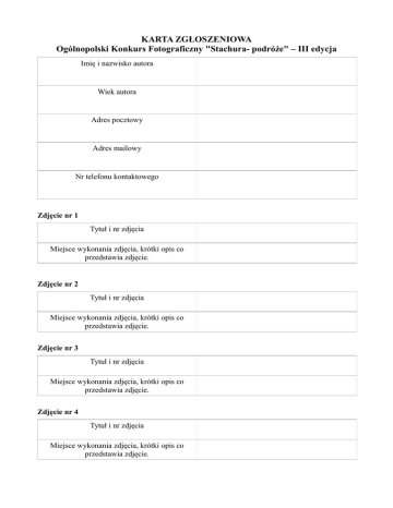 KARTA ZGŁOSZENIOWA Ogólnopolski Konkurs Fotograficzny "Stachura- podróże" – III edycja Imię i nazwisko autora Wiek autora Adres pocztowy Adres mailowy Nr telefonu kontaktowego Zdjęcie nr 1 Tytuł i nr zdjęcia Miejsce wykonania zdjęcia, krótki opis co przedstawia zdjęcie. Zdjęcie nr 2 Tytuł i nr zdjęcia Miejsce wykonania zdjęcia, krótki opis co przedstawia zdjęcie. Zdjęcie nr 3 Tytuł i nr zdjęcia Miejsce wykonania zdjęcia, krótki opis co przedstawia zdjęcie. Zdjęcie nr 4 Tytuł i nr zdjęcia Miejsce wykonania zdjęcia, krótki opis co przedstawia zdjęcie. Zdjęcie nr 5 Tytuł i nr zdjęcia Miejsce wykonania zdjęcia, krótki opis co przedstawia zdjęcie. Oświadczenie o posiadaniu i zrzeczeniu się praw autorskich dla zgłoszonych zdjęć * Ja niżej podpisany zapoznałem się z Regulaminem III edycji Konkursu „Stachura – podróże”, który rozumiem i w pełni akceptuję. Jednocześnie zaświadczam, że zdjęcia zgłoszone przeze mnie na Konkurs są mojego autorstwa, jednocześnie zrzekam się praw autorskich do zgłoszonych zdjęć na rzecz Urzędu Miejskiego w Aleksandrowie Kujawskim. Zgadzam się na nieodpłatne wykorzystywanie moich zdjęć dla promocji miasta i regionu w następujących polach eksploatacji: druku w dowolnej liczbie publikacji i w dowolnym nakładzie, używania ich w Internecie oraz w innych formach utrwaleń nadających się do rozpowszechniania. .................................................... ..................................................... Miejscowość , data Czytelny podpis Oświadczenie Oświadczam, że prawa osób portretowanych na zdjęciach zgłoszonych do Konkursu zostały wyjaśnione i osoby sportretowane wyrażają zgodę na wystawienie i publikowanie zdjęć je przedstawiających również dla celów reklamowych Konkursu. Przyjmuję także na siebie wszelkie roszczenia jakiejkolwiek natury, których przedmiotem byłyby nadesłane przeze mnie zdjęcia, a które osoby trzecie mogłyby kierować przeciwko organizatorom Konkursu. .................................................... ..................................................... Miejscowość , data Czytelny podpis Zgoda na przetwarzanie danych osobowych dla potrzeb konkursu * Ja niżej podpisany wyrażam zgodę na przetwarzanie przez organizatora moich danych osobowych na potrzeby Konkursu (ust. o ochronie danych osobowych z dn. 29.08.1997 r. Dz. U. Nr 133 poz. 833 z póz. zm.) …............................................ Miejscowość , data * W przypadku osób niepełnoletnich oświadczenie i zgodę podpisuje opiekun lub rodzic. …........................................... Czytelny podpis