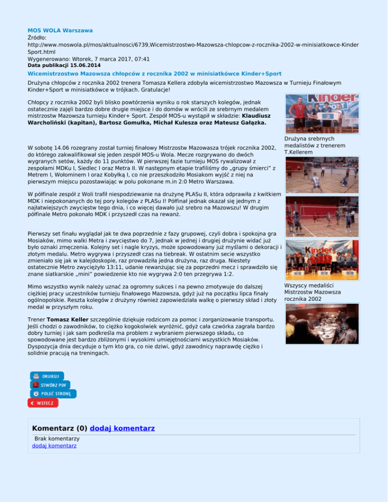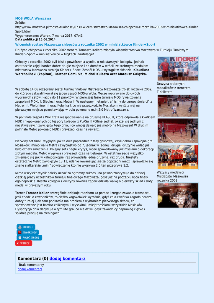 MOS WOLA Warszawa Źródło: http://www.moswola.pl/mos/aktualnosci/6739,Wicemistrzostwo-Mazowsza-chlopcow-z-rocznika-2002-w-minisiatkowce-Kinder Sport.html Wygenerowano: Wtorek, 7 marca 2017, 07:41 Data publikacji 15.06.2014 Wicemistrzostwo Mazowsza chłopców z rocznika 2002 w minisiatkówce Kinder+Sport Drużyna chłopców z rocznika 2002 trenera Tomasza Kellera zdobyła wicemistrzostwo Mazowsza w Turnieju Finałowym Kinder+Sport w minisiatkówce w trójkach. Gratulacje! Chłopcy z rocznika 2002 byli blisko powtórzenia wyniku o rok starszych kolegów, jednak ostatecznie zajęli bardzo dobre drugie miejsce i do domów w wrócili ze srebrnym medalem mistrzostw Mazowsza turnieju Kinder+ Sport. Zespół MOS-u wystąpił w składzie: Klaudiusz Warcholiński (kapitan), Bartosz Gomułka, Michał Kulesza oraz Mateusz Gałązka. W sobotę 14.06 rozegrany został turniej finałowy Mistrzostw Mazowasza trójek rocznika 2002, do którego zakwalifikował się jeden zespół MOS-u Wola. Mecze rozgrywano do dwóch wygranych setów, każdy do 11 punktów. W pierwszej fazie turnieju MOS rywalizował z zespołami MDKu I, Siedlec I oraz Metra II. W następnym etapie trafiliśmy do „grupy śmierci” z Metrem I, Wołominem I oraz Kobyłką I, co nie przeszkodziło Mosiakom wyjść z niej na pierwszym miejscu pozostawiając w polu pokonane m.in 2:0 Metro Warszawa. Drużyna srebrnych medalistów z trenerem T.Kellerem W półfinale zespół z Woli trafił niespodziewanie na drużynę PLASu II, która odprawiła z kwitkiem MDK i niepokonanych do tej pory kolegów z PLASu I! Półfinał jednak okazał się jednym z najłatwiejszych zwycięstw tego dnia, i co więcej dawało już srebro na Mazowszu! W drugim półfinale Metro pokonało MDK i przyszedł czas na rewanż. Pierwszy set finału wyglądał jak te dwa poprzednie z fazy grupowej, czyli dobra i spokojna gra Mosiaków, mimo walki Metra i zwycięstwo do 7, jednak w jednej i drugiej drużynie widać już było oznaki zmęczenia. Kolejny set i nagle kryzys, może spowodowany już myślami o dekoracji i złotym medalu. Metro wygrywa i przyszedł czas na tiebreak. W ostatnim secie wszystko zmieniało się jak w kalejdoskopie, raz prowadziła jedna drużyna, raz druga. Niestety ostatecznie Metro zwyciężyło 13:11, udanie rewanżując się za poprzedni mecz i sprawdziło się znane siatkarskie „mini” powiedzenie kto nie wygrywa 2:0 ten przegrywa 1:2. Mimo wszystko wynik należy uznać za ogromny sukces i na pewno zmotywuje do dalszej ciężkiej pracy uczestników turnieju finałowego Mazowsza, gdyż już na początku lipca finały ogólnopolskie. Reszta kolegów z drużyny również zapowiedziała walkę o pierwszy skład i złoty medal w przyszłym roku. Trener Tomasz Keller szczególnie dziękuje rodzicom za pomoc i zorganizowanie transportu. Jeśli chodzi o zawodników, to ciężko kogokolwiek wyróżnić, gdyż cała czwórka zagrała bardzo dobry turniej i jak sam podkreśla ma problem z wybraniem pierwszego składu, co spowodowane jest bardzo zbliżonymi i wysokimi umiejętnościami wszystkich Mosiaków. Dyspozycja dnia decyduje o tym kto gra, co nie dziwi, gdyż zawodnicy naprawdę ciężko i solidnie pracują na treningach. Komentarz (0) dodaj komentarz Brak komentarzy dodaj komentarz Wszyscy medaliści Mistrzostw Mazowsza rocznika 2002