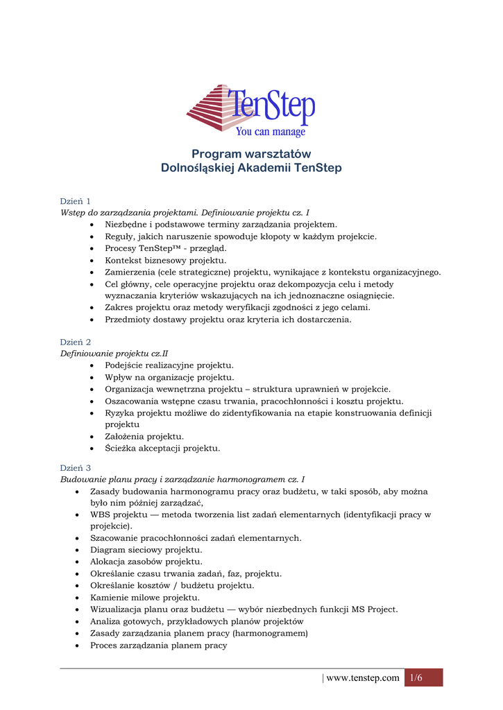 Program warsztatów Dolnośląskiej Akademii TenStep Dzień 1 Wstęp do zarządzania projektami. Definiowanie projektu cz. I Niezbędne i podstawowe terminy zarządzania projektem. Reguły, jakich naruszenie spowoduje kłopoty w każdym projekcie. Procesy TenStep™ - przegląd. Kontekst biznesowy projektu. Zamierzenia (cele strategiczne) projektu, wynikające z kontekstu organizacyjnego. Cel główny, cele operacyjne projektu oraz dekompozycja celu i metody wyznaczania kryteriów wskazujących na ich jednoznaczne osiągnięcie. Zakres projektu oraz metody weryfikacji zgodności z jego celami. Przedmioty dostawy projektu oraz kryteria ich dostarczenia. Dzień 2 Definiowanie projektu cz.II Podejście realizacyjne projektu. Wpływ na organizację projektu. Organizacja wewnętrzna projektu – struktura uprawnień w projekcie. Oszacowania wstępne czasu trwania, pracochłonności i kosztu projektu. Ryzyka projektu możliwe do zidentyfikowania na etapie konstruowania definicji projektu Założenia projektu. Ścieżka akceptacji projektu. Dzień 3 Budowanie planu pracy i zarządzanie harmonogramem cz. I Zasady budowania harmonogramu pracy oraz budżetu, w taki sposób, aby można było nim później zarządzać, WBS projektu — metoda tworzenia list zadań elementarnych (identyfikacji pracy w projekcie). Szacowanie pracochłonności zadań elementarnych. Diagram sieciowy projektu. Alokacja zasobów projektu. Określanie czasu trwania zadań, faz, projektu. Określanie kosztów / budżetu projektu. Kamienie milowe projektu. Wizualizacja planu oraz budżetu — wybór niezbędnych funkcji MS Project. Analiza gotowych, przykładowych planów projektów Zasady zarządzania planem pracy (harmonogramem) Proces zarządzania planem pracy | www.tenstep.com 1/6 Proces zarządzania planem pracy, a inne procesy TenStep. Rozpoznawanie symptomów przyszłych problemów na podstawie analizy harmonogramu i budżetu. Dzień 4 Budowanie planu pracy i zarządzanie harmonogramem cz. II Zarządzanie harmonogramem z użyciem oprogramowania MS Project Dzień 5 Zarządzanie problemami krytycznymi Co to jest kwestia krytyczna i jak odróżnić ją od „zwykłego” problemu? Proces zarządzania zdarzeniami krytycznymi Techniki analizy problemów w projekcie. Techniki poszukiwania rozwiązań problemów w projekcie. Standardy zachowania kierownika projektu i zespołu projektowego w sytuacji kryzysowej projektu. Zjawiska psychologiczne towarzyszące kryzysowi w projekcie. Zarządzanie zmianą w projekcie Czym jest zakres projektu – powrót do dokumentu Definicja Projektu. Proces zarządzania zakresem w małych projektach. Co najczęściej wywołuje konieczność zmiany zakresu? Proces dochodzenia ze Sponsorem do właściwego stosowania procesu zmiany zakresu projektu. Komunikacja wokół zmiany zakresu. Dzień 6 Zarządzanie komunikacją w projekcie Co to znaczy „dobra komunikacja w projekcie”? Proces zarządzania komunikacją w projekcie. Proces komunikacji w projekcie. Techniki budowania marki projektu wewnątrz organizacji. Zarządzanie oczekiwaniami Sponsora w projekcie. Zarządzanie interesariuszami Typowe problemy w komunikacji w projekcie oraz standardy radzenia sobie z nimi. Zarządzanie dokumentacją w projekcie Definicja terminu „dokument”. Proces zarządzania dokumentami w projekcie. Zasady budowania repozytoriów dokumentacji w projektach. Techniki tworzenia systemu nazewnictwa, wersjonowania dokumentów etc. Dzień 7 Zarządzanie ryzykiem w projekcie Definicja ryzyka i założeń projektu – czyli powrót do definicji projektu. Proces zarządzania ryzykiem w projekcie. Analiza jakościowa ryzyka. Analiza ilościowa ryzyka. | www.tenstep.com 2/3 Indywidualna percepcja ryzyka, grupowa percepcja ryzyka. Związek procesu zarządzania ryzykami projektu z innymi procesami. Zarządzanie zespołem projektowym Proces grupowy i jego rola w zarządzaniu personelem w projekcie modele przykładowych kompetencji, podstawowe zasady prowadzenia rozmowy rekrutacyjnej, oceny pracowników, planowania rozwoju pracowników, postępowanie z personelem w sytuacjach konfliktowych techniki egzekwowania zadań od członków zespołu projektowego Dzień 8 Zarządzanie jakością, miarami i dostawcami w projekcie Definicja terminu „jakość”: jakość przedmiotu dostawy, procesu, zarządzania projektem. Proces zarządzania jakością w projekcie. Budowanie planu jakości. Przeglądy jakościowe projektu. Definiowanie kryteriów sukcesu projektu (CSF). Definiowanie mierników KPI oraz wskaźników CSF. Narzędzia typu Project Scorecard. Zarządzanie dostawcami Egzamin FnTSPM (test - 60 min.) TENSTEP WESTERN POLAND 66-004 Drzonków, Rotowa 6 E-mail: zachod(at)tenstep.pl Mobile: +48 605 067 094 Direct Line: +48 68 321 4055 OFFICE 04-287 Warszawa, ul. Beskidzka 23A, Main Line: +48 22 646 9314 Facsimile: +48 22 201 3556 WWW.TenStep.com | www.tenstep.com 3/3