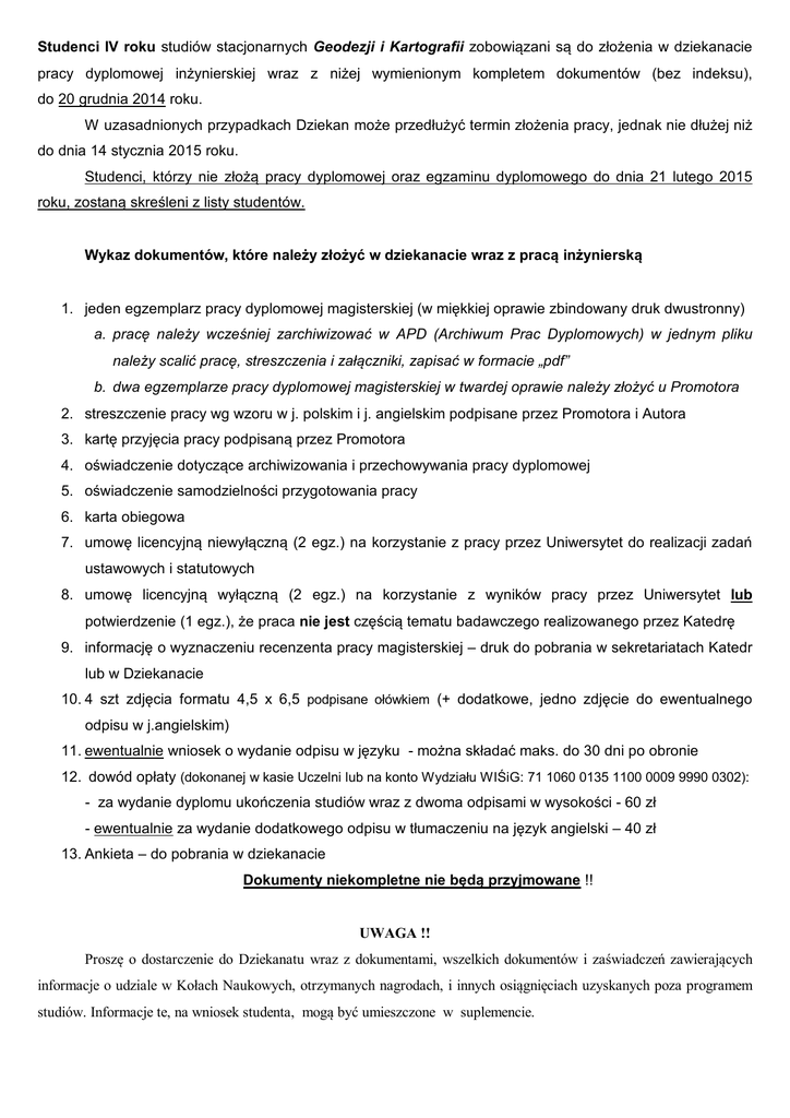 Studenci IV roku studiów stacjonarnych Geodezji i Kartografii zobowiązani są do złożenia w dziekanacie pracy dyplomowej inżynierskiej wraz z niżej wymienionym kompletem dokumentów (bez indeksu), do 20 grudnia 2014 roku. W uzasadnionych przypadkach Dziekan może przedłużyć termin złożenia pracy, jednak nie dłużej niż do dnia 14 stycznia 2015 roku. Studenci, którzy nie złożą pracy dyplomowej oraz egzaminu dyplomowego do dnia 21 lutego 2015 roku, zostaną skreśleni z listy studentów. Wykaz dokumentów, które należy złożyć w dziekanacie wraz z pracą inżynierską 1. jeden egzemplarz pracy dyplomowej magisterskiej (w miękkiej oprawie zbindowany druk dwustronny) a. pracę należy wcześniej zarchiwizować w APD (Archiwum Prac Dyplomowych) w jednym pliku należy scalić pracę, streszczenia i załączniki, zapisać w formacie „pdf” b. dwa egzemplarze pracy dyplomowej magisterskiej w twardej oprawie należy złożyć u Promotora 2. streszczenie pracy wg wzoru w j. polskim i j. angielskim podpisane przez Promotora i Autora 3. kartę przyjęcia pracy podpisaną przez Promotora 4. oświadczenie dotyczące archiwizowania i przechowywania pracy dyplomowej 5. oświadczenie samodzielności przygotowania pracy 6. karta obiegowa 7. umowę licencyjną niewyłączną (2 egz.) na korzystanie z pracy przez Uniwersytet do realizacji zadań ustawowych i statutowych 8. umowę licencyjną wyłączną (2 egz.) na korzystanie z wyników pracy przez Uniwersytet lub potwierdzenie (1 egz.), że praca nie jest częścią tematu badawczego realizowanego przez Katedrę 9. informację o wyznaczeniu recenzenta pracy magisterskiej – druk do pobrania w sekretariatach Katedr lub w Dziekanacie 10. 4 szt zdjęcia formatu 4,5 x 6,5 podpisane ołówkiem (+ dodatkowe, jedno zdjęcie do ewentualnego odpisu w j.angielskim) 11. ewentualnie wniosek o wydanie odpisu w języku - można składać maks. do 30 dni po obronie 12. dowód opłaty (dokonanej w kasie Uczelni lub na konto Wydziału WIŚiG: 71 1060 0135 1100 0009 9990 0302): - za wydanie dyplomu ukończenia studiów wraz z dwoma odpisami w wysokości - 60 zł - ewentualnie za wydanie dodatkowego odpisu w tłumaczeniu na język angielski – 40 zł 13. Ankieta – do pobrania w dziekanacie Dokumenty niekompletne nie będą przyjmowane !! UWAGA !! Proszę o dostarczenie do Dziekanatu wraz z dokumentami, wszelkich dokumentów i zaświadczeń zawierających informacje o udziale w Kołach Naukowych, otrzymanych nagrodach, i innych osiągnięciach uzyskanych poza programem studiów. Informacje te, na wniosek studenta, mogą być umieszczone w suplemencie.