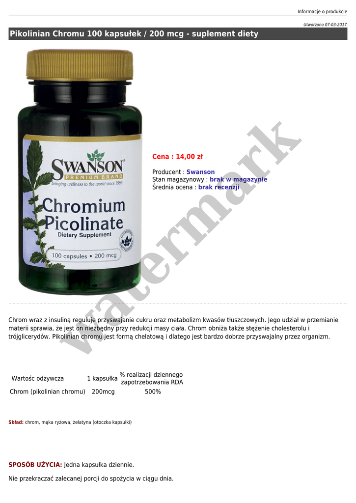 Informacje o produkcie Utworzono 07-03-2017 er m ar k Pikolinian Chromu 100 kapsułek / 200 mcg - suplement diety Cena : 14,00 zł at Producent : Swanson Stan magazynowy : brak w magazynie Średnia ocena : brak recenzji w Chrom wraz z insuliną reguluje przyswajanie cukru oraz metabolizm kwasów tłuszczowych. Jego udział w przemianie materii sprawia, że jest on niezbędny przy redukcji masy ciała. Chrom obniża także stężenie cholesterolu i trójglicerydów. Pikolinian chromu jest formą chelatową i dlatego jest bardzo dobrze przyswajalny przez organizm. Wartośc odżywcza Chrom (pikolinian chromu) % realizacji dziennego zapotrzebowania RDA 200mcg 500% 1 kapsułka Skład: chrom, mąka ryżowa, żelatyna (otoczka kapsułki) SPOSÓB UŻYCIA: Jedna kapsułka dziennie. Nie przekraczać zalecanej porcji do spożycia w ciągu dnia. Produkt nie może być stosowany jako substytut prawidłowo zróżnicowanej diety. Produkt niewskazany dla kobiet w ciąży i karmiących. PRZECHOWYWANIE: Przechowywać w temperaturze pokojowej, w sposób niedostępny dla małych dzieci. Opakowanie: 100 kapsułek w at er m ar k Producent: Swanson Health Products ATTN: Customer Care P.O. Box 2803 Fargo, ND 58108-2803 USA Dystrybutor: PRO SPORT S.C. ul. Pogodna 18 71-376 Szczecin