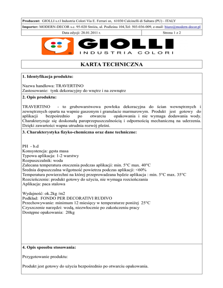 Producent: GIOLLI s.r.l Industria Colori Via E. Ferrari sn, 61030 Calcinelli di Saltara (PU) - ITALY Importer: MODERN-DECOR s.c. 95-020 Stróża, ul. Podleśna 104,Tel: 503-036-009, e-mail: [email protected] Data edycji: 28.01.2011 r. Strona 1 z 2 KARTA TECHNICZNA 1. Identyfikacja produktu: Nazwa handlowa: TRAVERTINO Zastosowanie: tynk dekoracyjny do wnętrz i na zewnątrz 2. Opis produktu: TRAVERTINO - to grubowarstwowa powłoka dekoracyjna do ścian wewnętrznych i zewnętrznych oparta na wapnie gaszonym i granulacie marmurowym. Produkt jest gotowy do aplikacji bezpośrednio po otwarciu opakowania i nie wymaga dodawania wody. Charakteryzuje się doskonałą paroprzepuszczalnością i odpornością mechaniczną na uderzenia. Dzięki zawartości wapna utrudnia rozwój pleśni. 3. Charakterystyka fizyko-chemiczna oraz dane techniczne: PH - b.d Konsystencja: gęsta masa Typowa aplikacja: 1-2 warstwy Rozpuszczalnik: woda Zalecana temperatura otoczenia podczas aplikacji: min. 5°C max. 40°C Średnia dopuszczalna wilgotność powietrza podczas aplikacji: <60% Temperatura powierzchni na której przeprowadzana będzie aplikacja : min. 5°C max. 35°C Rozcieńczenie: produkt gotowy do użycia, nie wymaga rozcieńczania Aplikacja: paca stalowa Wydajność: ok.2kg /m2 Podkład: FONDO PER DECORATIVI RUDIVO Przechowywanie: minimum 12 miesięcy w temperaturze poniżej 25°C Czyszczenie narzędzi: wodą, niezwłocznie po zakończeniu pracy Dostępne opakowania: 20kg 4. Opis sposobu stosowania: Przygotowanie produktu: Produkt jest gotowy do użycia bezpośrednio po otwarciu opakowania. Producent: GIOLLI s.r.l Industria Colori Via E. Ferrari sn, 61030 Calcinelli di Saltara (PU) - ITALY Importer: MODERN-DECOR s.c. 95-020 Stróża, ul. Podleśna 104,Tel: 503-036-009, e-mail: [email protected] Data edycji: 28.01.2011 r. Strona 2 z 2 Przygotowanie powierzchni: Powierzchnia musi być sucha i gładka. Jeżeli to konieczne, należy usunąć luźne fragmenty i ja wyrównać. Następnie należy całą powierzchnię pokryć podkładem z piaskiem kwarcowym FONDO PER DECORATIVI RUDIVO rozcieńczonym o 20-30% wodą za pomocą pędzla lub wałka. Nakładanie: Do nakładania produktu używaj stalowej pacy. W zależności od żądanego wzoru należy nałożyć jedną lub dwie warstwy produktu a następnie za pomocą odpowiednich narzędzi tworzyć wzór. W celu uzyskania dokładniejszych informacji odnośnie metod tworzenia wzorów i barwienia zapraszamy na naszą stronę www.modern-decor.pl. 5. Ochrona środowiska i bezpieczeństwo stosowania: W trakcie używania produktu powinny być stosowane standardowe metody ochrony przed substancjami chemicznymi i preparatami zawierającymi wapno gaszone. Karta Charakterystyki MSDS jest dostępna na żądanie.