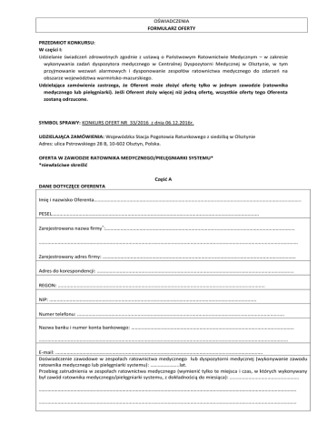 OŚWIADCZENIA FORMULARZ OFERTY PRZEDMIOT KONKURSU: W części I: Udzielanie świadczeń zdrowotnych zgodnie z ustawą o Państwowym Ratownictwie Medycznym – w zakresie wykonywania zadań dyspozytora medycznego w Centralnej Dyspozytorni Medycznej w Olsztynie, w tym przyjmowanie wezwań alarmowych i dysponowanie zespołów ratownictwa medycznego do zdarzeń na obszarze województwa warmińsko-mazurskiego. Udzielająca zamówienia zastrzega, że Oferent może złożyć ofertę tylko w jednym zawodzie (ratownika medycznego lub pielęgniarki). Jeśli Oferent złoży więcej niż jedną ofertę, wszystkie oferty tego Oferenta zostaną odrzucone. SYMBOL SPRAWY: KONKURS OFERT NR 33/2016 z dnia 06.12.2016r. UDZIELAJĄCA ZAMÓWIENIA: Wojewódzka Stacja Pogotowia Ratunkowego z siedzibą w Olsztynie Adres: ulica Pstrowskiego 28 B, 10-602 Olsztyn, Polska. OFERTA W ZAWODZIE RATOWNIKA MEDYCZNEGO/PIELĘGNIARKI SYSTEMU* *niewłaściwe skreślić Część A DANE DOTYCZĘCE OFERENTA Imię i nazwisko Oferenta……………………………………………………………………………………………………………………………………………….. PESEL……………………………………………………………………………………………………………………………………………….. Zarejestrowana nazwa firmy*:…………………………………………………………………………………………………………………………………… ……………………………………………………………………………………………………………………………………………………………………………………. Zarejestrowany adres firmy: ……………………………………………………………………………………………………………………………………… Adres do korespondencji: ………………………………………………………………………………………………………………………………………… REGON: ……………………………………………………………………………………………………………………………………………….. NIP: ……………………………………………………………………………………………………………………………………………….. Numer telefonu: ……………………………………………………………………………………………………………………………………………….. Nazwa banku i numer konta bankowego: ………………………………………………………………………………………………………………… ………………………..…………………………………………………………………………………………………………………………………………………… E-mail: ……………………………………………………………………………………………………………………………………………….. Doświadczenie zawodowe w zespołach ratownictwa medycznego lub dyspozytorni medycznej (wykonywanie zawodu ratownika medycznego lub pielęgniarki systemu): …………………..lat. Przebieg zatrudnienia w zespołach ratownictwa medycznego (wymienić tylko te miejsca i czas, w których wykonywany był zawód ratownika medycznego/pielęgniarki systemu, z dokładnością do miesiąca): ………………………………………………. …………………………………………………………………………………………………………………………………………………………………………………… …………………………………………………………………………………………………………………………………………………………………………………… ……………………………………………………………………………………………………………………………………………………………………………………….. ………………………………………………………………………………………………………………………………………………………………………………………. Obecne miejsce/a zatrudnienia (podać formę zatrudnienia i nazwę zakładu/zakładów) …………………………………… ………………………………………………………………………………………………………………………………………………………………………………….. ………………………………………………………………………………………………………………………………………………………………………………….. ………………………………………………………………………………………………………………………………………………………………………………….. ZOBOWIĄZANIA OFERENTA: Ja niżej podpisany oświadczam, że: 1. że posiadam pełną zdolność do czynności prawnych, 2. że przyjmuję warunki umowy, (projekty umowy stanowi załącznik do specyfikacji konkursu ofert), 3. że wyrażam zgodę na przetwarzanie moich danych osobowych w celu przeprowadzenia konkursu ofert; 4. że w przypadku zawarcia umowy z WSPR nie będę prowadzić działalności konkurencyjnej względem Udzielającej zamówienia, 5. że stan mojego zdrowia pozwala na udzielanie świadczeń zdrowotnych w dyspozytorni medycznej, 6. że w razie zawarcia umowy łączna liczba udzielanych przeze mnie godzin świadczeń zdrowotnych niezależnie od formy umowy i miejsca świadczeń nie przekroczy 300 w miesiącu, 7. zapoznałem się z treścią SKO dla niniejszego Konkursu, 8. gwarantuję wykonanie całośc