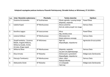 Kolejność występów podczas konkursu Piosenki Patriotycznej, Ośrodek Kultury w Wiśniowej, 27.10.2016 r. L.p. Imię i Nazwisko wykonawcy Placówka 1. Zuzanna Arciszewska SP Szufnarowa 2. Izabela Kopeć SP Markuszowa 3. Karolina Legęza SP Jaszczurowa 4. Justyna Kolbusz SP Markuszowa 5. SP Wiśniowa 6. Zespół wokalny : Zuzanna Bobek, Angelia Makara, Wiktoria Godek, Emilia Armata, Kinga Lepak Wiktoria Śliwa SP Markuszowa 7. Eliza Armata SP Różanka 8. Patrycja Tomkowicz SP Markuszowa 9. Aleksandra Dziok SP Różanka Tytuły utworów Opiekun Płonie ognisko i szumią knieje Paweł Śliwa Wojenko, wojenko Deszcz jesienny Dariusz Data Dziś do ciebie przyjść nie mogę Mury Hej, strzelcy wraz Warszawo ma Kiedy żołnierze wracają Pąki róż Niepodległa, niepokorna Wojenko, wojenko Czy jest coś piękniejszego Dziewczyna z granatem Niepodległa, niepokorna Ułani, Ułani Pałacyk Michla 11 Listopada Taki kraj Paweł Śliwa Dariusz Data Agnieszka Gruszczyńska Dariusz Data Małgorzata Sienkowska Dariusz Data Małgorzata Sienkowska 10. Nikola Bobek Gimnazjum Wiśniowa 11. Maria Kolbusz Gimnazjum Wiśniowa 12. Piotr Wójcik Gimnazjum Wiśniowa 13. Natalia Furtek Gimnazjum Wiśniowa 14. Martyna Wójcik Gimnazjum Wiśniowa 15. Grupa wokalna z Kozłówka 5+1 Kozłówek Warszawo ma Powrócisz tu Mury Taki kraj 45 Zośka Gdy piosenka szła do wojska Na skrzydłach dni Kolęda warszawska Miasto 44 Matko o twarzy czarnej Sanitariuszka Małgorzatka Agnieszka Gruszczyńska Agnieszka Gruszczyńska Agnieszka Gruszczyńska Agnieszka Gruszczyńska Agnieszka Gruszczyńska Agata Wójcik