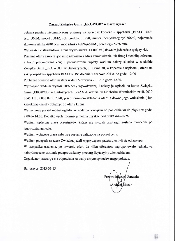 Zarząd Zv,tiązku Gmin,,EKOWOD' w Bańoszycach ogłaszaprzetargnieograniczonypisemnyna sprzedaŻkoparko_ spycharki''BIAŁORUS"' pojemność typ: D65M, model JUMZ, rok produkcji 1980, numer identyfikacyjny:356660, skokowasilnika4940ccm, moc silnika48kWó5KM , przebieg_5726mth. jedenaście tysięcyzł.). standardowe. Cena wywoławczal l.000 zł( słownie: WyposaŹenie Pisemneofertyzawierająceimię nazwiskoi adreszamieszkania|ub firmę i siedzibęoferenta, a takżeproponowanącenę i potwierdzeniewpłaty wadium naleĄ składaćw siedzibie ZwiązkuGmin ,,EKoWoD'' w Bartoszycach,ul. Bema 30, w koperciez napisem,, ofertana zakupkoparko_ spycharkiBIAŁoRUS'' do dnia 5 czerwca20l3r. do godz.|2.00 PubliczneotwarcieofertnasĘli w dniu 5 czerwca20|3t. o godz.|2.30. Wymaganewadium wynosi |0%oceny wywoławczej i na|eŻyje wlacić na konto Zwięktt Gmin ,,EKoWoD'' w BartoszycachBGZ S.A. oddziałw LidzbarkuWarmińskimnr 48 2030 0045 l l l0 0000 0251 7070, przedterminemskładaniaofert,a dowód jego wniesienia( lub kserokopię)na|eĄ do|tączyć do oferty kupna. do piątkuw godz. WymienionypojazdmoŹnaoglądaćw siedzibieZwięku od poniedziałku 9.00do l4.00.Dodatkowy'ch informacjimoźnauzyskaópod nr 89 764-20-26. Wadiumwpłaconeprzez uczestników,którzy nie wygrali przetargu'zostaniezwrócone po jego rozstrzygnięciu. \['adiumwpłacone przeznabywcęzostanieza|iczonena poczetceny. Wadiumprzepadana necz Zwiękq jeżeliwygrywającyprzetarguchyli się od zakupu. jednakową W prz1padkuustalenia.po otwarciuofeń, że kilku oferentówzaproponowało najw1.ższą przetĄrglicy.tacyjnyz ich udziałem. cenę,zostanieprzeprowadzony pojazdu. Organizatorprzetargunie odpowiadaza wady ukrytesprzedawanego Bartoszvce. 2013-05-15 ZarzĄdu