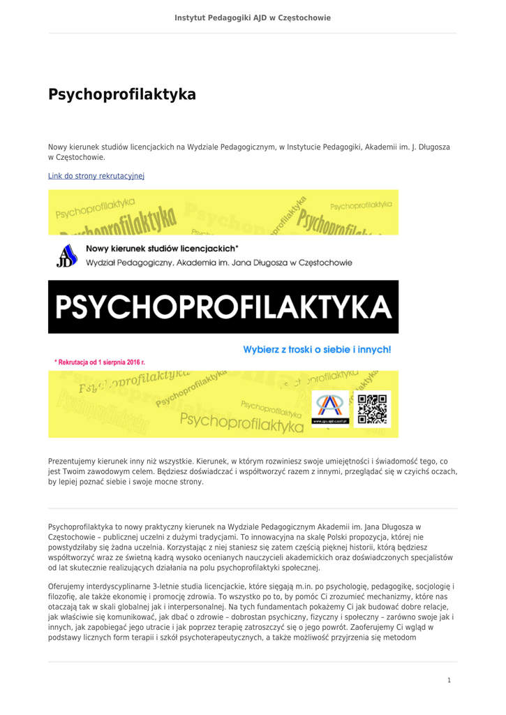 Instytut Pedagogiki AJD w Częstochowie Psychoprofilaktyka Nowy kierunek studiów licencjackich na Wydziale Pedagogicznym, w Instytucie Pedagogiki, Akademii im. J. Długosza w Częstochowie. Link do strony rekrutacyjnej Prezentujemy kierunek inny niż wszystkie. Kierunek, w którym rozwiniesz swoje umiejętności i świadomość tego, co jest Twoim zawodowym celem. Będziesz doświadczać i współtworzyć razem z innymi, przeglądać się w czyichś oczach, by lepiej poznać siebie i swoje mocne strony. Psychoprofilaktyka to nowy praktyczny kierunek na Wydziale Pedagogicznym Akademii im. Jana Długosza w Częstochowie – publicznej uczelni z dużymi tradycjami. To innowacyjna na skalę Polski propozycja, której nie powstydziłaby się żadna uczelnia. Korzystając z niej staniesz się zatem częścią pięknej historii, którą będziesz współtworzyć wraz ze świetną kadrą wysoko ocenianych nauczycieli akademickich oraz doświadczonych specjalistów od lat skutecznie realizujących działania na polu psychoprofilaktyki społecznej. Oferujemy interdyscyplinarne 3-letnie studia licencjackie, które sięgają m.in. po psychologię, pedagogikę, socjologię i filozofię, ale także ekonomię i promocję zdrowia. To wszystko po to, by pomóc Ci zrozumieć mechanizmy, które nas otaczają tak w skali globalnej jak i interpersonalnej. Na tych fundamentach pokażemy Ci jak budować dobre relacje, jak właściwie się komunikować, jak dbać o zdrowie – dobrostan psychiczny, fizyczny i społeczny – zarówno swoje jak i innych, jak zapobiegać jego utracie i jak poprzez terapię zatroszczyć się o jego powrót. Zaoferujemy Ci wgląd w podstawy licznych form terapii i szkół psychoterapeutycznych, a także możliwość przyjrzenia się metodom 1 Instytut Pedagogiki AJD w Częstochowie indywidualnej pracy z klientem. Psychoprofilaktyka to studia z pasją. Dajemy Ci możliwość elastycznego wyboru interesujących Cię przedmiotów, okazję do pracy z indywidualnym nauczycielem – tutorem, bogate praktyki zawodowe, zajęcia w małych grupach. Odbyte ćwiczenia z zakresu ekonomii, przedsiębiorczości czy poradnictwa zawodowego pozwolą Ci odnaleźć się na rynku pracy, rozpocząć działania zmierzające do samozatrudnienia i założenia organizacji pozarządowej. Pokażą Ci, jak skutecznie poszukiwać źródła finansowania na realizację Twoich własnych programów psychoprofilaktycznych. Wszystko to, co oferujemy w ramach tego kierunku ma dać Ci szansę w przyszłości podejmować świadome działania nastawione na jednostki lub grupy społeczne, które pozwolą zapobiegać różnorodnym problemom zanim one wystąpią. Działania, które będą możliwe do zrealizowania w: poradniach psychologiczno-pedagogicznych, centrach psychoprofilaktyki i psychoedukacji, w świetlicach socjoterapeutycznych czy środowiskowych, klubach profilaktyki środowiskowej, instytucjach wsparcia osób zmarginalizowanych, punktach konsultacyjno-doradczych, instytucjach pomocy osobom doświadczającym kryzysu, domach pomocy społecznej, interdyscyplinarnych zespołach interwencyjnych, centrach interwencji kryzysowej, ośrodkach dla ofiar przemocy domowej, domach samotnej matki, domach matki i dziecka, środowiskowych domach samopomocy, ośrodkach pomocy rodzinie, biurach bądź urzędach pośrednictwa pracy itp. Psychoprofilaktyka – wybierz z troski o siebie i innych! 2
