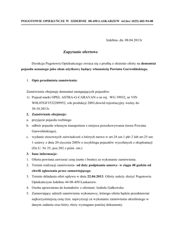 POGOTOWIE OPIEKUŃCZE W IZDEBNIE 08-450 ŁASKARZEW tel.fax/ (025) 682-94-08 ======================================================================= Izdebno, dn. 08.04.2013r Zapytanie ofertowe Dyrekcja Pogotowia Opiekuńczego zwraca się z prośbą o złożenie oferty na demontaż pojazdu uznanego jako złom użytkowy będący własnością Powiatu Garwolińskiego. 1. Opis przedmiotu zamówienia: Zamówienie obejmuje demontaż następujących pojazdów: 1) Pojazd marki OPEL ASTRA-G-CARAVAN o nr rej. WG 39932, nr VIN W0L0TGF3532289952, rok produkcji 2003,dowód rejestracyjny ważny do 30.10.2013r. 2. Zamówienie obejmuje: a. przyjęcie pojazdu rozbitego b. odbiór pojazdu własnym transportem z miejsca przechowywania (teren Powiatu Garwolińskiego), c. wydanie stosownych zaświadczeń o których mowa w art.24 ust.1 pkt 2 lub art.25 ust. 1 ustawy z dnia 20 stycznia 2005r o recyklingu pojazdów wycofanych z eksploatacji (Dz.U. Nr 25, poz.202 z późn. zm.) 3. Inne informacje: 1. Oferta powinna zawierać cenę (netto i brutto) za wykonanie zamówienia. 2. Termin realizacji zamówienia- od daty podpisania umowy- w ciągu 48 godzin od chwili zgłoszenia przez zamawiającego. 3. Termin składania ofert upływa w dniu 22.04.2013. Oferty należy złożyć Pogotowiu Opiekuńczym Izdebno 44 08-450 Łaskarzew. 4. Osoba uprawniona do kontaktów z ofertami: Izabela Gałkowska 5. Zamawiający udzieli zamówienia wykonawcy, którego oferta będzie przedstawiać najkorzystniejszą cenę (tzn. najwyższą) za wykonanie zamówienia określonego w danym zadaniu oraz który złoży wymagane poniżej dokumenty. 4. Dokumenty wymagane od wykonawcy: 1. Kopie uprawnień stacji demontażu. 2. Formularz cenowy- załącznik nr 1 do zaproszenia Załącznik: 1. Ksero decyzji wypłaty odszkodowania. (strona 3) Załącznik nr 1 Formularz cenowy 2. Ceny za kasację, demontaż pojazdu: Lp. 1. Rodzaj pojazdu Ilość pojazdów Cena 1 2 3 Pojazd marki OPEL ASTRA-G-CARAVAN o nr 1 rej. WG 39932, nr VIN W0L0TGF3532289952, ROK PRODUKCJI 2003. Wartość brutto ........................................ Podpis Wykonawcy oraz pieczątka/pieczątki