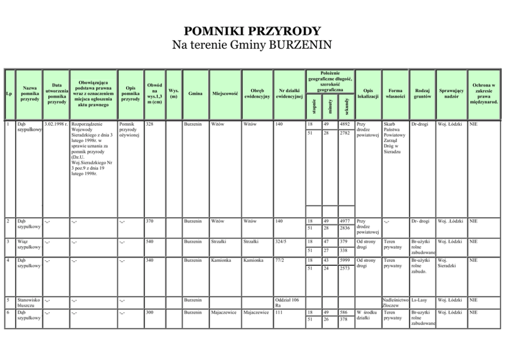 POMNIKI PRZYRODY Na terenie Gminy BURZENIN