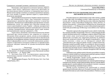 Секторальні асиметрії розвитку національної економіки Насамперед, нова парадигма суспільного прогресу, обрана в рамках даної моделі, припускала стратегічну орієнтацію на постіндустріальні цінності розвитку та підвищення якості життя. Вищою метою науково-технічного та соціально-економічного прогресу має стати людина, її духовне і фізичне здоров’я у сприятливому і безпечному середовищі. Цивілізаційний вектор розвитку України повинен включати в себе три найважливіші умови: нову концепцію соціальної справедливості, економічну ефективність розвитку та екологічну захищеність. Реалізація цього цивілізаційного вектора вимагає спільних зацікавлених зусиль усіх держав світу. Наступна значуща мета сталого цивілізаційного шляху України - побудова демократичної соціальної правової держави, відкритого громадянського суспільства зі зрілими демократичними механізмами захисту прав людини, взаємодії цивільних структур і держави [3, с.156]. Таким чином, економічне і екологічне благополуччя світової цивілізації при сталому розвитку має спиратися не стільки на збільшення обсягу ресурсних циклів, скільки на інтенсифікацію духовної, інтелектуальної складової суспільного буття. Благополуччя передбачає інтенсифікацію наукового прогресу, зростання інновацій в області інформаційних систем і технологій, вивільнення духовнотворчого та креативного потенціалу особистості та переорієнтацію соціально значущих цінностей на духовно-інтелектуальні форм розвитку. Література: 1. Базилевич В.Д., Гражевська Н.І., Гайдай Т.В., Леоненко П. М., Нестеренко А. П. Історія економічних учень: Навчальний посібник / В.Д. Базилевич. — К.: Знання, 2004. 2. Бестужев-Лада И.В. Альтернативная цивилизация. Единственное спасение человечества / И.В Бестужев-Лада. – М.: Алгоритм, 2003. 3. World Population Prospects. The 2012 Revision. Vol.1. New York: United Nations, 2013. 16 Виклики та факторні обмеження розвитку економіки Anetta ZIELIŃSKA Uniwersytet Ekonomiczny we Wrocławiu METODY WYCENY EKONOMICZNEJ OBSZARÓW PRZYRODNICZO CENNYCH Przyroda (natura) na co dzień dostarcza nam wielu wartości, a jednak zwykle omija rynki, nie podlega wycenie i unika oszacowań. Ten brak wyceny, jak się okazuje, jest główną przyczyną widocznej degradacji ekosystemów i utraty różnorodności biologicznej. Należy dowieść, że ochrona ekosystemów i różnorodności biologicznej jest ekonomiczną koniecznością [1, s. 4]. Dlatego też wycena (waloryzacja) komponentów środowiska przyrodniczego od dłuższego czasu nabiera coraz większej wagi. Ekonomia wypracowała szereg metod wyceny walorów środowiska. Są to metody pośrednie i bezpośrednie. Pierwsze z nich pomagają określić wartość ekonomiczną korzyści wynikającej z poprawy jakości środowiska (lub wartość utraty owej korzyści) przy pomocy bezpośredniego ankietowania (wywiadu) oraz rangowania preferencji na podstawie obserwacji zachowań (wyborów lub zakupów) konsumentów, a także analizy poziomu i zmian cen na istniejących rynkach dóbr „nieśrodowiskowych” mających jednak związki z cechami środowiska. Natomiast metody pośrednie oparte są na podstawie obserwowanych, determinowanych przez rynek cen dóbr i usług rynkowych. Wartość dobra nierynkowego otrzymuje się przez zebranie informacji o tym, jak zmienia się popyt na dobro rynkowe przy zmianach dostępności dóbr lub usług środowiska. Dokonanie oceny ogólnej wartości obszarów przyrodniczo cennych, zwłaszcza wartości użytkowej, można przeprowadzić przy pomocy różnych metod. Do najczęściej stosowanych zalicza się: 1. Metody bezpośrednie: metoda wyceny warunkowej (metoda deklarowanych preferencji); metoda kosztów podróży. 2. Metody pośrednie: metody hedoniczne; metody kapitału ludzkiego (metoda kosztu choroby, metoda funkcji produkcji zdrowia); metoda efektów produkcyjnych; metoda nakładów prewencyjnych i kosztów restytucji; koncepcja minimalnego standardu bezpieczeństwa. Metoda wyceny warunkowej ma zastosowanie w sytuacji ograniczonych informacji rynkowych. Gromadzi się opinie ludzi na temat ich zapotrzebowania na czyste środowisko przyrodnicze. Podstawą wyceny 17 Секторальні асиметрії розвитку національної економіки jest określenie, poprzez odpowiednie badania ankietowe, jakie kwoty ludzie gotowi są zapłacić za dostęp do walorów środowiska, za dobro ekologiczne lub też otrzymać jako rekompensatę za utratę możliwości korzystania ze 
