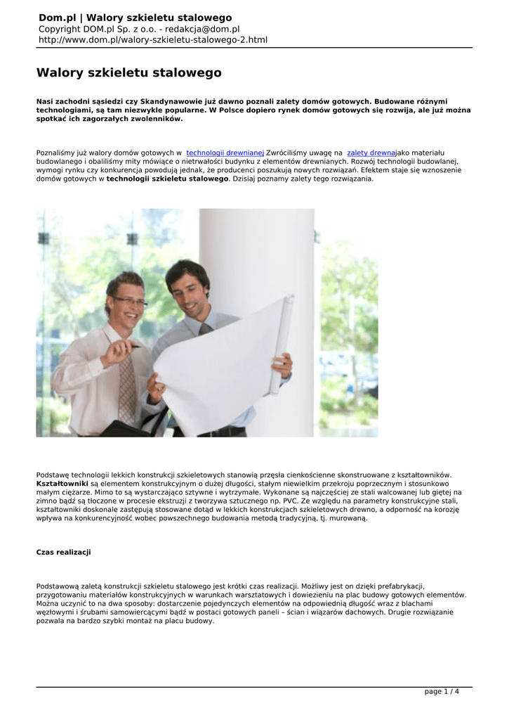Dom.pl | Walory szkieletu stalowego Copyright DOM.pl Sp. z o.o. - [email protected] http://www.dom.pl/walory-szkieletu-stalowego-2.html Walory szkieletu stalowego Nasi zachodni sąsiedzi czy Skandynawowie już dawno poznali zalety domów gotowych. Budowane różnymi technologiami, są tam niezwykle popularne. W Polsce dopiero rynek domów gotowych się rozwija, ale już można spotkać ich zagorzałych zwolenników. Poznaliśmy już walory domów gotowych w technologii drewnianej. Zwróciliśmy uwagę na zalety drewnajako materiału budowlanego i obaliliśmy mity mówiące o nietrwałości budynku z elementów drewnianych. Rozwój technologii budowlanej, wymogi rynku czy konkurencja powodują jednak, że producenci poszukują nowych rozwiązań. Efektem staje się wznoszenie domów gotowych w technologii szkieletu stalowego. Dzisiaj poznamy zalety tego rozwiązania. Podstawę technologii lekkich konstrukcji szkieletowych stanowią przęsła cienkościenne skonstruowane z kształtowników. Kształtowniki są elementem konstrukcyjnym o dużej długości, stałym niewielkim przekroju poprzecznym i stosunkowo małym ciężarze. Mimo to są wystarczająco sztywne i wytrzymałe. Wykonane są najczęściej ze stali walcowanej lub giętej na zimno bądź są tłoczone w procesie ekstruzji z tworzywa sztucznego np. PVC. Ze względu na parametry konstrukcyjne stali, kształtowniki doskonale zastępują stosowane dotąd w lekkich konstrukcjach szkieletowych drewno, a odporność na korozję wpływa na konkurencyjność wobec powszechnego budowania metodą tradycyjną, tj. murowaną. Czas realizacji Podstawową zaletą konstrukcji szkieletu stalowego jest krótki czas realizacji. Możliwy jest on dzięki prefabrykacji, przygotowaniu materiałów konstrukcyjnych w warunkach warsztatowych i dowiezieniu na plac budowy gotowych elementów. Można uczynić to na dwa sposoby: dostarczenie pojedynczych elementów na odpowiednią długość wraz z blachami węzłowymi i śrubami samowiercącymi bądź w postaci gotowych paneli – ścian i wiązarów dachowych. Drugie rozwiązanie pozwala na bardzo szybki montaż na placu budowy. page 1 / 4 Dom.pl | Walory szkieletu stalowego Copyright DOM.pl Sp. z o.o. - [email protected] http://www.dom.pl/walory-szkieletu-stalowego-2.html Szybki montaż Przy montażu nie trzeba stosować sprzętu ciężkiego, dzięki właściwemu zaprojektowaniu, wymiarom i ciężaru elementów konstrukcyjnych oraz wypełnienia ścian. Cały montaż wykonuje się przy użyciu wkrętarek z regulowanym momentem obrotowym. Montaż trwa około 5 dni, natomiast „pod klucz” dom zostaje wykonany w czasie od 8 do 12 tygodni. Warto wiedzieć, że stal jest materiałem mało wrażliwym na warunki atmosferyczne, zatem wszystkie prace montażowe mogą być wykonywane także zimą. Uniwersalność Technologia lekkiego szkieletu stalowego umożliwia wznoszenie domów zarówno jednorodzinnych, jak i w zabudowie bliźniaczej czy szeregowej, jedno i dwukondygnacyjnych, a także pawilonów handlowych czy domków letniskowych, a nawet hal magazynowych. Technologię można wykorzystywać również jako układ dodatkowy w połączeniu ze stalą walcowana na gorąco i elementami betonowymi, jak również do wykonywania ścianek działowych. Oszczędność materiału Dzięki temu, że stal jest niezwykle wytrzymała w porównaniu z innymi materiałami budowlanymi, zmniejsza się zużycie materiału. Ma to również wpływ na możliwość budowania domu w większej rozpiętości, niż w przypadku metody tradycyjnej z zastosowaniem takiej samej ilości materiałów. page 2 / 4 Dom.pl | Walory szkieletu stalowego Copyright DOM.pl Sp. z o.o. - [email protected] http://www.dom.pl/walory-szkieletu-stalowego-2.html Lekkość konstrukcji Również fakt, że budynki wykonane w technologii lekkiego szkieletu stalowego są znacznie lżejsze niż obiekty tradycyjne, wpływa na możliwość rozbudowę w górę, a ponadto zmniejsza wielkość ław fundamentów. Energooszczędność i ekologia Budynki wykonane w technologii szkieletowej stalowej nie wymagają dużej ilości energii, co ma wpływ nie tylko na wyraźne oszczędności, ale również na zmniejszenie emisji substancji szkodliwych, jak dwutlenek węgla. Pomieszczenia szybko się nagrzewają, a uwarstwienie ścian i stropów pozwala na oszczędności wynikających z bardzo dobrej izolacyjności i uzyskanie doskonałego współczynnika przenikania ciepła (U<0,30 W/m2U). W związku z ochroną środowiska, warto wspomnieć, że stal jest materiałem, którego proces recyklingu wyklucza ingerencję w środowisko naturalne. Materiał może pochodzić ze źródła w 100% odnawialnego. Ponadto stal nie wymaga zastosowania impregnatów grzybo- i owadobójczych, nie wywołuje reakcji alergicznych, ryzyko negatywnego oddziaływania na mieszkańców jest zatem zerowe. Ekipa i plac budowy Budynek w konstrukcji lekkiego szkieletu stalowego wznosi zwykle jedna ekipa budowlana bądź partnerzy firmy, z którą podpisaliśmy umowę. Znalezienie solidnej i doświadczonej ekipy powoduje, że obiekt stawiany jest profesjonalnie, a ponadto ewentualne za ewentualne błędy wiadomo kogo pociągnąć do odpowiedzialności. page 3 / 4 Dom.pl | Walory szkieletu stalowego Copyright DOM.pl Sp. z o.o. - [email protected] http://www.dom.pl/walory-szkieletu-stalowego-2.html Na placu budowy panuje porządek, nie ma składów materiałów na kolejne etapy budowy, huczących betoniarek, brudu i odpadów. Szybki montaż sprowadzonych elementów powoduje, że małe jest ryzyko ich kradzieży czy zniszczenia przez wandali. Koszt budowy Dzięki nadprodukcji stali na świecie, koszt budowy domu w technologii szkieletu lekkiego stalowego – mimo iż w tej chwili zbliżony do kosztu budowy w technologii drewnianej – ma jednak tendencję spadkową. Domy szkieletowe, zarówno z elementów stalowych, jak i drewnianych, są odpowiedzią na zmieniający się styl życia Polaków. Dziś budowa domu nie 