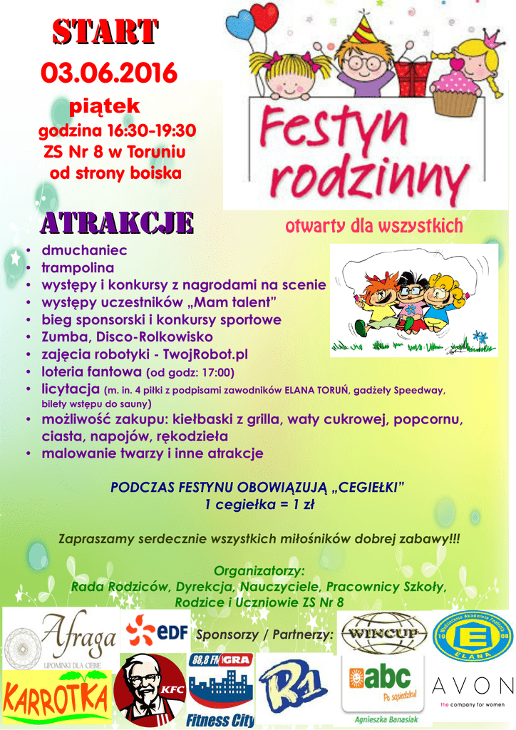 START 03.06.2016 piątek godzina 16:30-19:30 ZS Nr 8 w Toruniu od strony boiska ATRAKCJE • • • • • • • • • otwarty dla wszystkich dmuchaniec trampolina występy i konkursy z nagrodami na scenie występy uczestników „Mam talent” bieg sponsorski i konkursy sportowe Zumba, Disco-Rolkowisko zajęcia robotyki - TwojRobot.pl loteria fantowa (od godz: 17:00) licytacja (m. in. 4 piłki z podpisami zawodników ELANA TORUŃ, gadżety Speedway, bilety wstępu do sauny) • możliwość zakupu: kiełbaski z grilla, waty cukrowej, popcornu, ciasta, napojów, rękodzieła • malowanie twarzy i inne atrakcje PODCZAS FESTYNU OBOWIĄZUJĄ „CEGIEŁKI” 1 cegiełka = 1 zł Zapraszamy serdecznie wszystkich miłośników dobrej zabawy!!! Organizatorzy: Rada Rodziców, Dyrekcja, Nauczyciele, Pracownicy Szkoły, Rodzice i Uczniowie ZS Nr 8 Sponsorzy / Partnerzy: