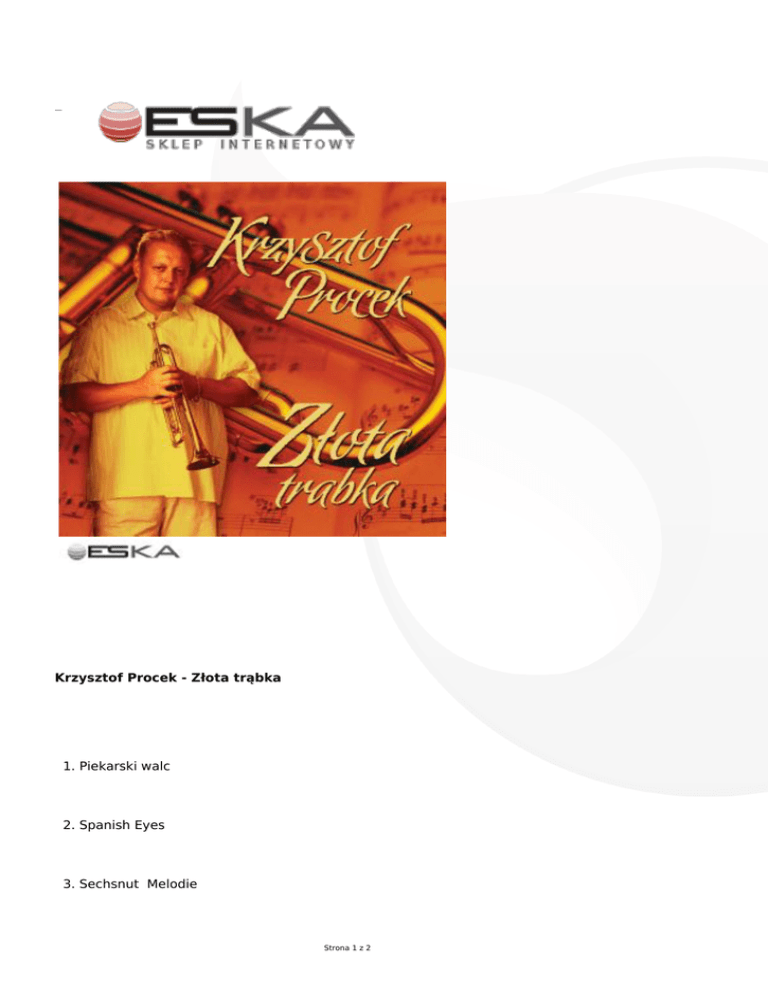 Krzysztof Procek - Złota trąbka 1. Piekarski walc 2. Spanish Eyes 3. Sechsnut Melodie Strona 1 z 2 4. Auf der Autobahn 5. Cucurucu Paloma 6. My way 7. Singing in the rain 8. Tijuna taxi 9. Speak softly love 10. Capri Fisher 11. Quando quando 12. Last waltz 13. Stimung medley 14. Wonderful world 15. Amazing Grace 16. Ave Maria Strona 2 z 2