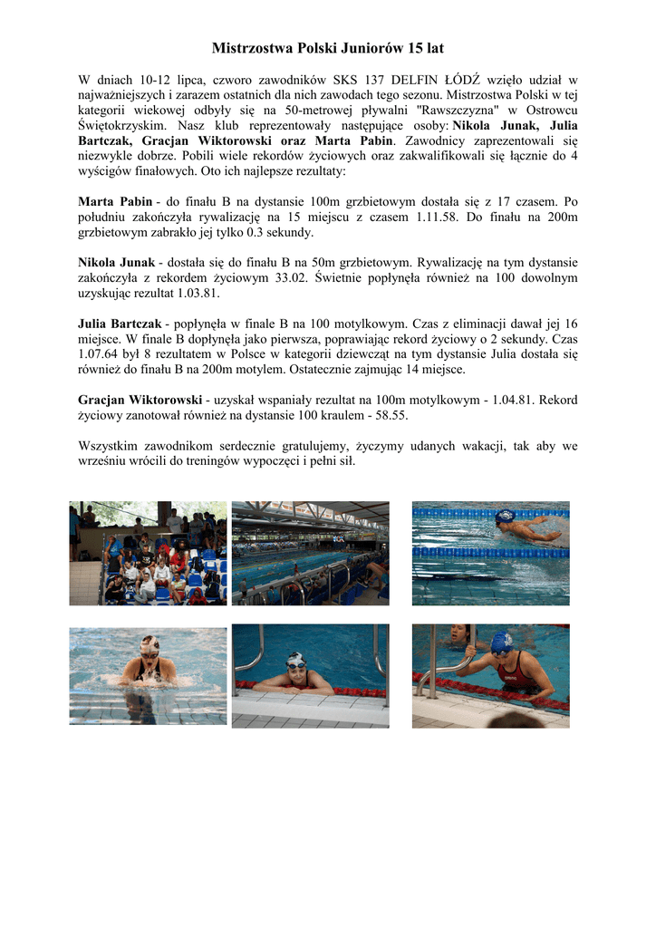 Mistrzostwa Polski Juniorów 15 lat W dniach 10-12 lipca, czworo zawodników SKS 137 DELFIN ŁÓDŹ wzięło udział w najważniejszych i zarazem ostatnich dla nich zawodach tego sezonu. Mistrzostwa Polski w tej kategorii wiekowej odbyły się na 50-metrowej pływalni ''Rawszczyzna" w Ostrowcu Świętokrzyskim. Nasz klub reprezentowały następujące osoby: Nikola Junak, Julia Bartczak, Gracjan Wiktorowski oraz Marta Pabin. Zawodnicy zaprezentowali się niezwykle dobrze. Pobili wiele rekordów życiowych oraz zakwalifikowali się łącznie do 4 wyścigów finałowych. Oto ich najlepsze rezultaty: Marta Pabin - do finału B na dystansie 100m grzbietowym dostała się z 17 czasem. Po południu zakończyła rywalizację na 15 miejscu z czasem 1.11.58. Do finału na 200m grzbietowym zabrakło jej tylko 0.3 sekundy. Nikola Junak - dostała się do finału B na 50m grzbietowym. Rywalizację na tym dystansie zakończyła z rekordem życiowym 33.02. Świetnie popłynęła również na 100 dowolnym uzyskując rezultat 1.03.81. Julia Bartczak - popłynęła w finale B na 100 motylkowym. Czas z eliminacji dawał jej 16 miejsce. W finale B dopłynęła jako pierwsza, poprawiając rekord życiowy o 2 sekundy. Czas 1.07.64 był 8 rezultatem w Polsce w kategorii dziewcząt na tym dystansie Julia dostała się również do finału B na 200m motylem. Ostatecznie zajmując 14 miejsce. Gracjan Wiktorowski - uzyskał wspaniały rezultat na 100m motylkowym - 1.04.81. Rekord życiowy zanotował również na dystansie 100 kraulem - 58.55. Wszystkim zawodnikom serdecznie gratulujemy, życzymy udanych wakacji, tak aby we wrześniu wrócili do treningów wypoczęci i pełni sił.